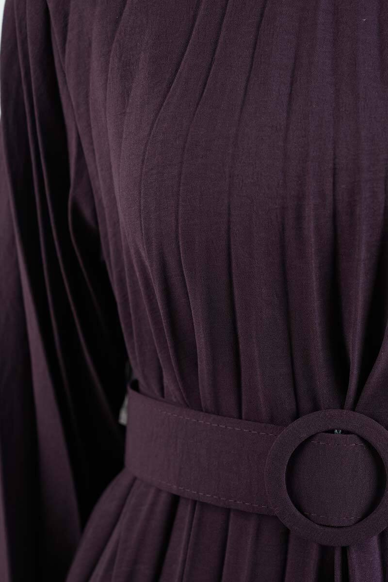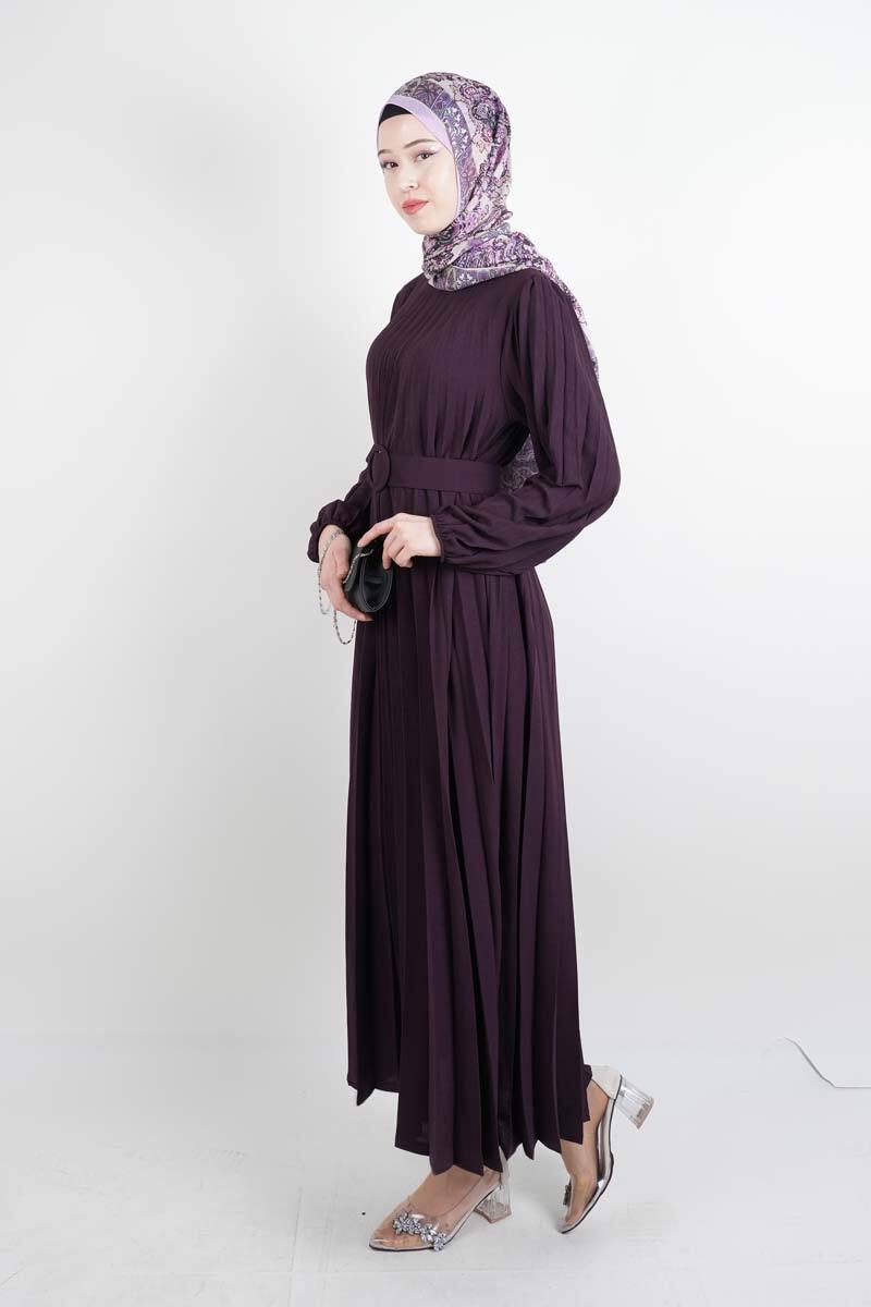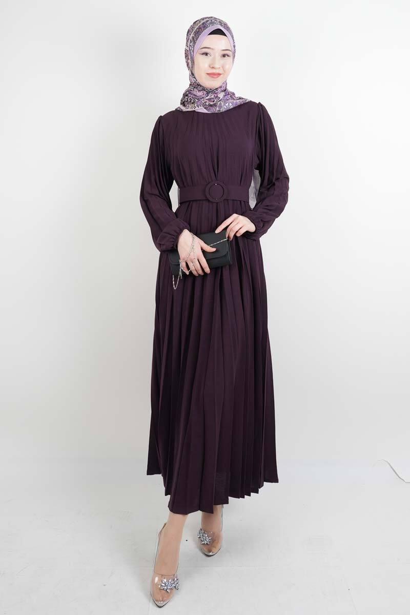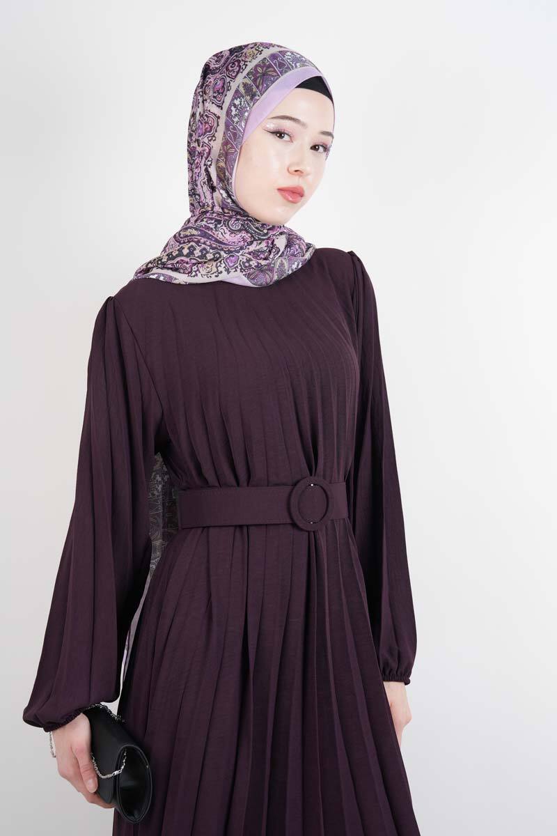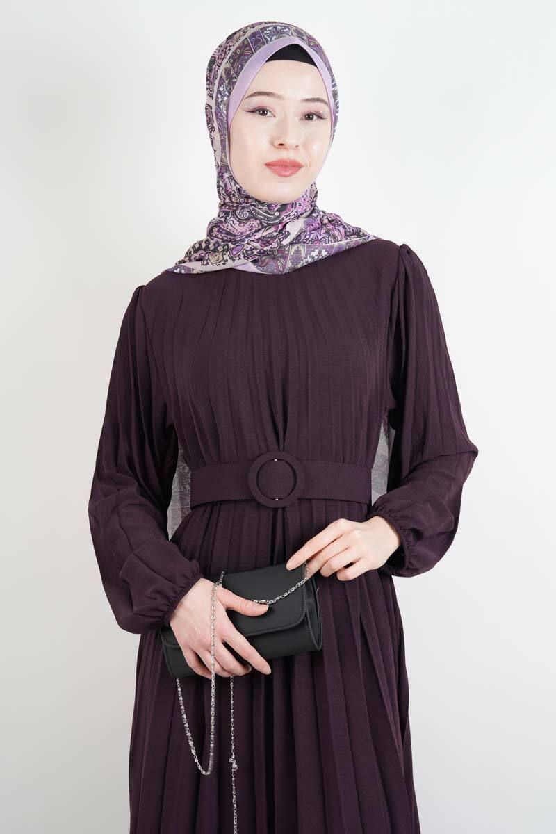 Ayrobin Elbise Kalın Kemerli Piliseli Elbise Mor