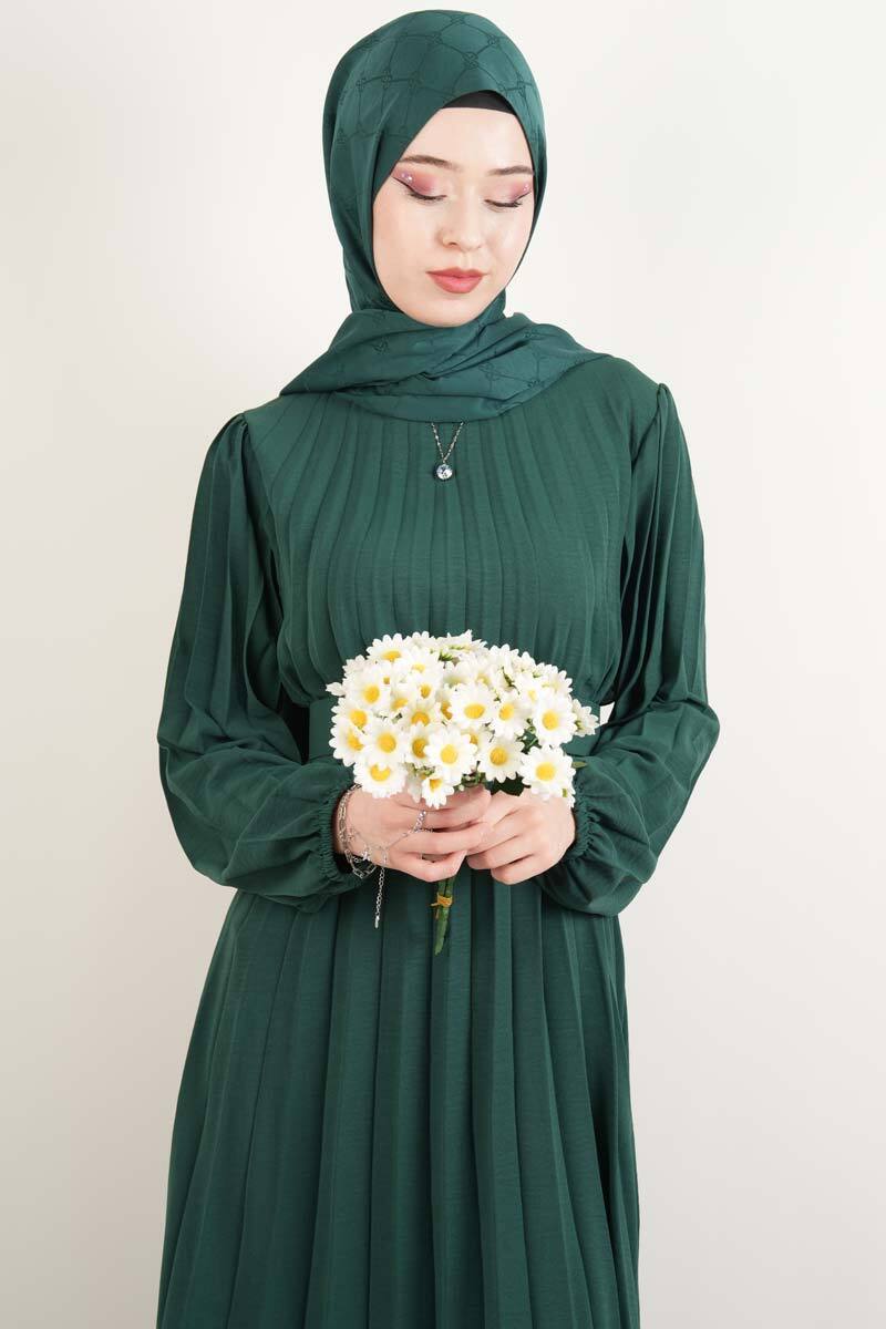 Doğanın huzurunu yansıtan yeşil tonlarıyla ayrobin kumaştan üretilmiş elbise, piliseli detayı ve kemeriyle modern bir şıklık sunar. Günlük kullanımda ve özel günlerde fark yaratmak isteyenler için ideal.
