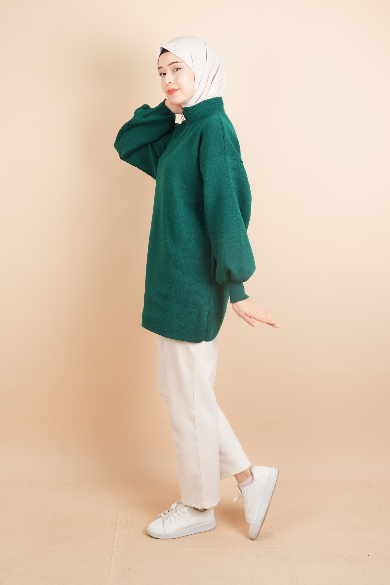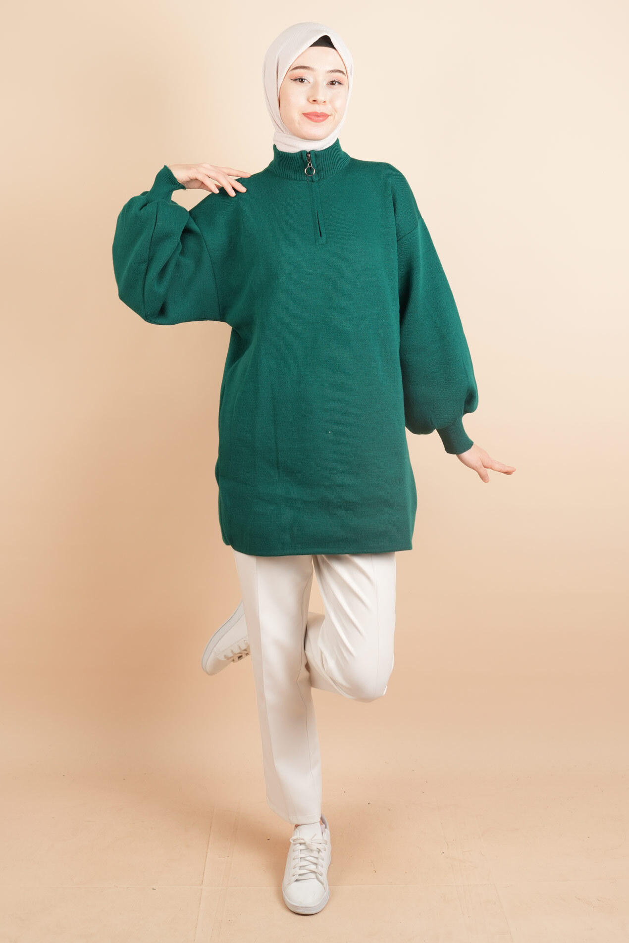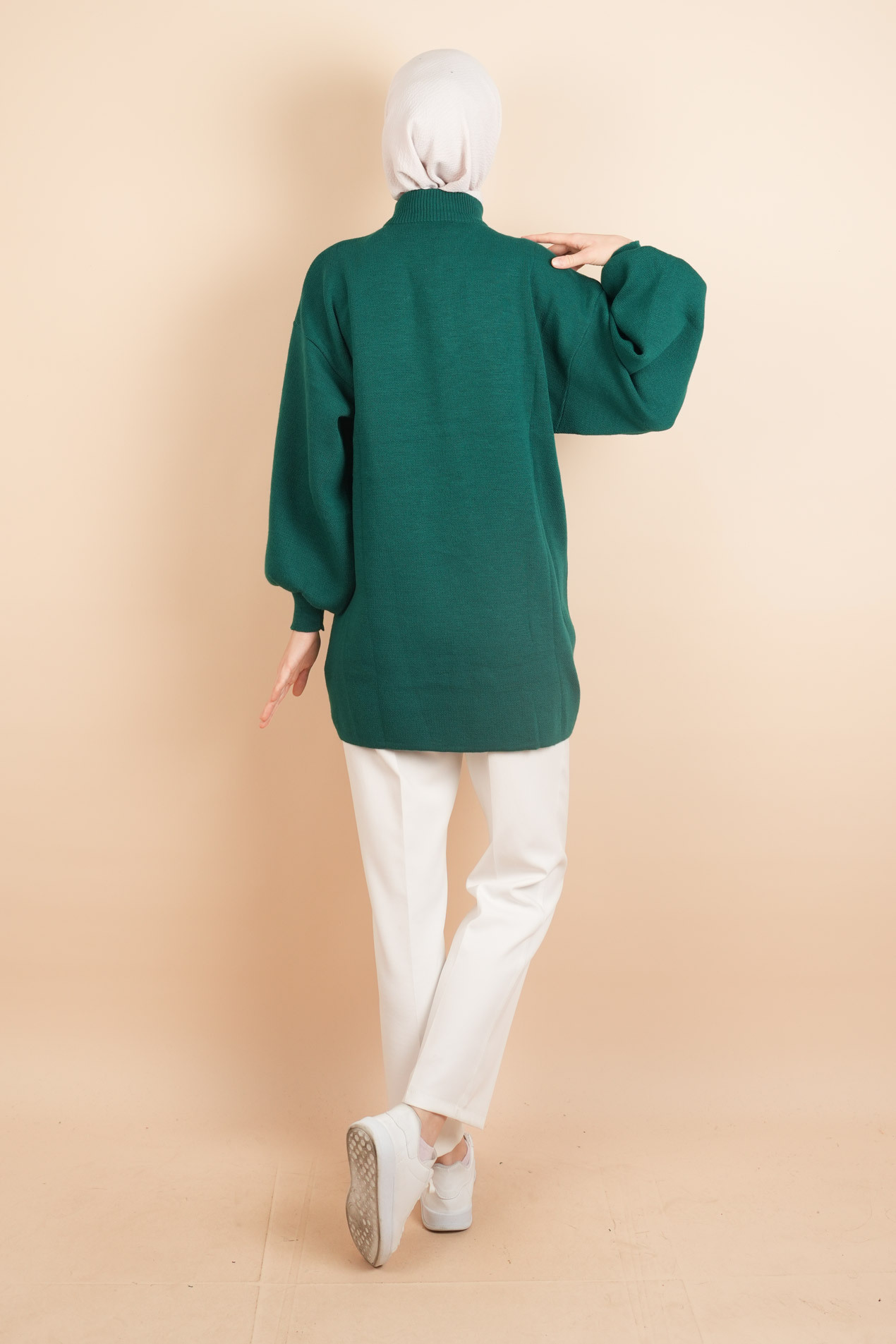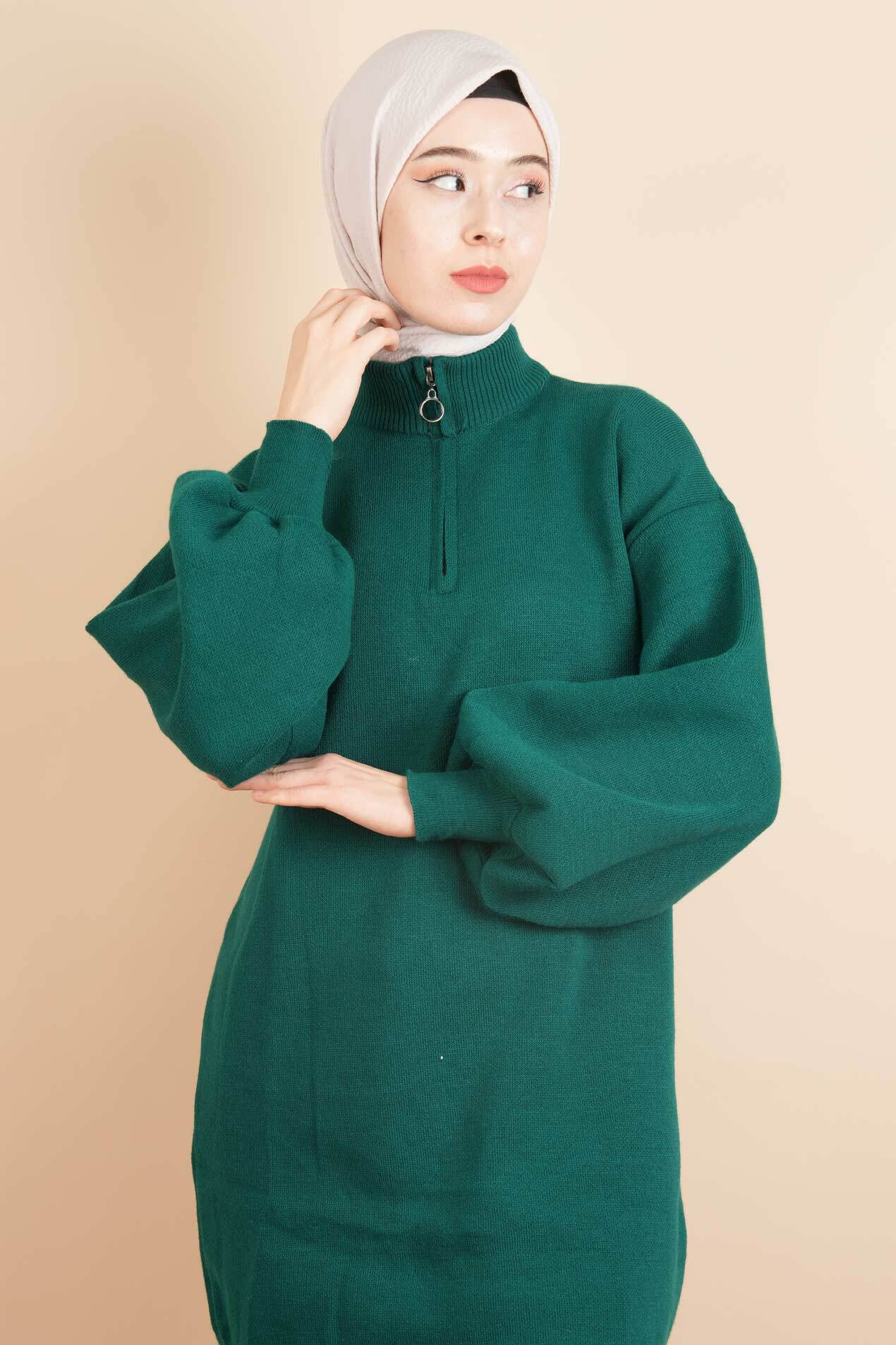 Balon Kol Düz Basic Hakim Yaka Fermuarlı Tunik Kazak Zümrüt