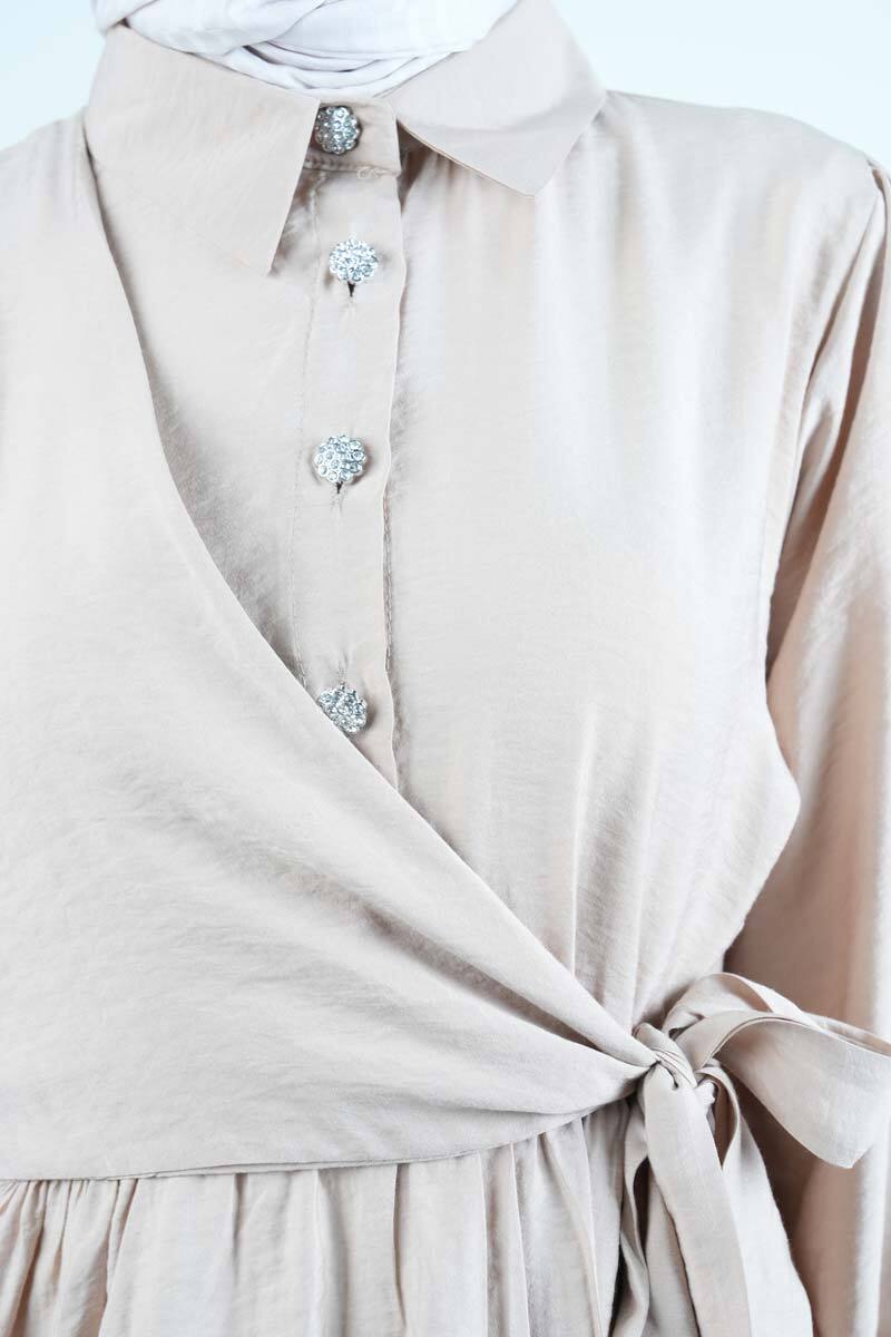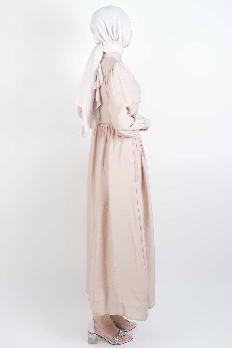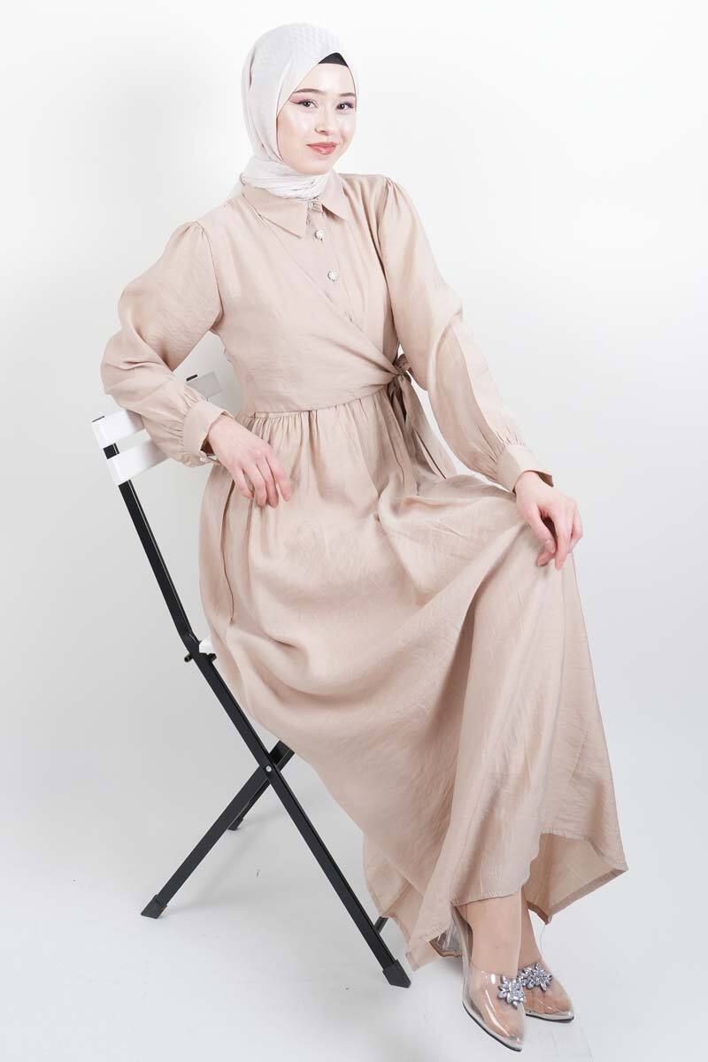 Krem rengiyle sade ve şık bir tarz yakalayan elmas düğmeli elbise, nefes alan kumaşı ve rahat kalıbıyla öne çıkar. Günlük şıklık için ideal.