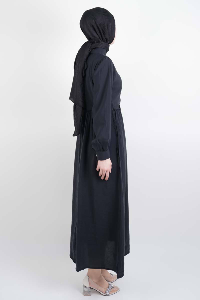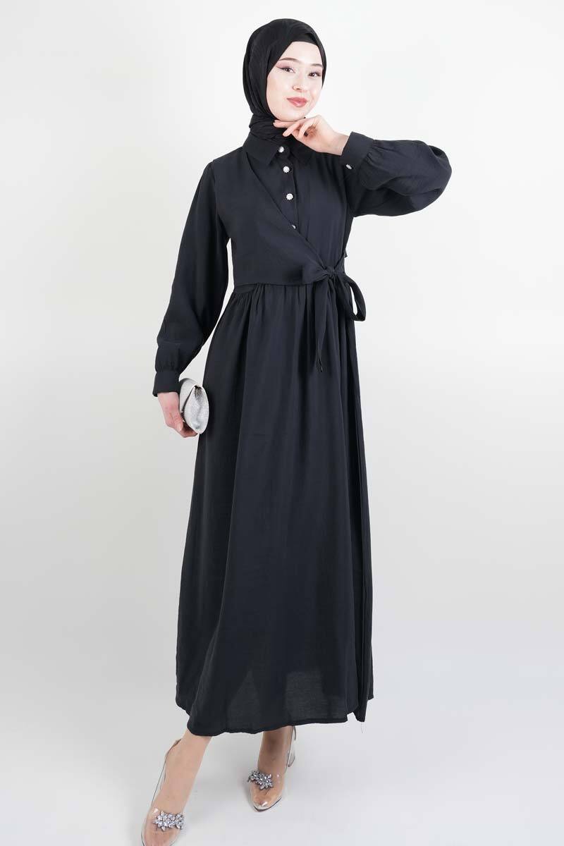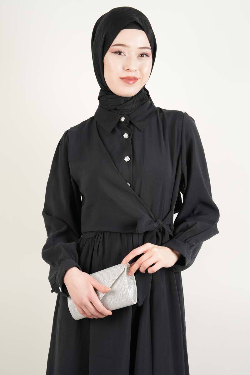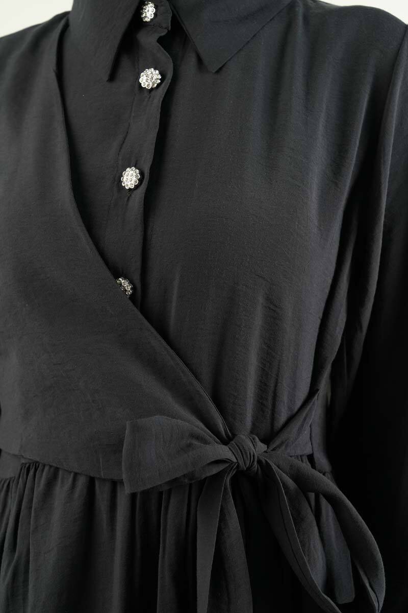 Siyahın asaleti ve elmas düğme detayları, bu elbiseyi hem klasik hem modern kombinler için vazgeçilmez yapar. Cupra modal kumaşıyla konfor sunar.