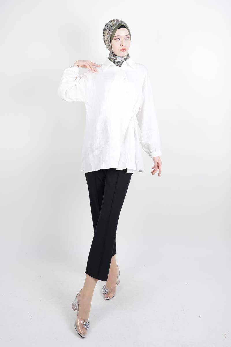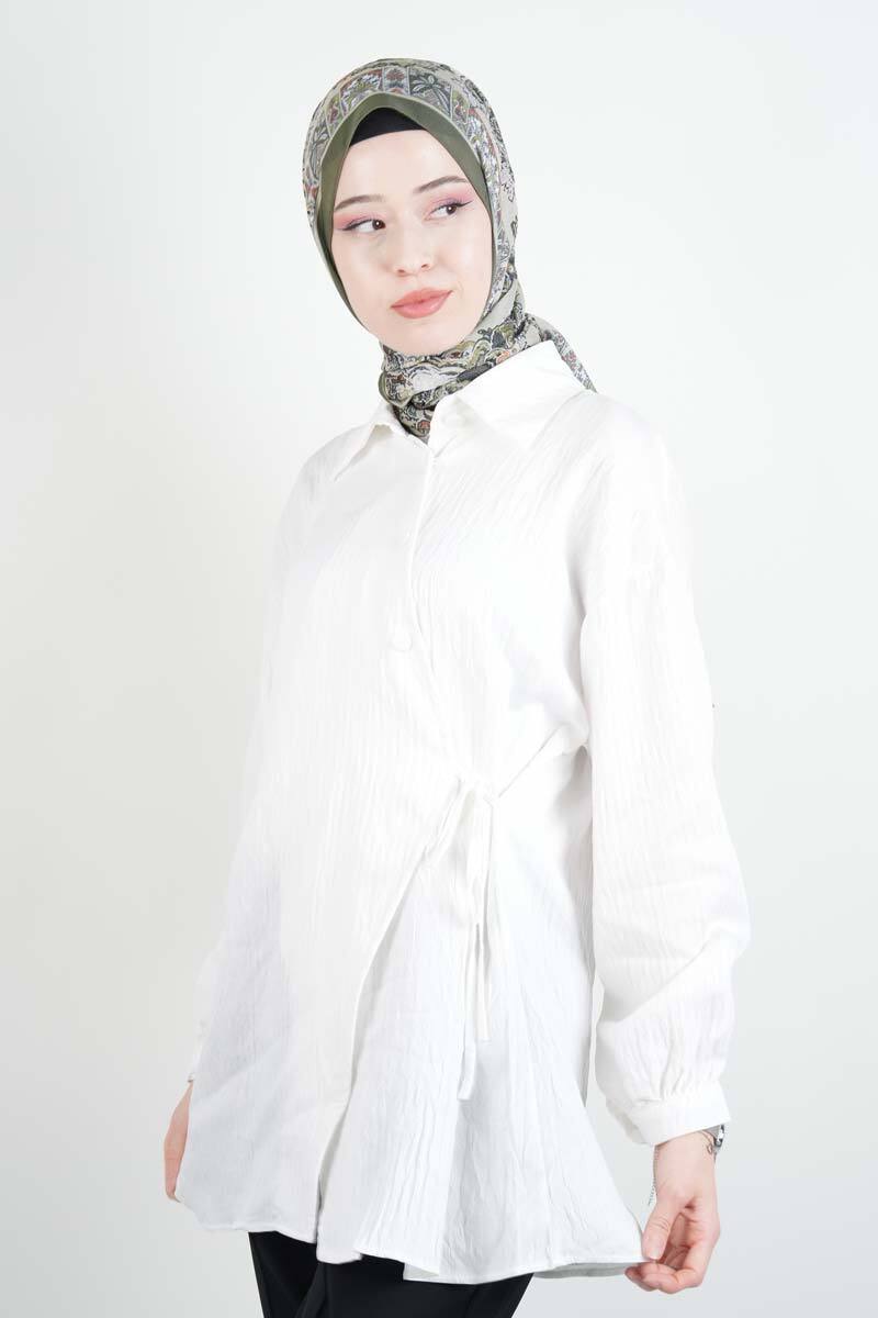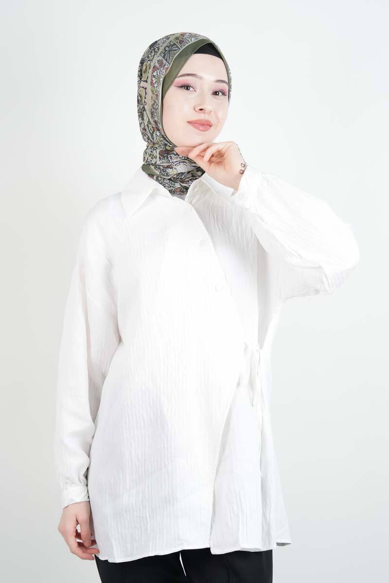 Bayan Gömlek Çapraz Düğmeli Yandan Bağlamalı Kimono Gömlek Beyaz