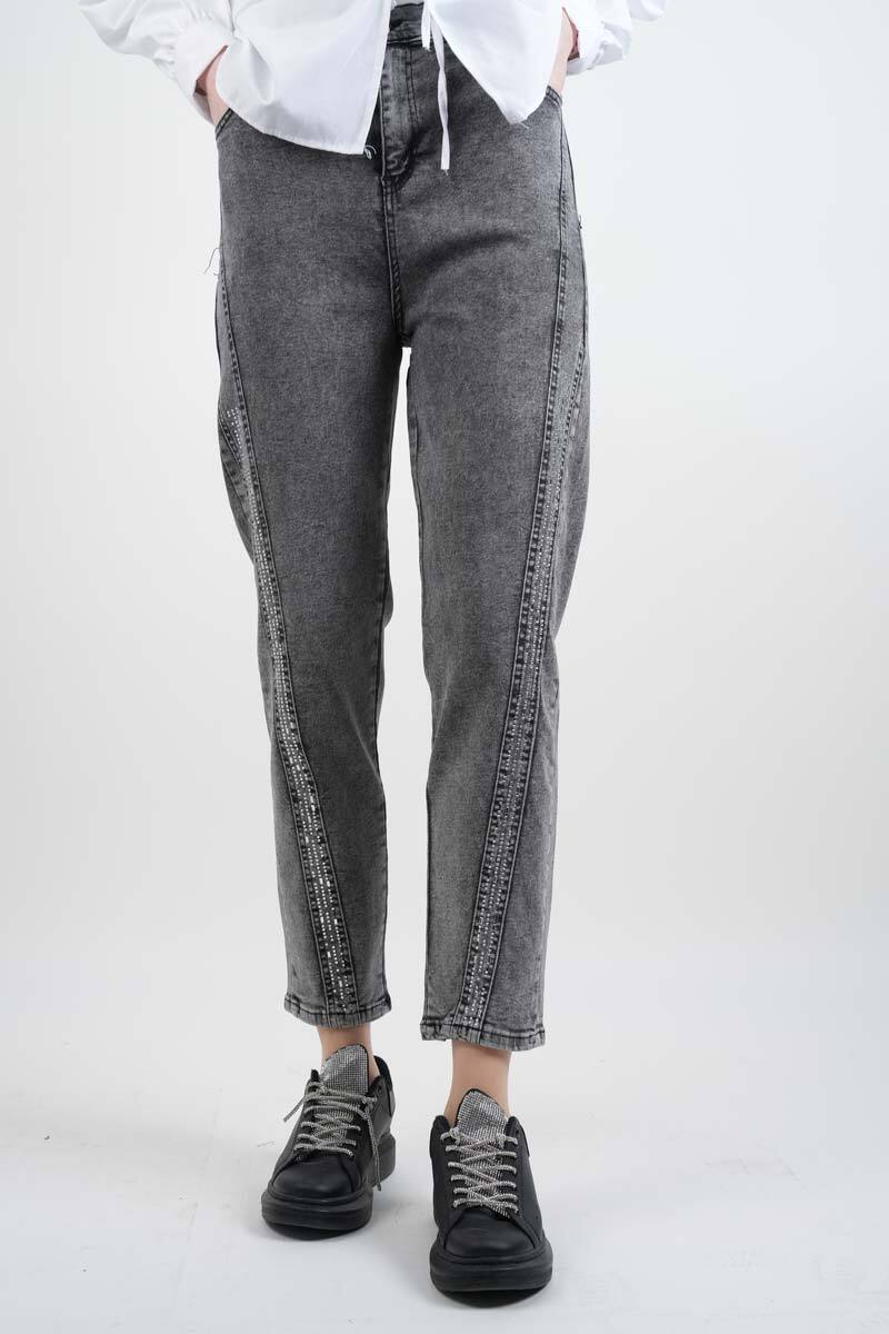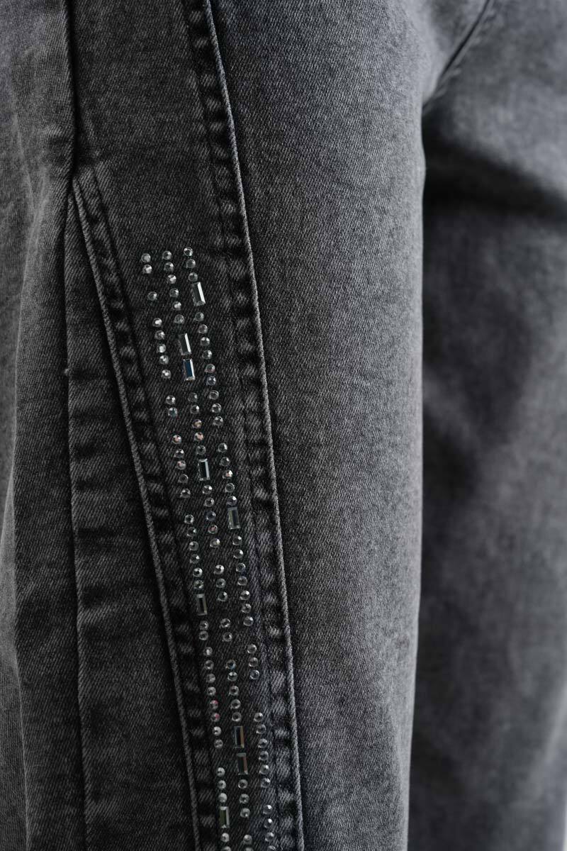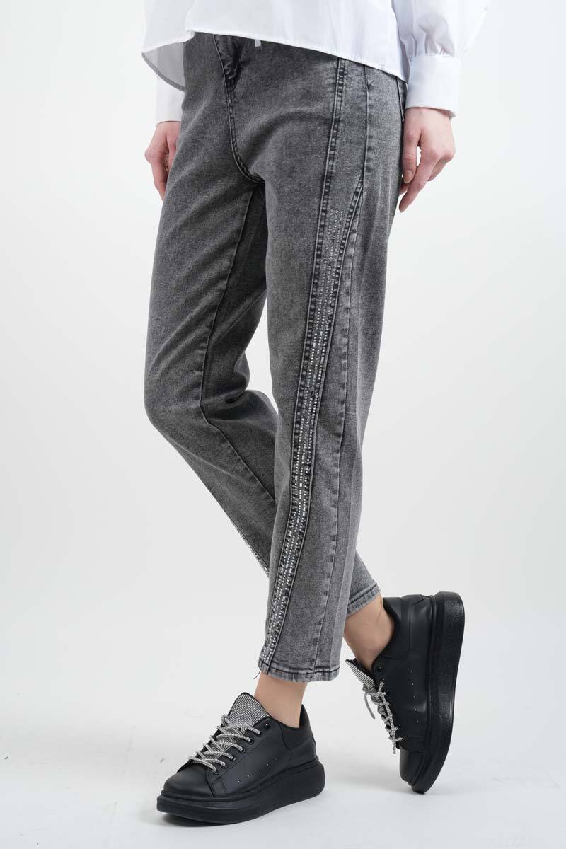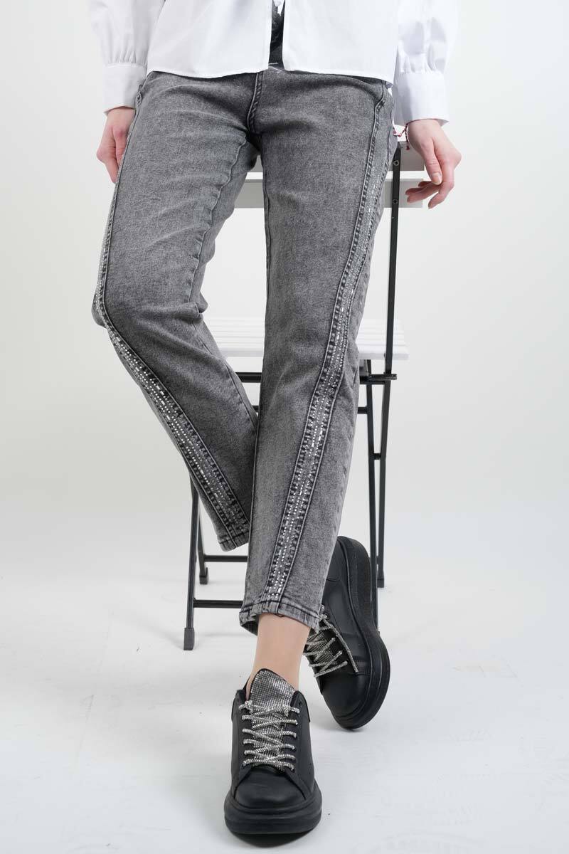 Açık gri baget taş detaylı denim pantolon, şık taş süreleriyle spor şıklığınızı tamamlar. Hem gündüz hem akşam kombinlerinde tercih edebilirsiniz.