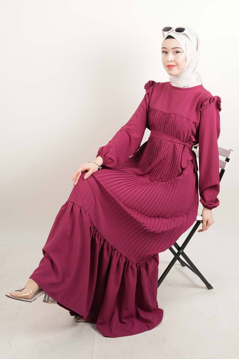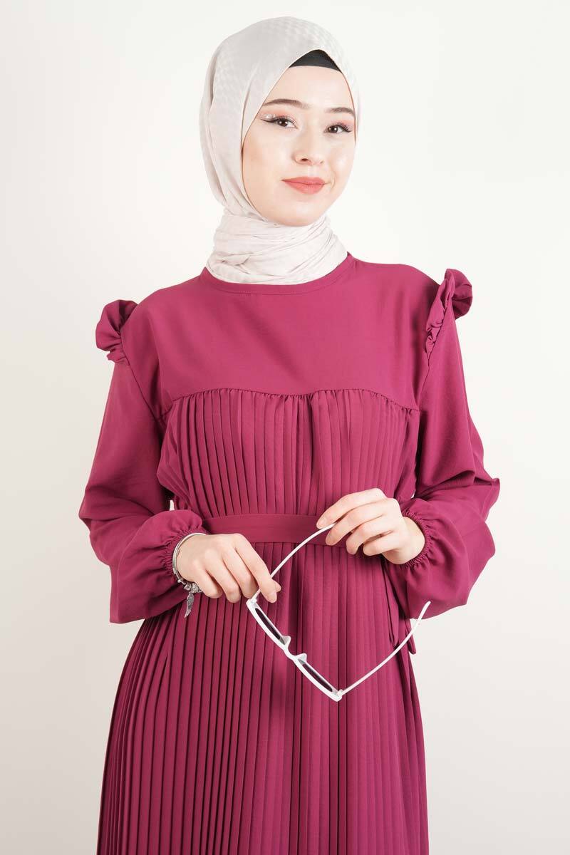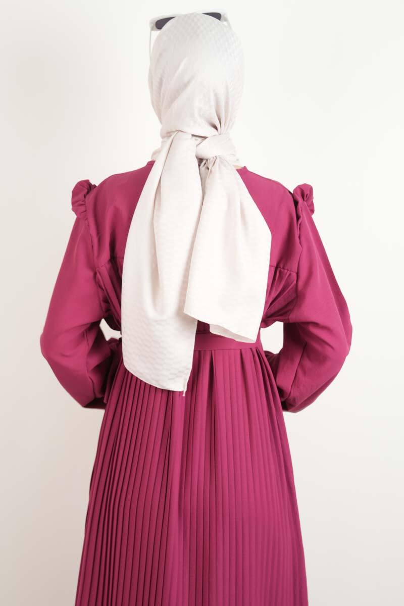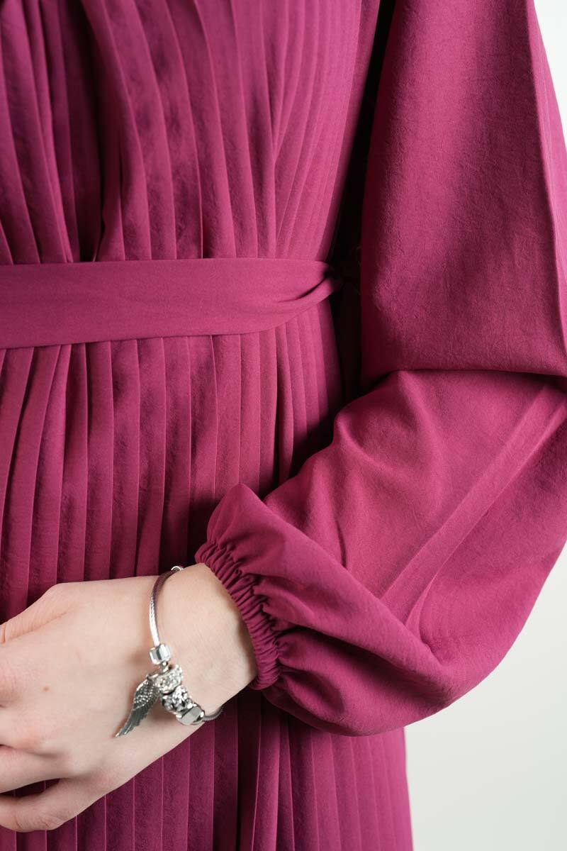 Fuşya modal elbise, ön piliseleri ve kol detaylarıyla enerjik ve iddialı kombinler için tasarlandı.