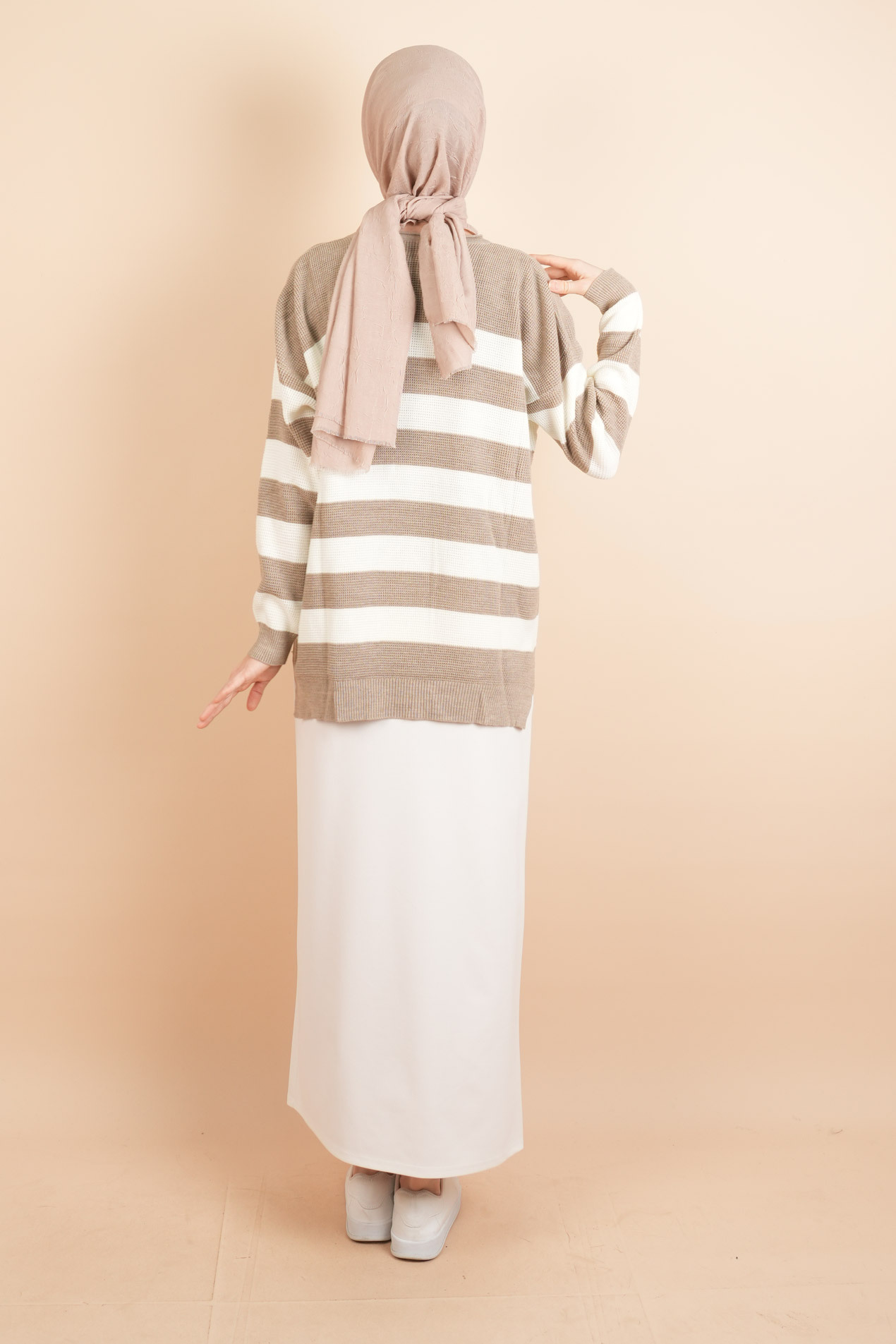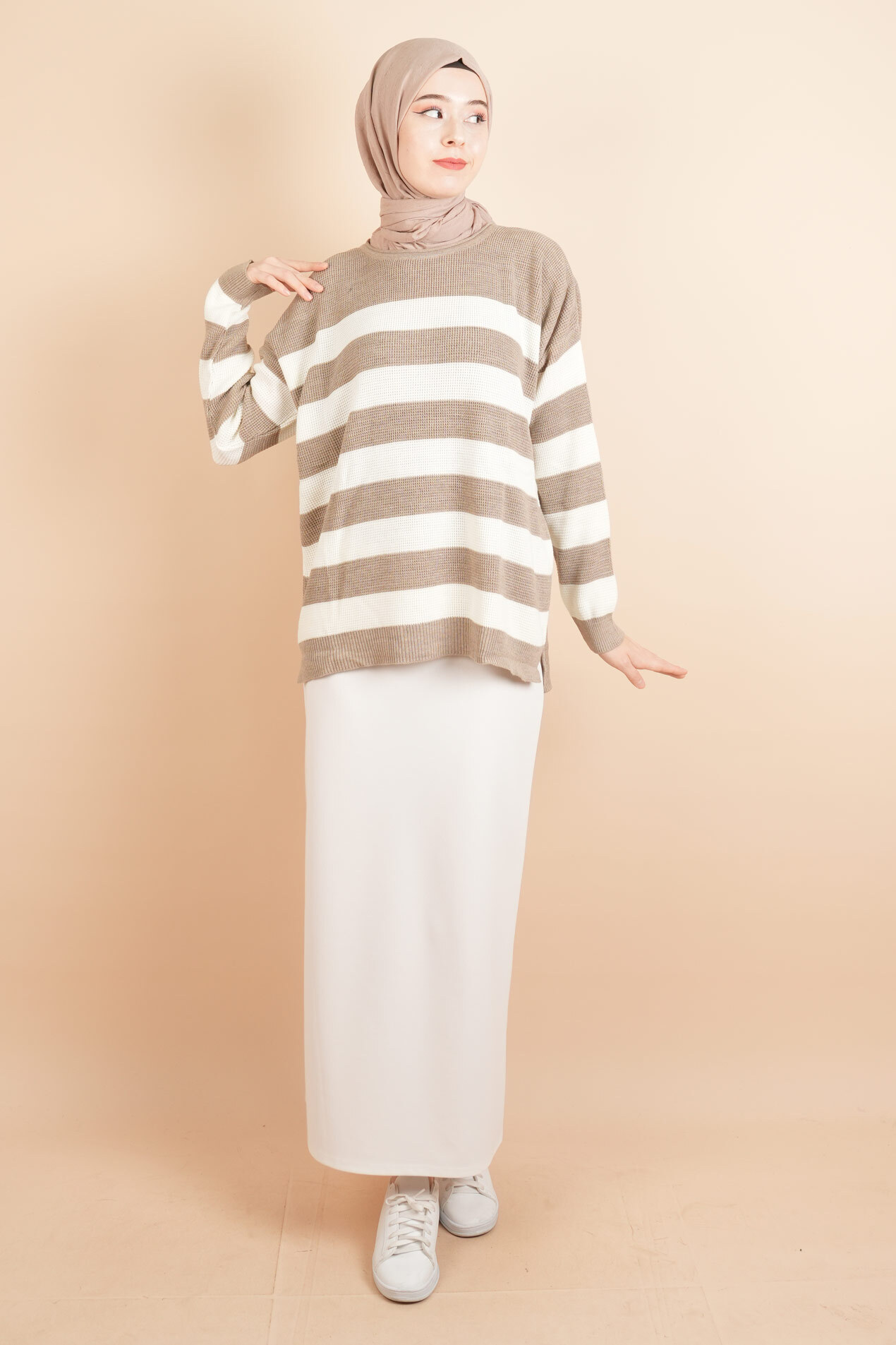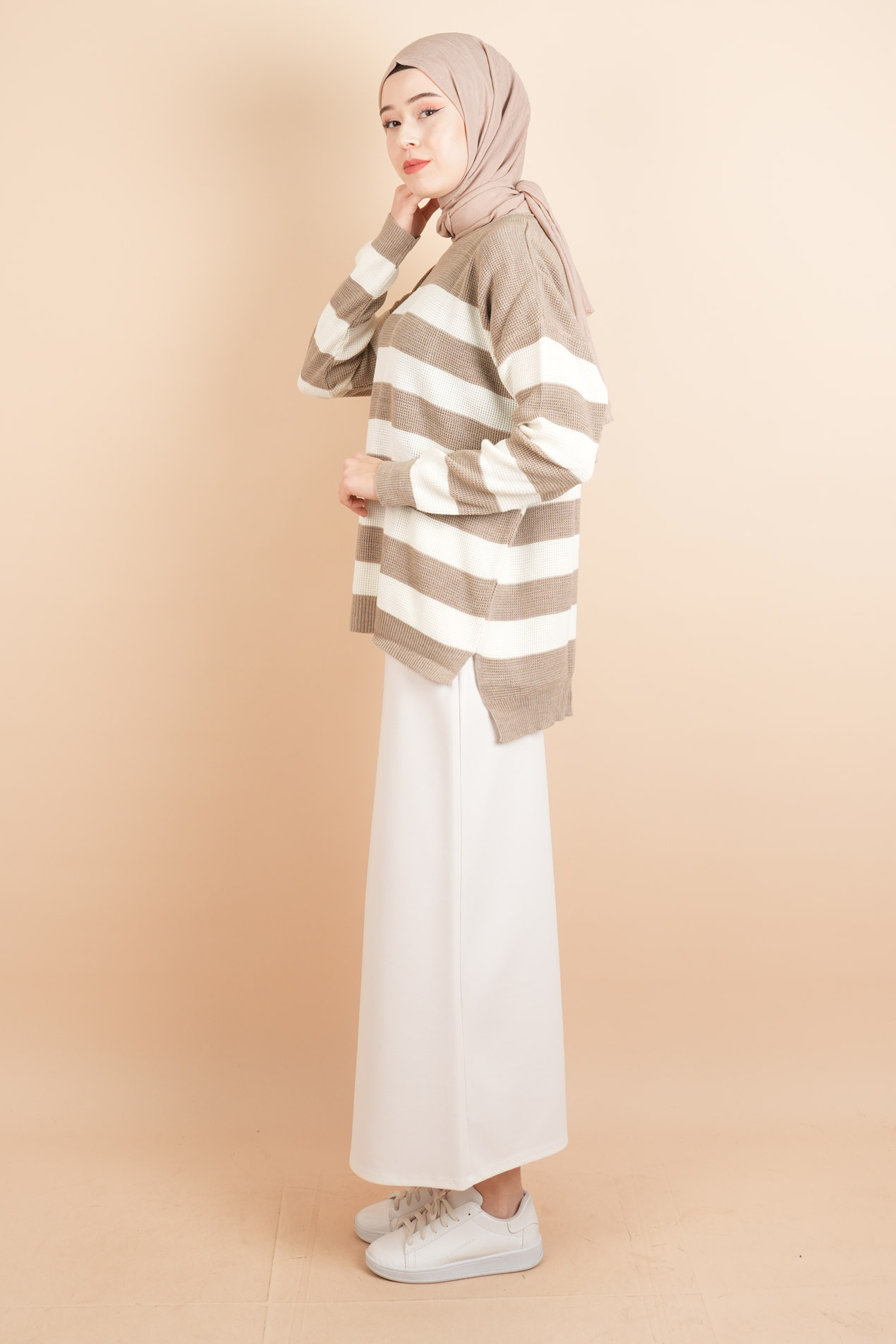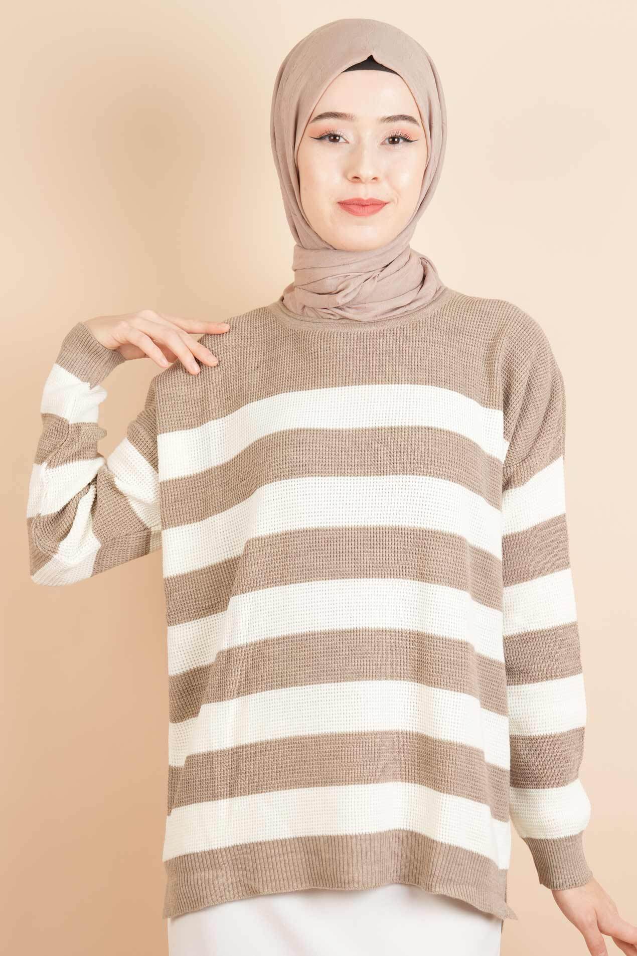 Bayan Tesettür Çizgili Prinç Örgü Kazak Açık Kahverengi