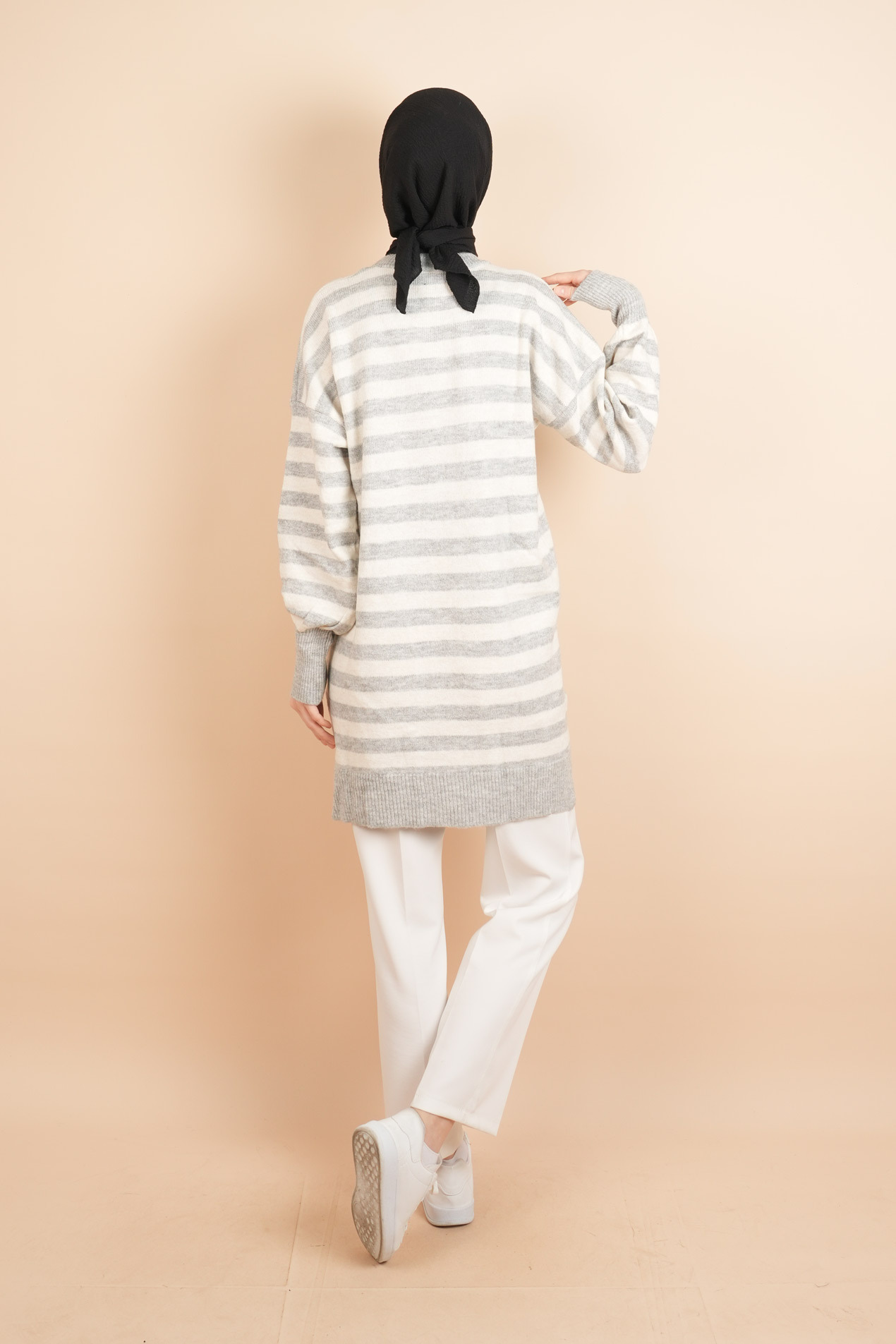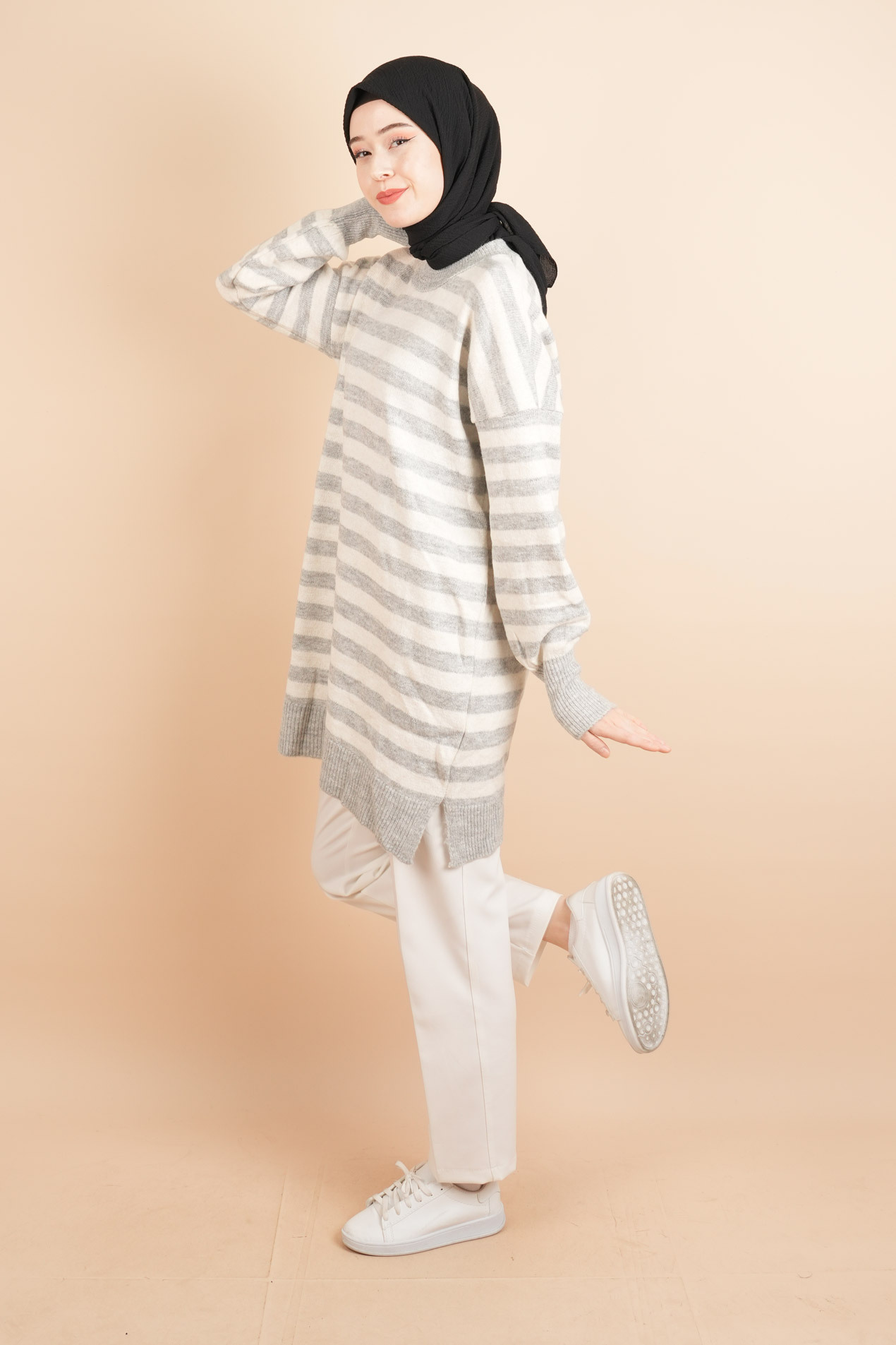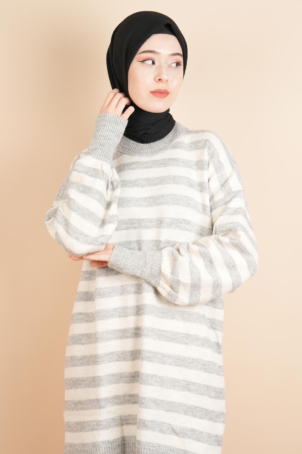 Bayan Tesettür Kazak Çizgili Yumoş Kazak Gri