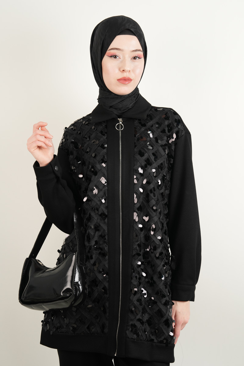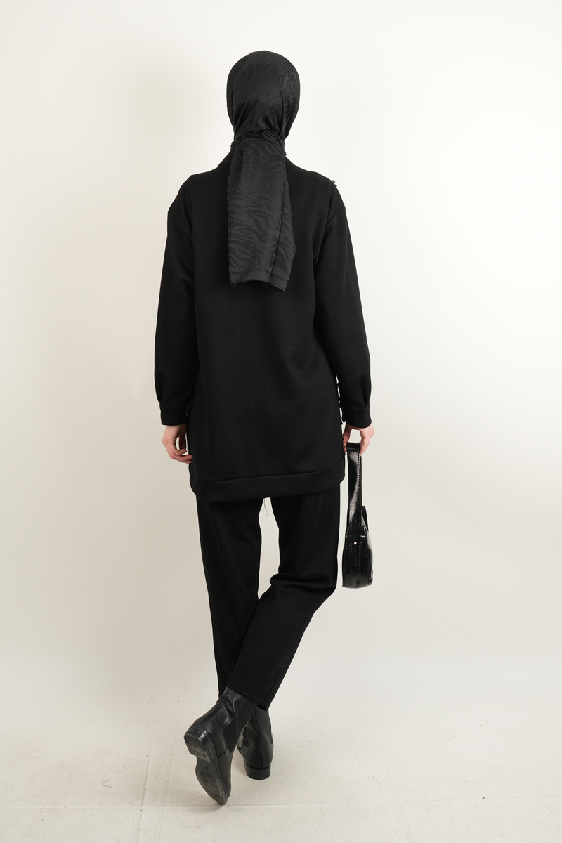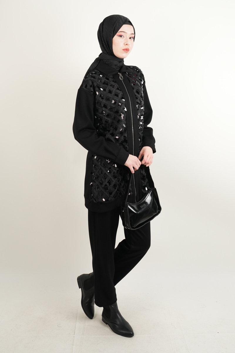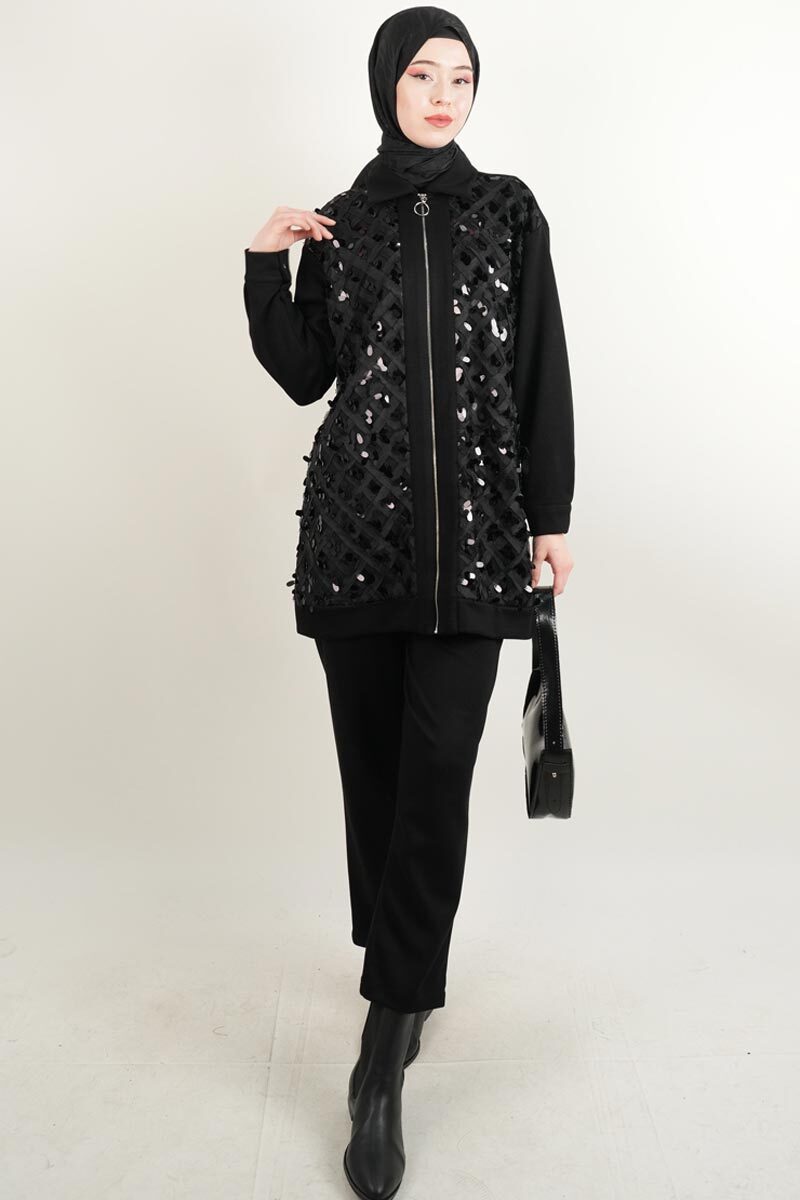 Zarif tül detaylarıyla hareketlenen bu siyah takım, sofistike bir görünüm sunarak hem günlük hem de özel günleriniz için mükemmel bir seçimdir.