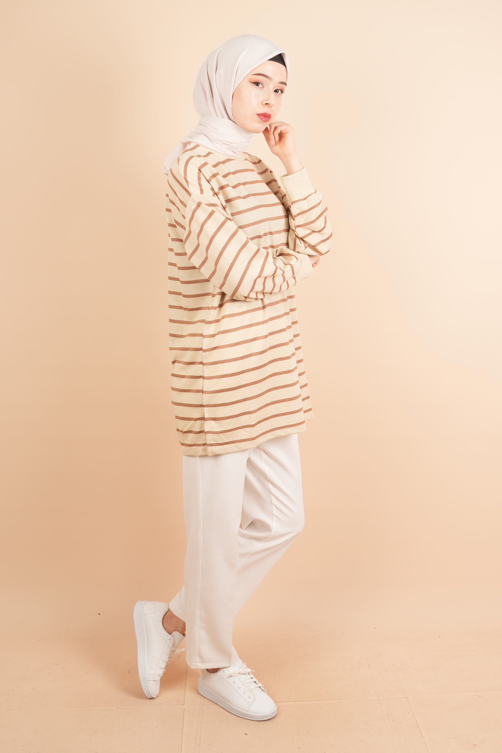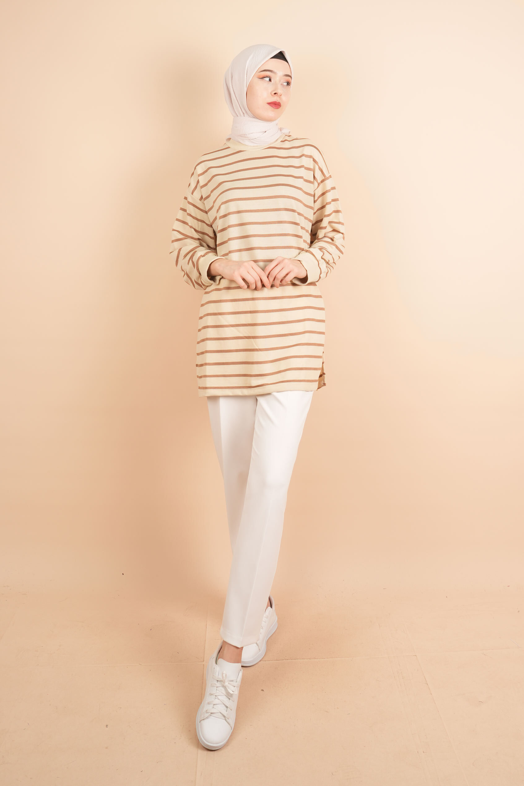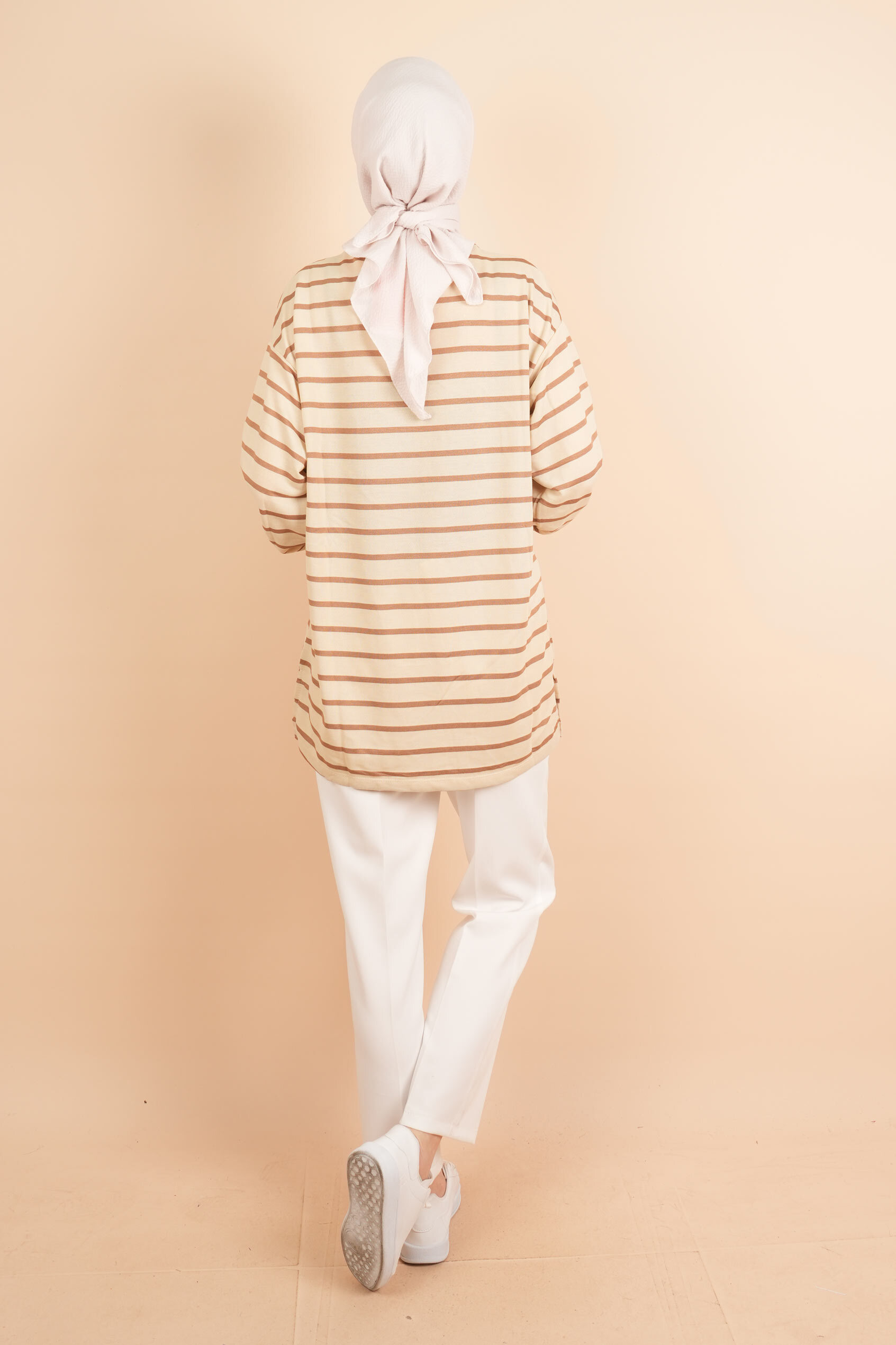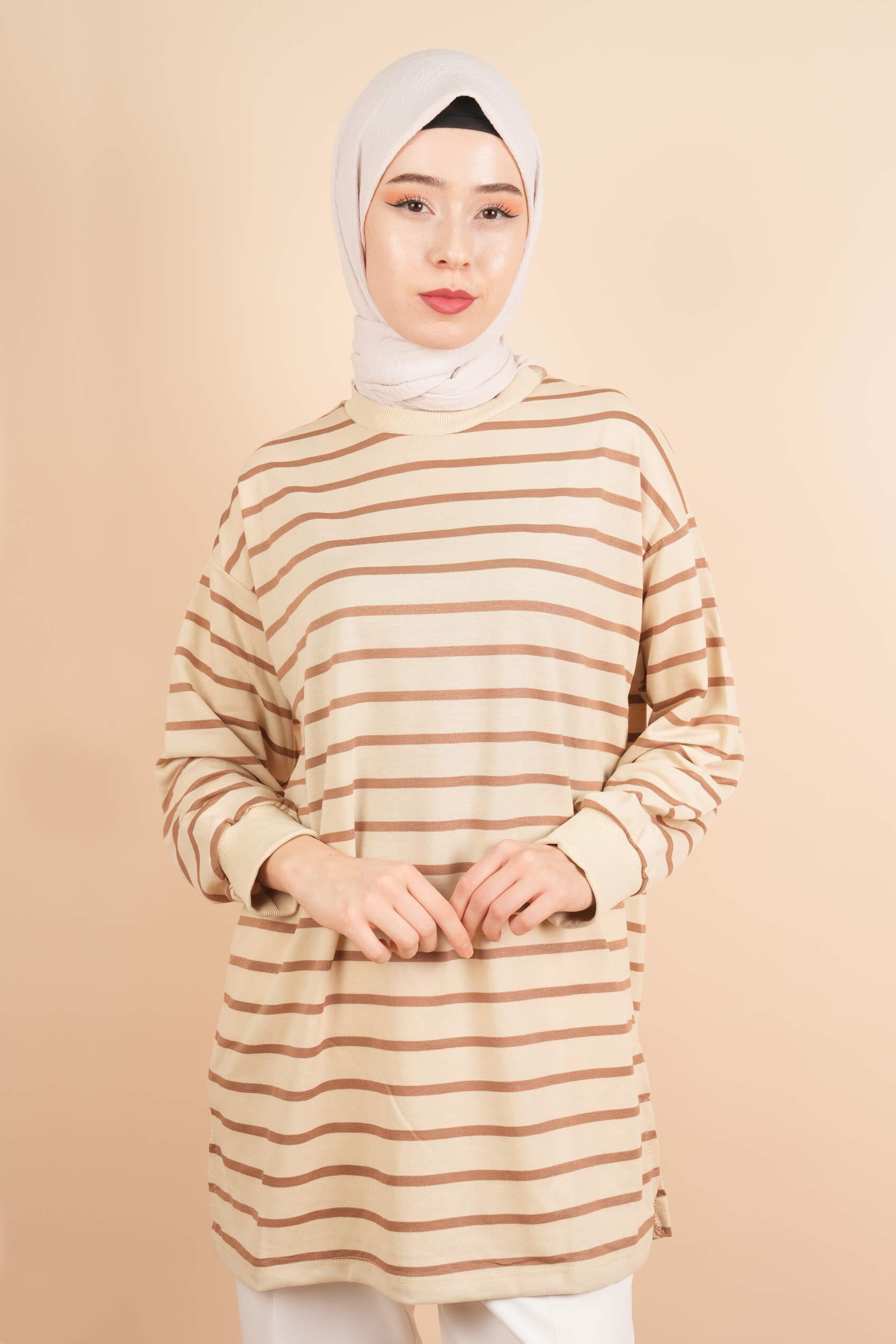 Bayan Uzun Tesettür Tunik Manşet Kol Çizgili Tunik Açık Kahve