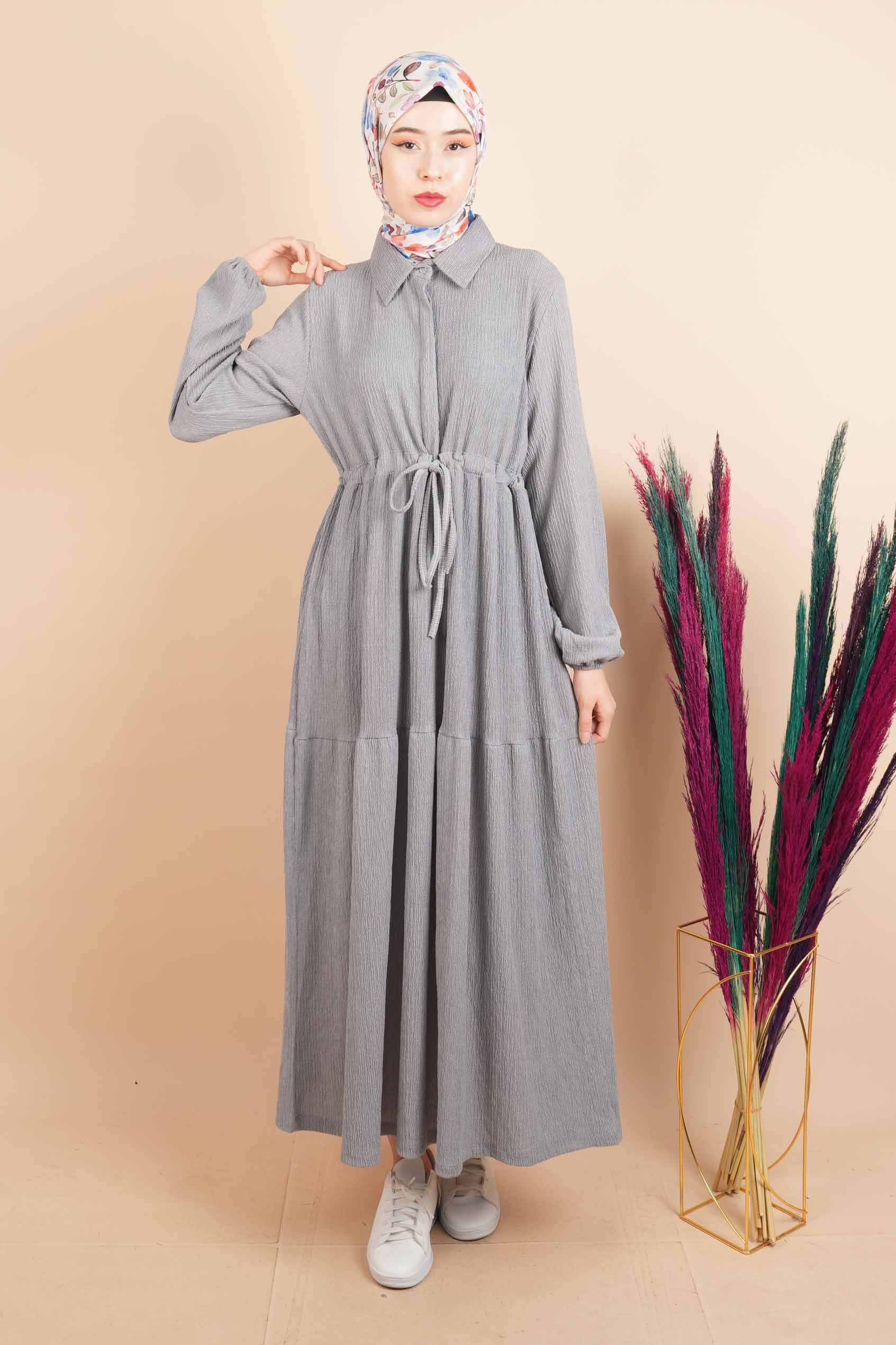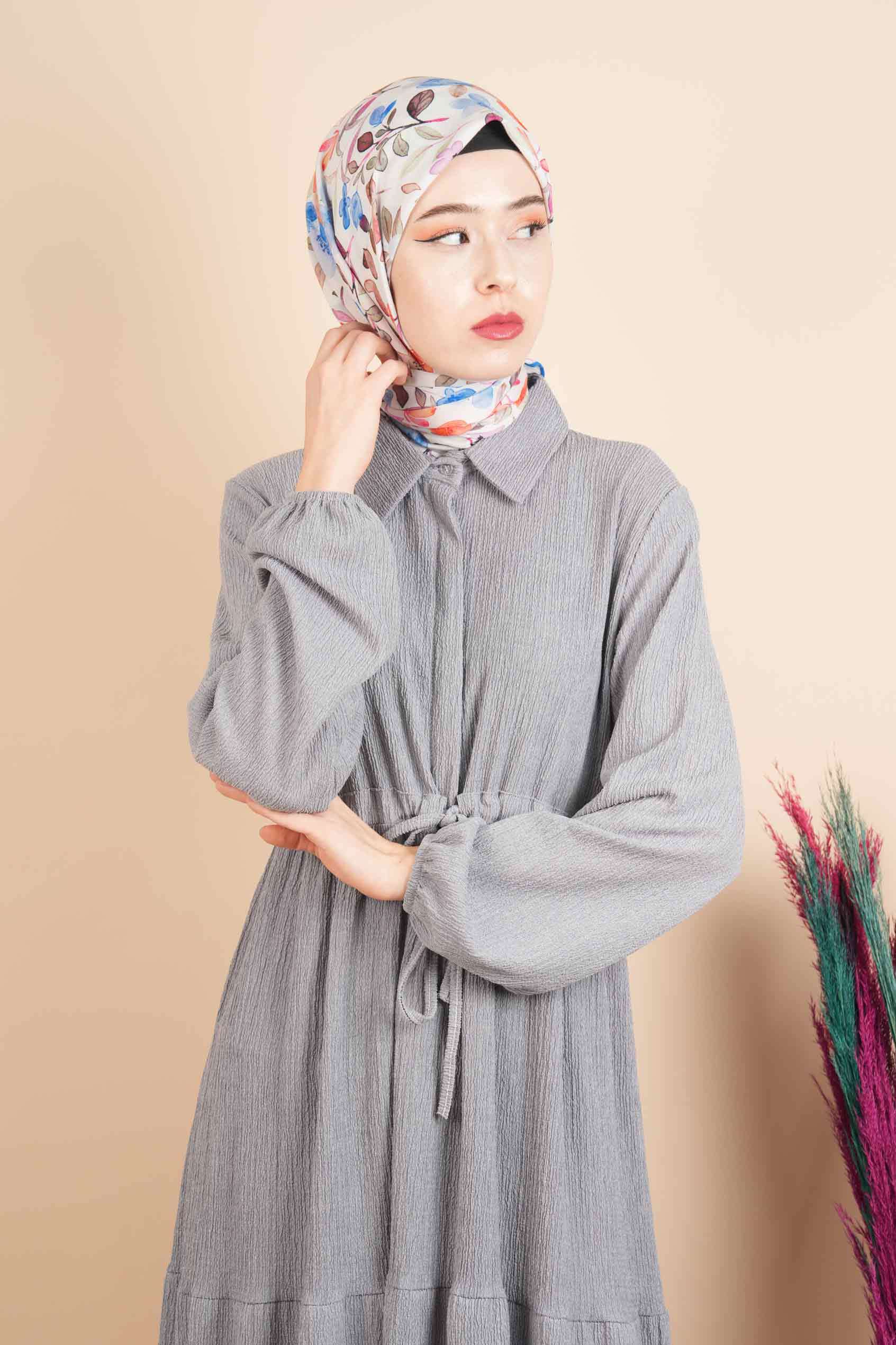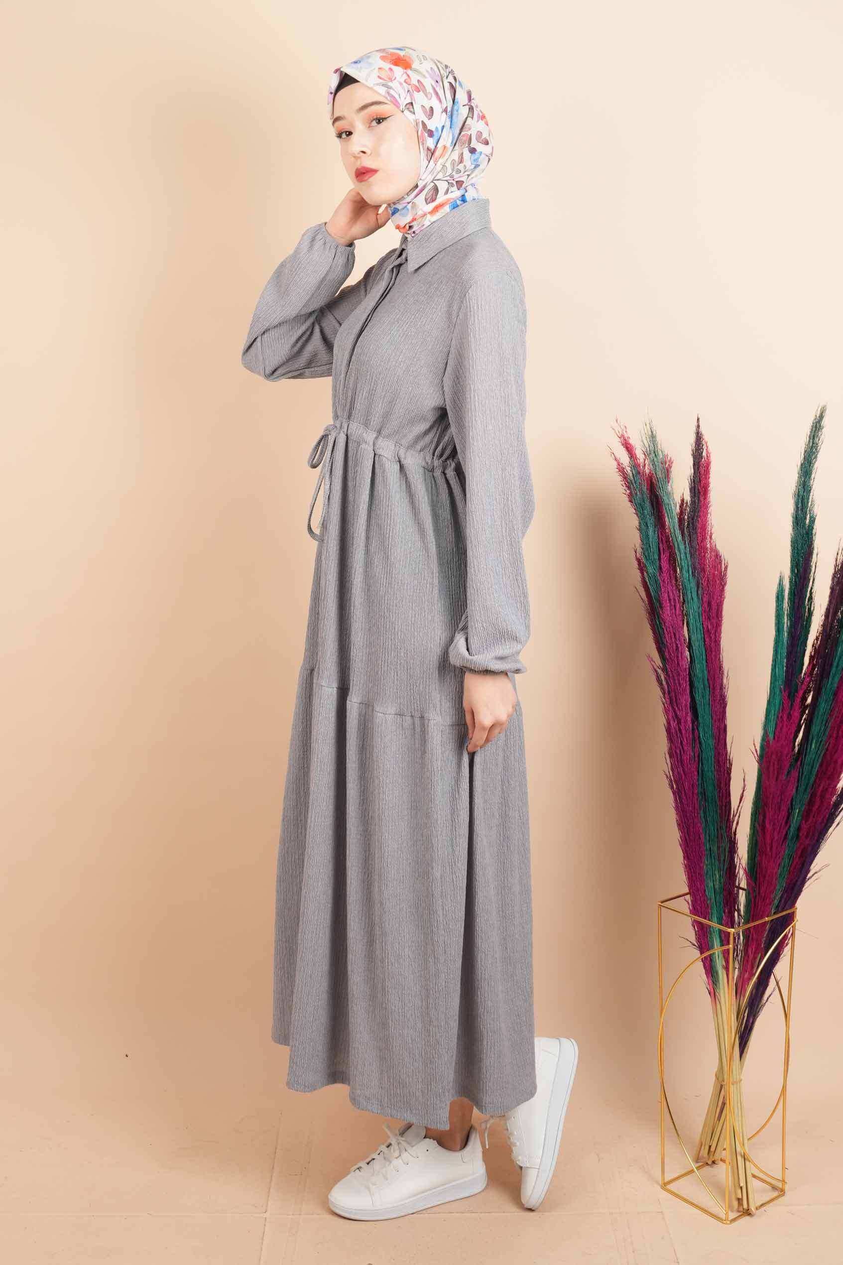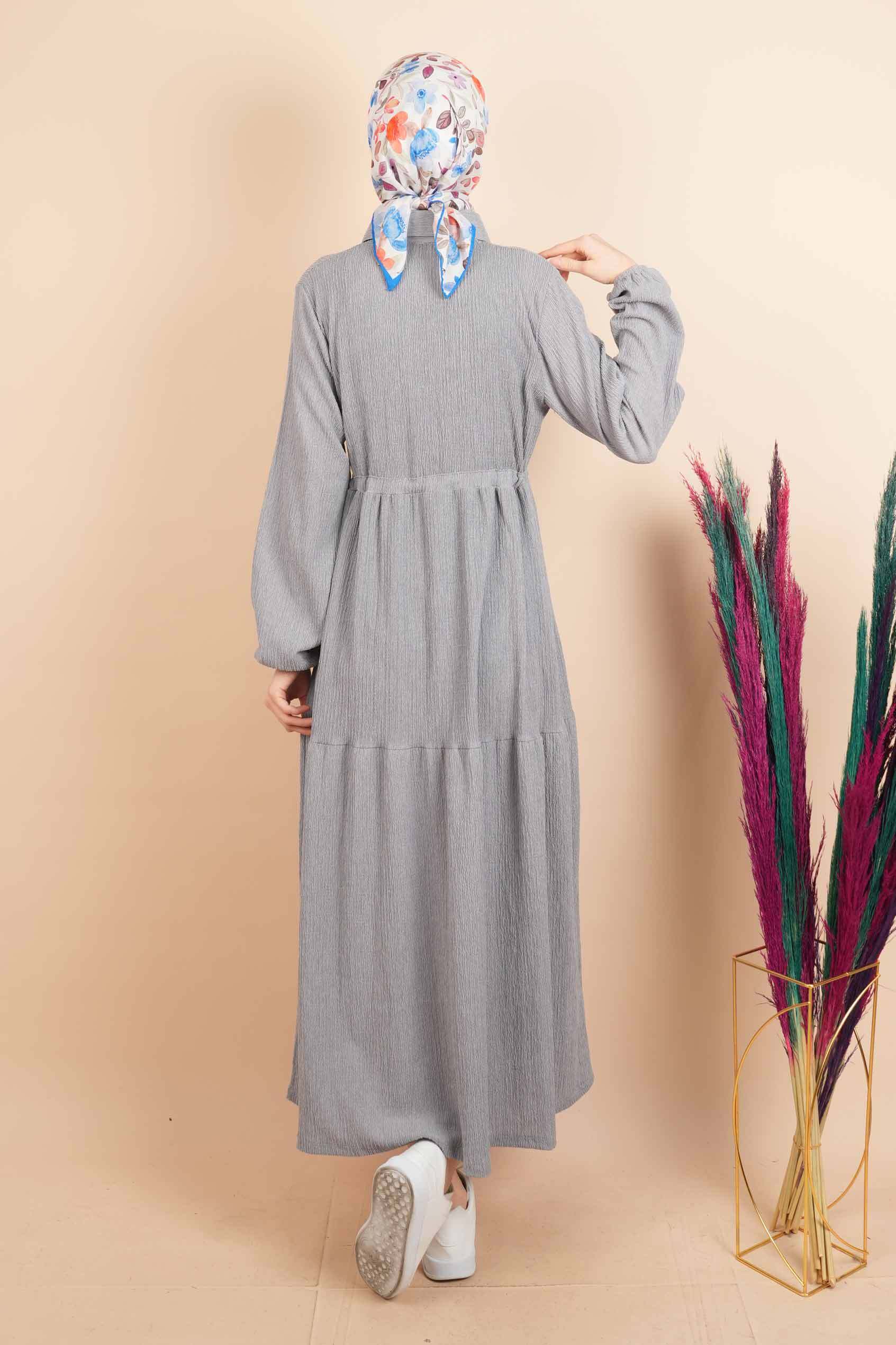 "Bürümcük tesettür elbise, gizli düğmeleri ve bel tünelli tasarımıyla zarif bir görünüm sunar. Hem günlük hem de özel günler için ideal bir seçim."