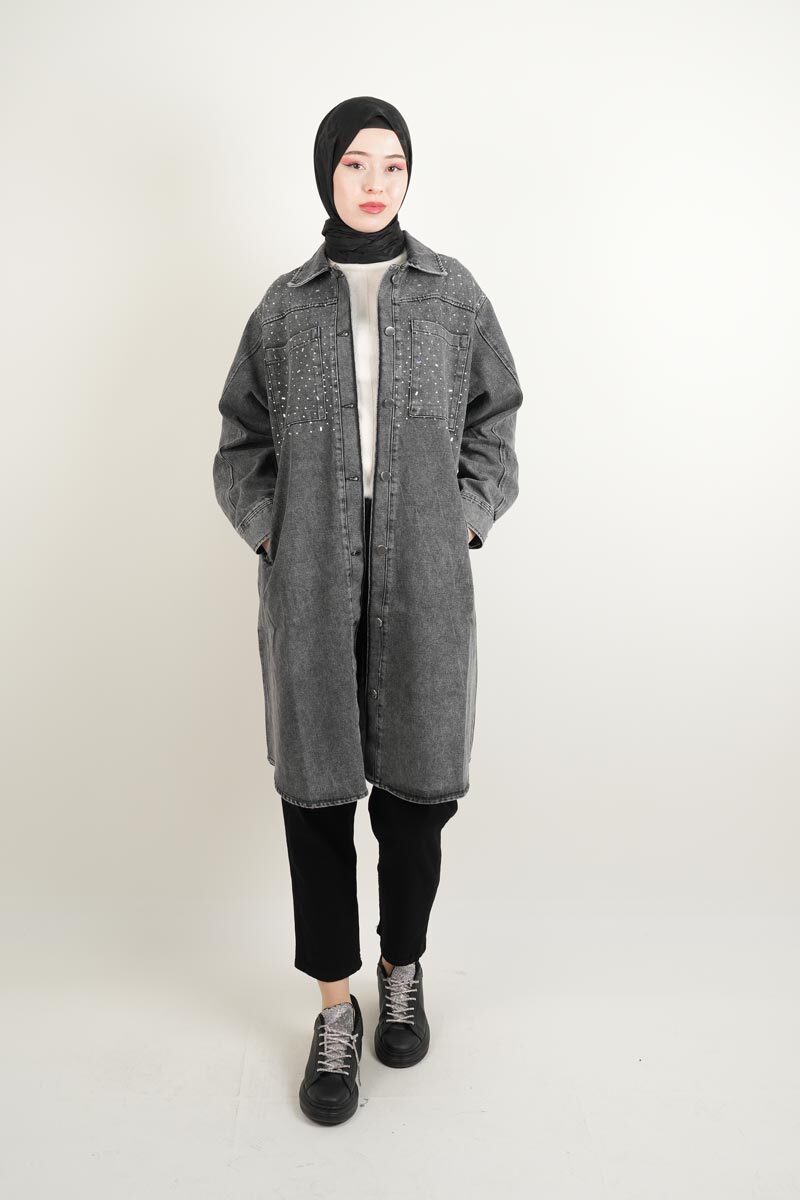 Gri tonlarında taş detaylı denim ceket, modern tasarımıyla zarif bir görünüm sağlar.