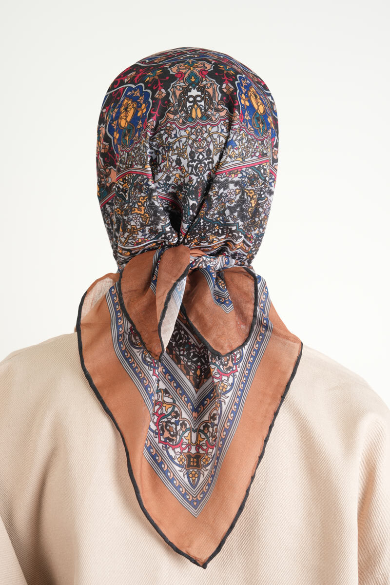 Enerjik safran tonu ile dikkat çeken bu etnik desenli eşarp, tarzınıza sıcak bir dokunuş katıyor.