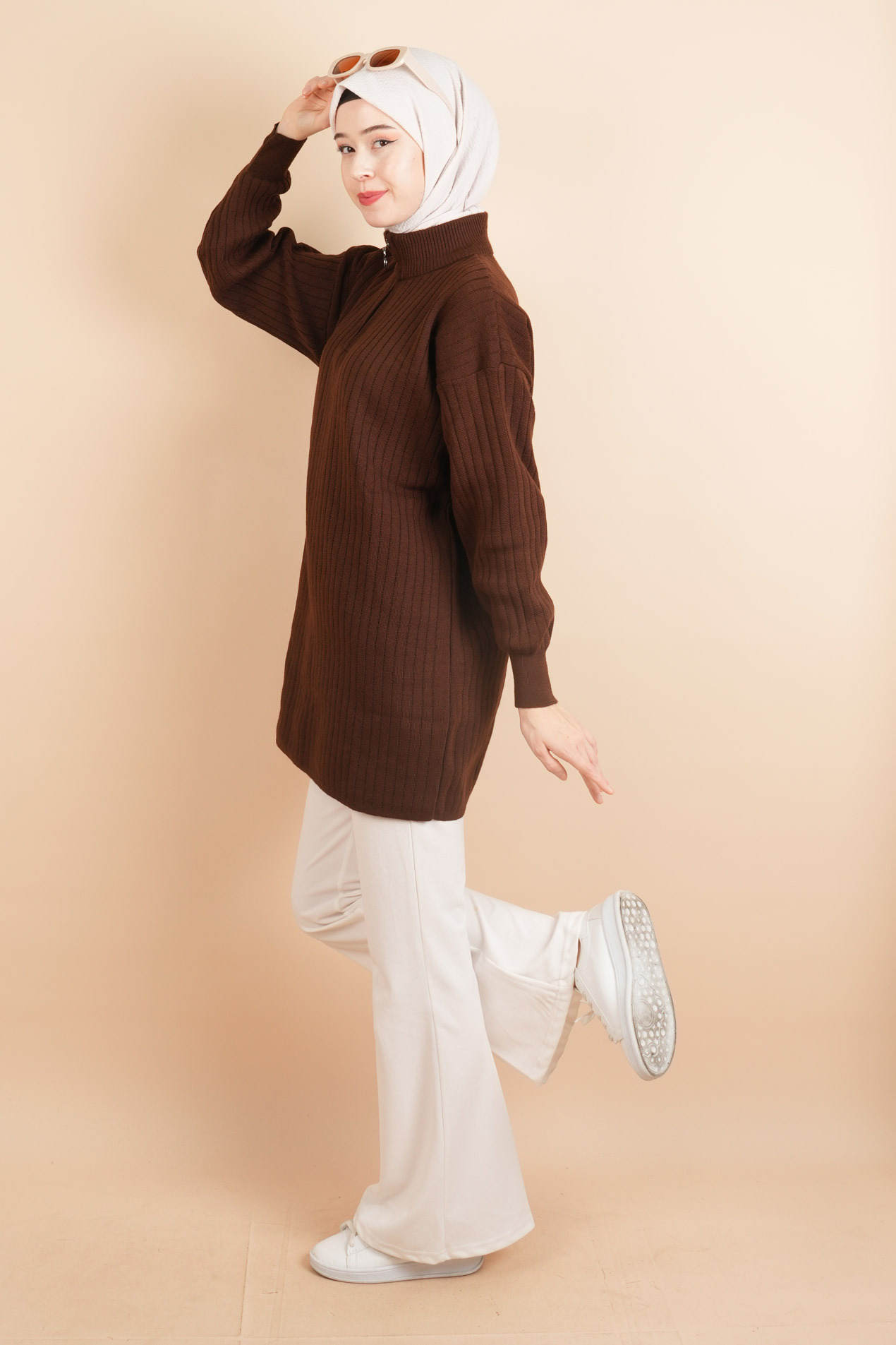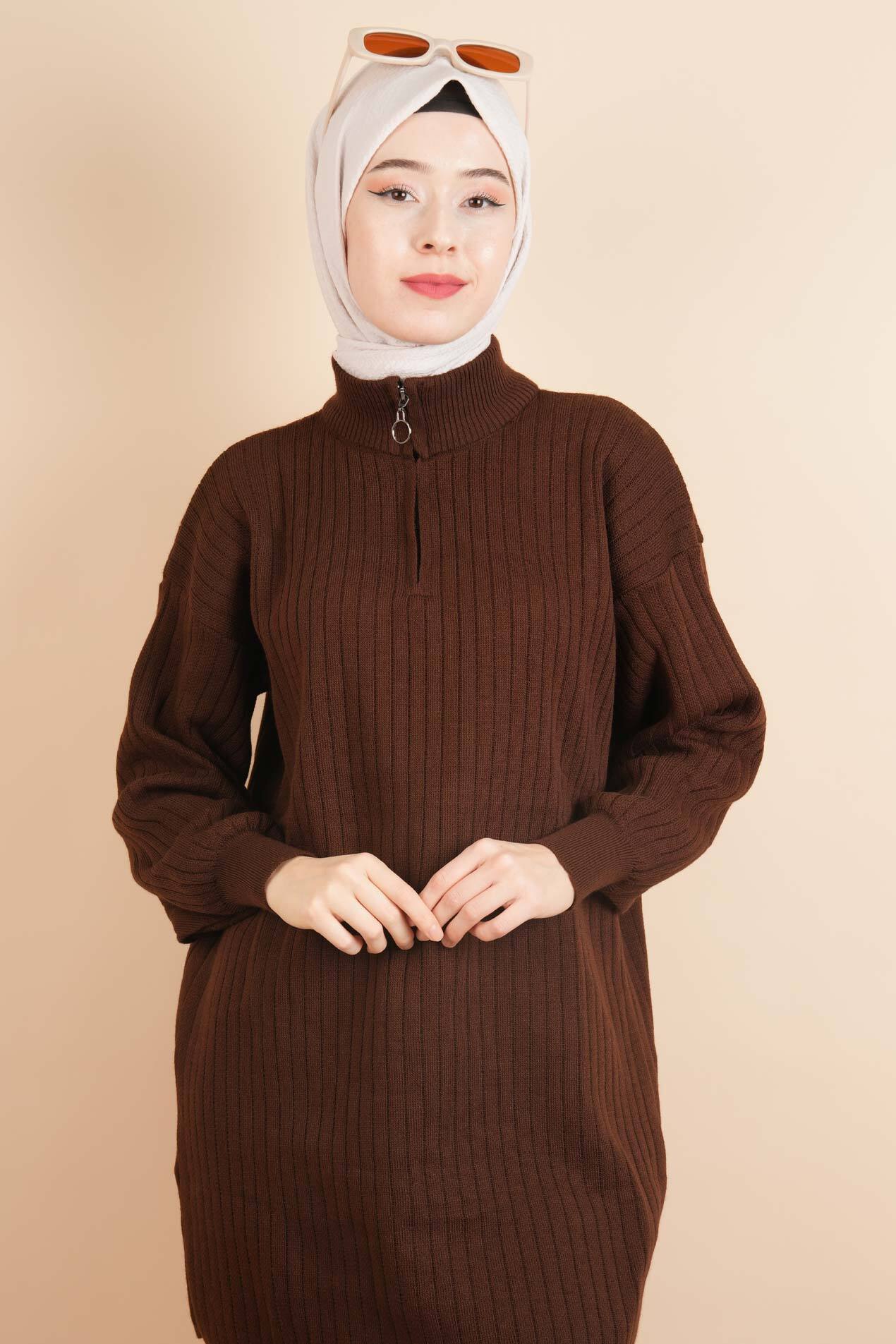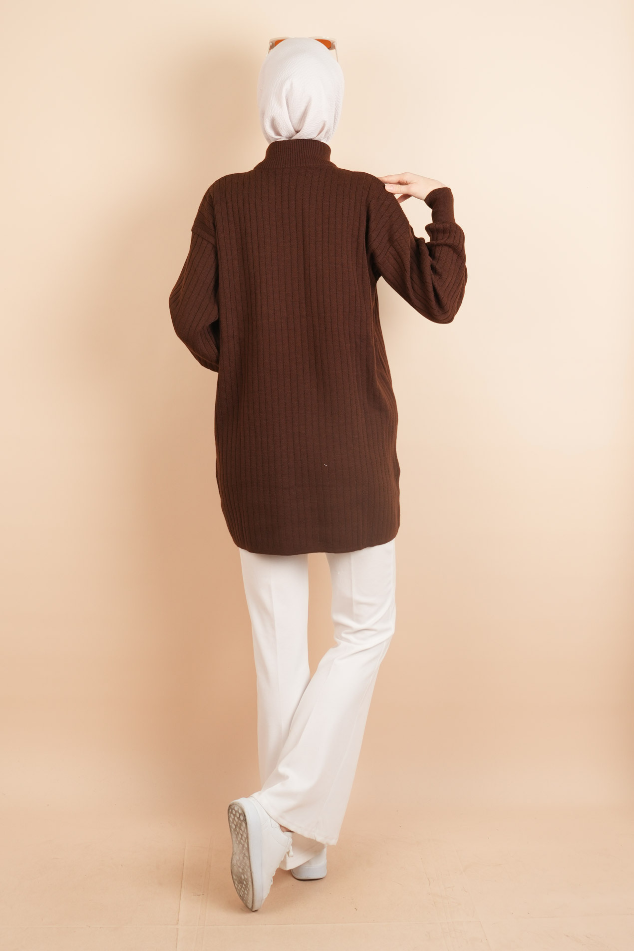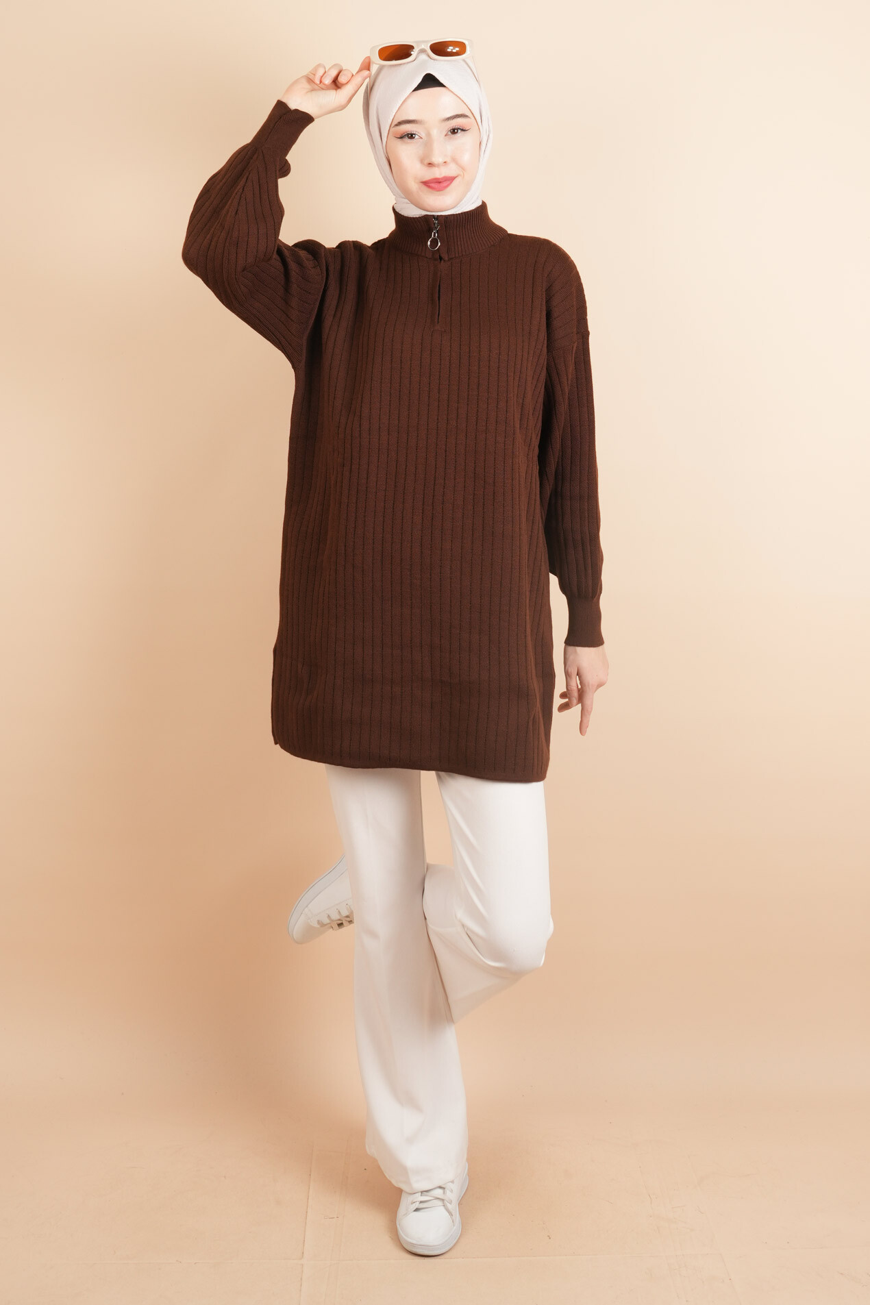 Fermuarlı Yarım Hakim Yaka Dik Fitilli Tunik Kazak Kahverengi