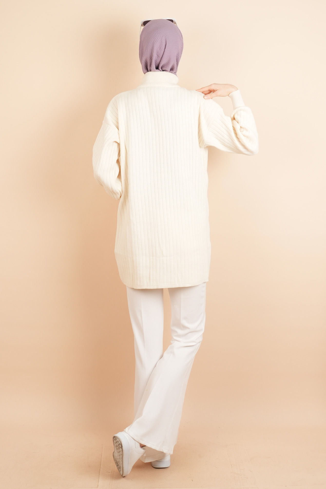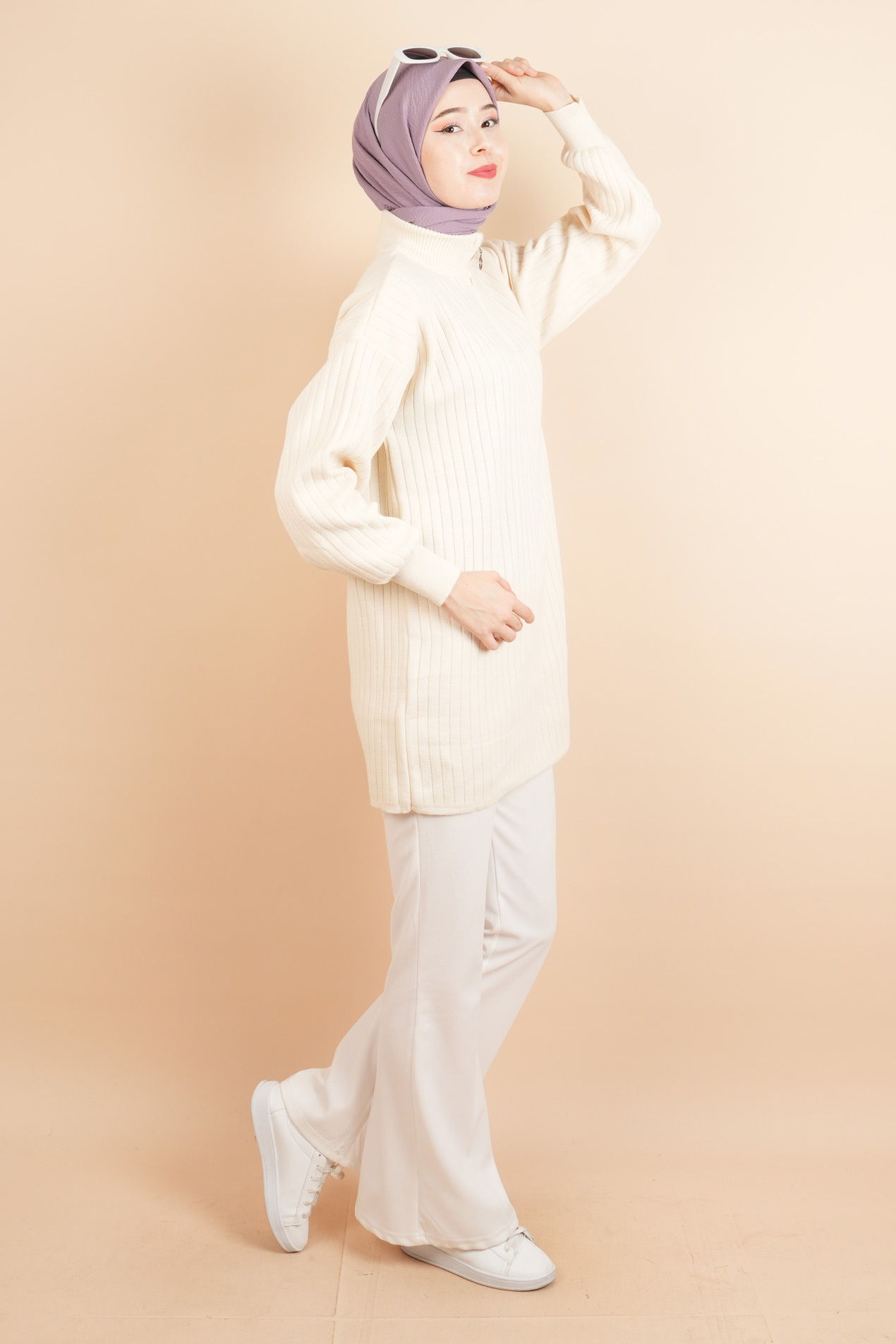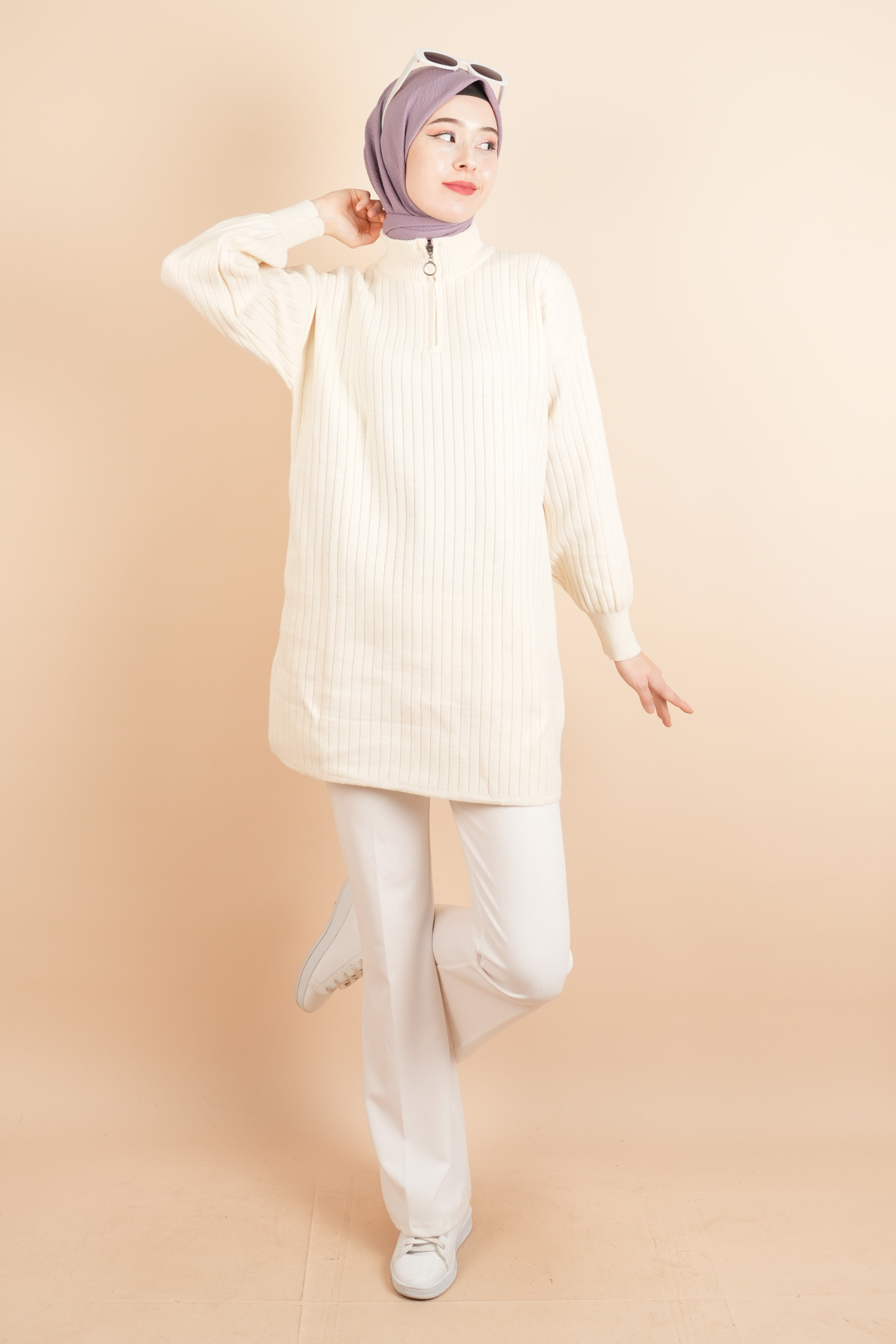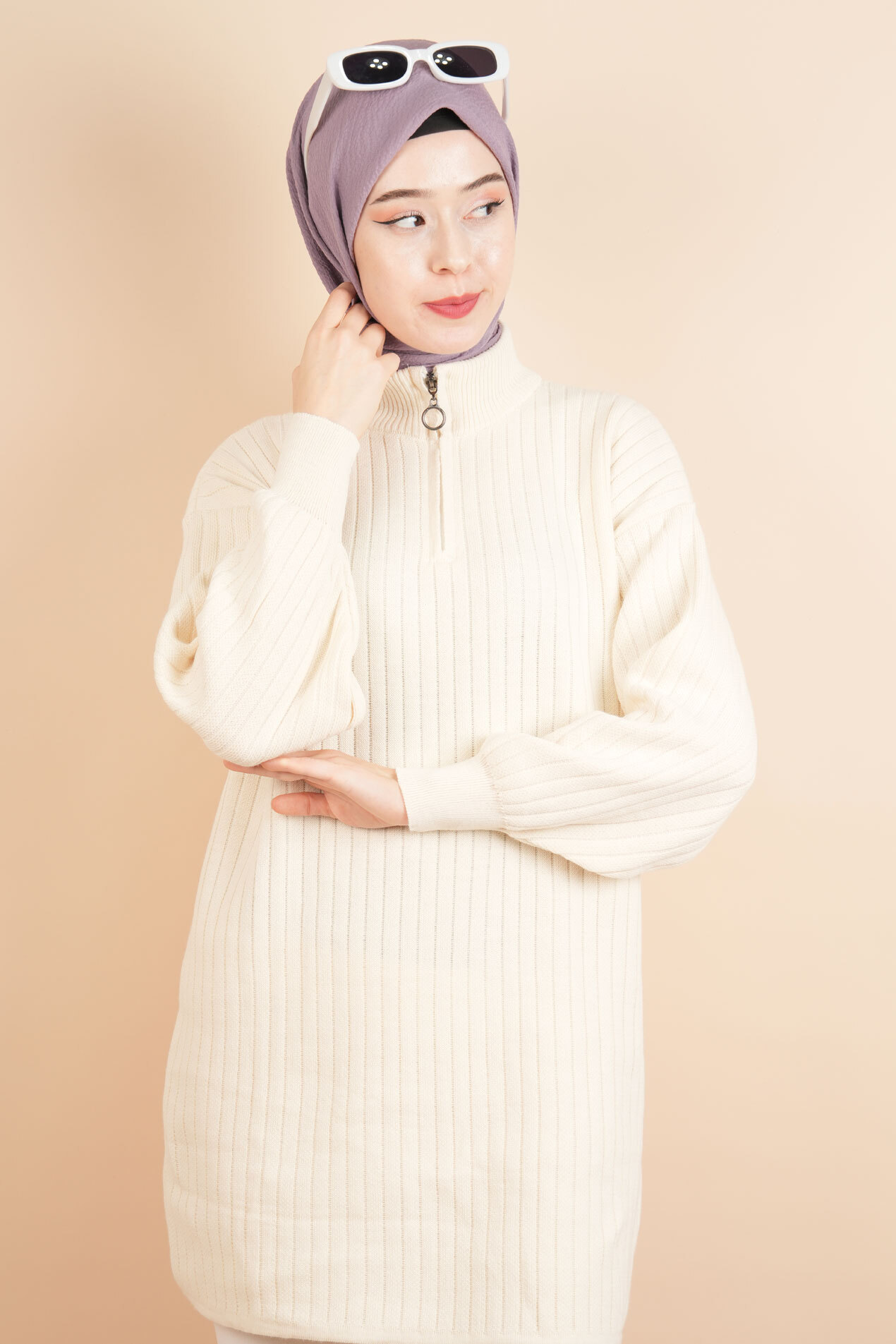 Fermuarlı Yarım Hakim Yaka Dik Fitilli Tunik Kazak Krem