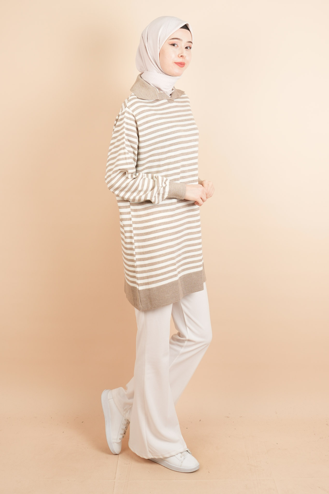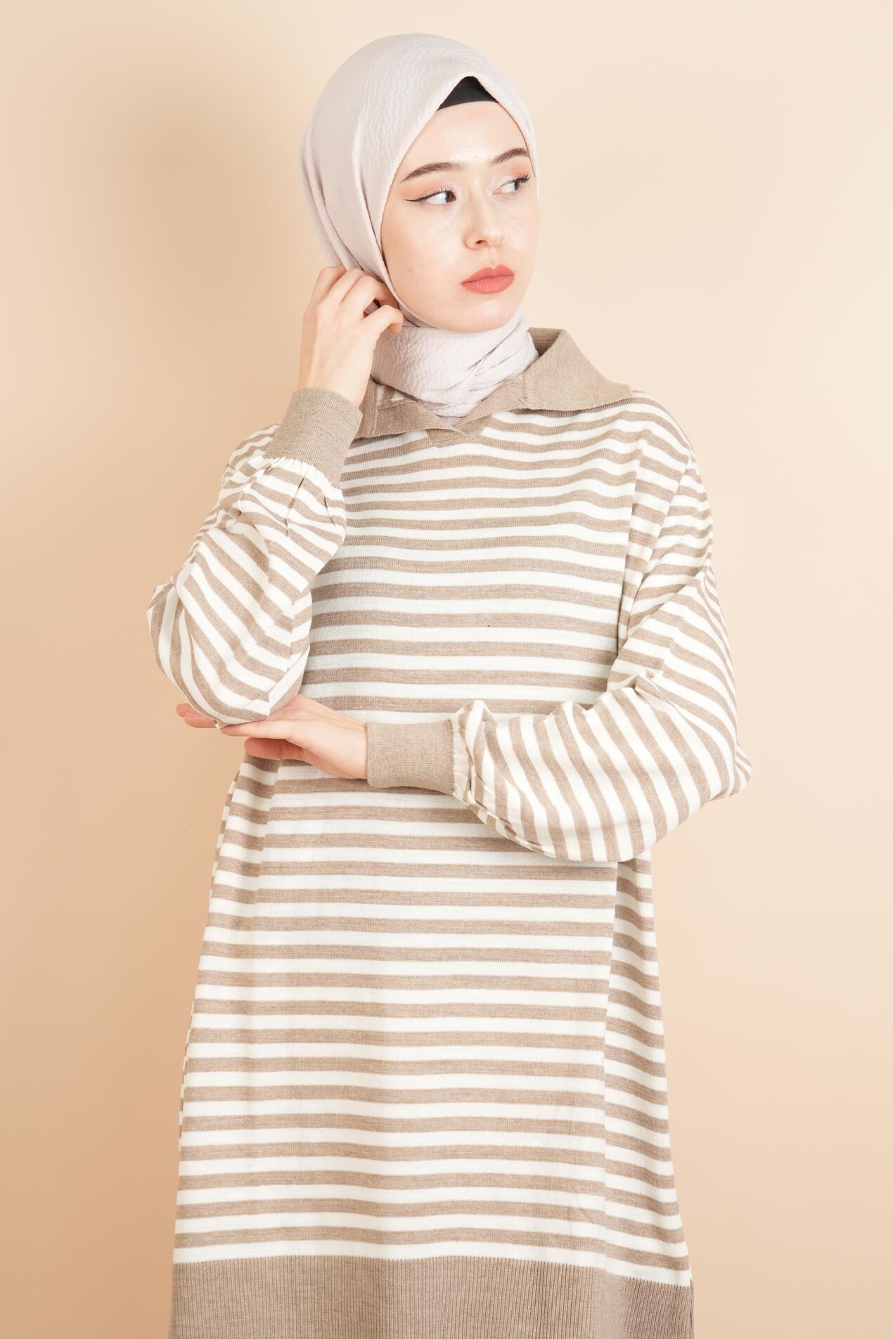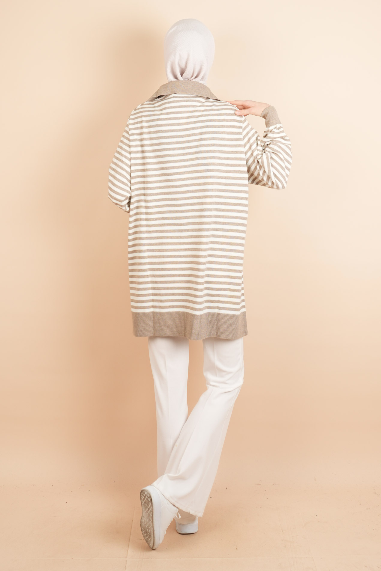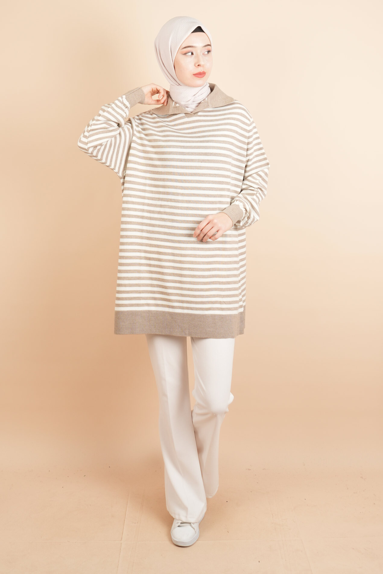 İnce Çizgili Polo Yaka Tunik Kazak Bej