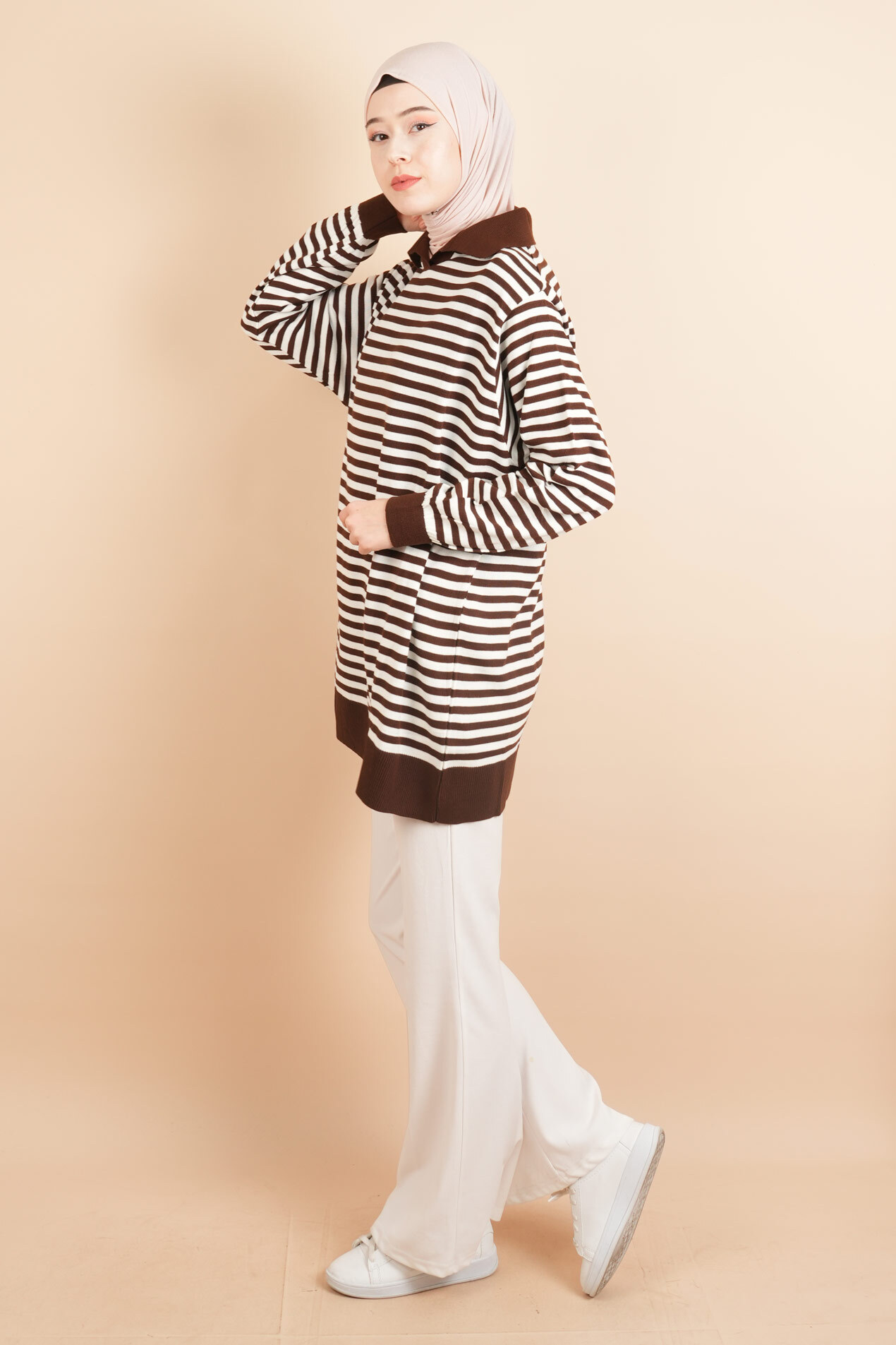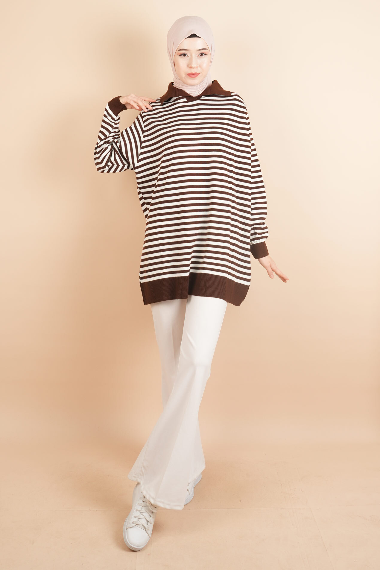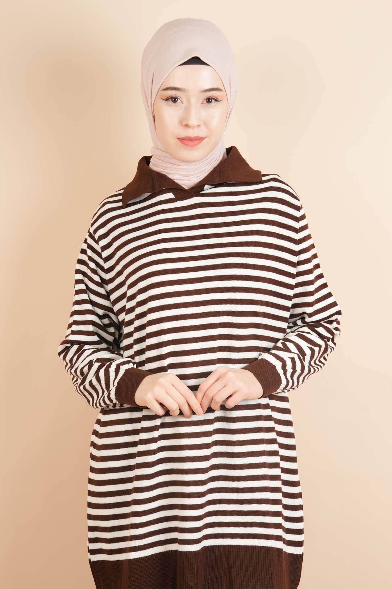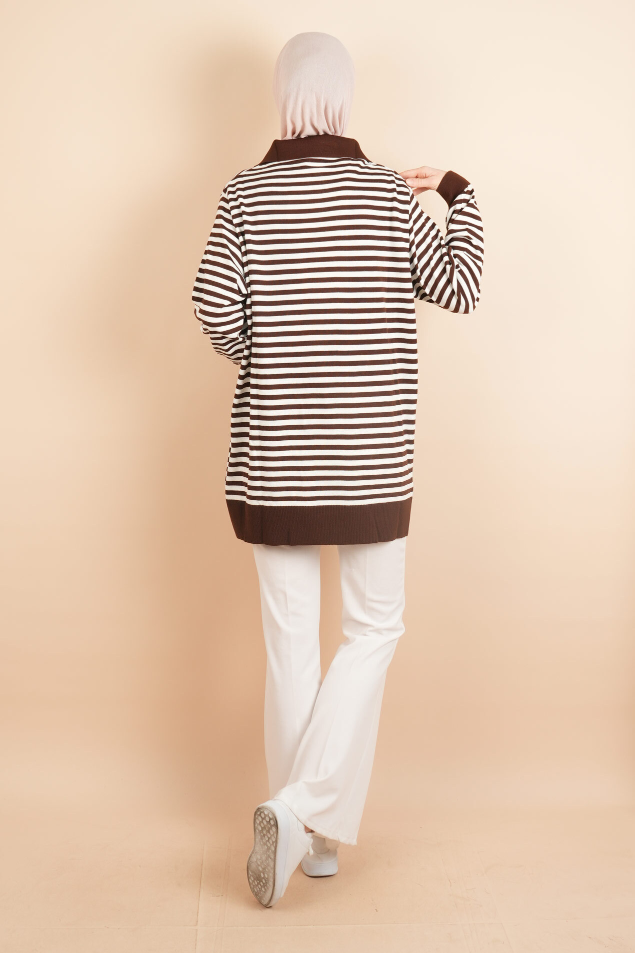 İnce Çizgili Polo Yaka Tunik Kazak Kahverengi