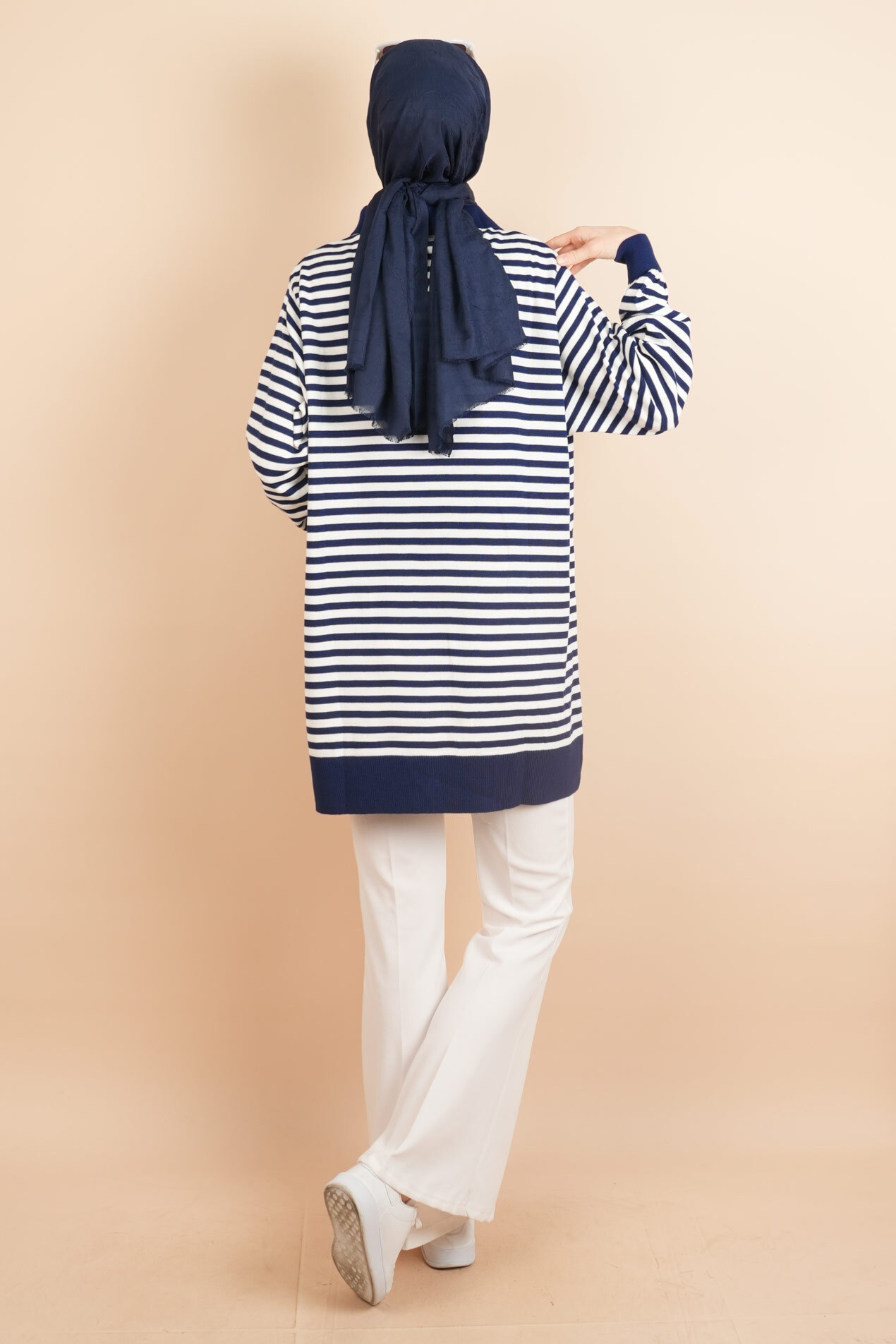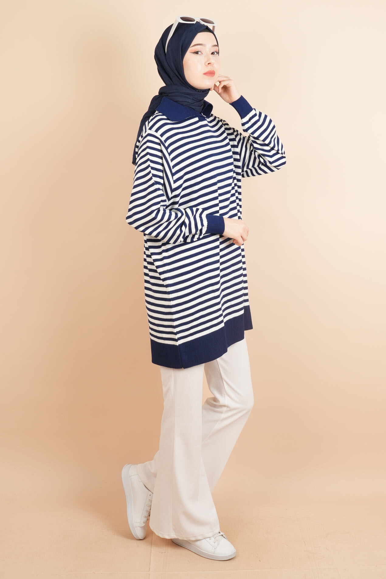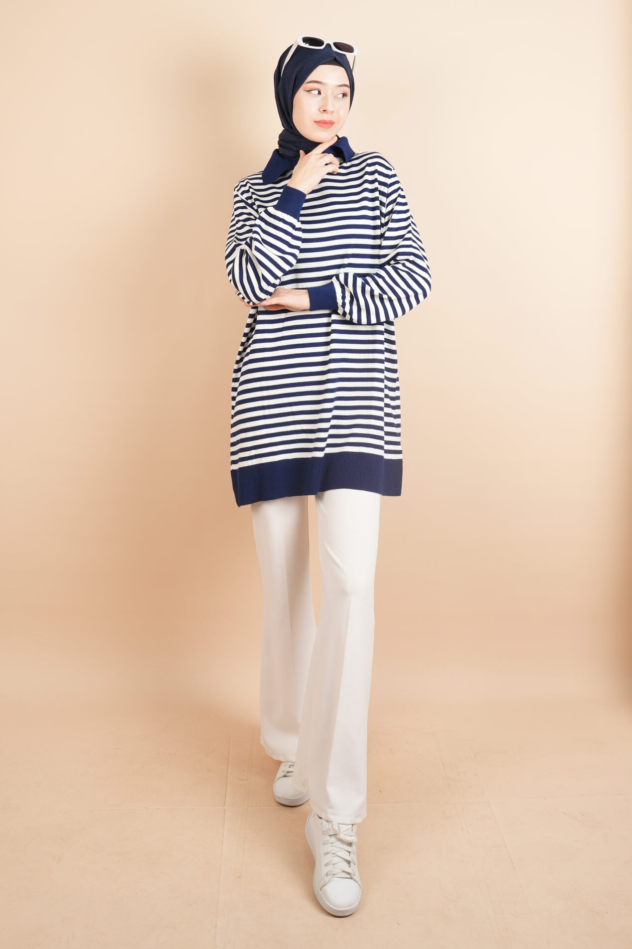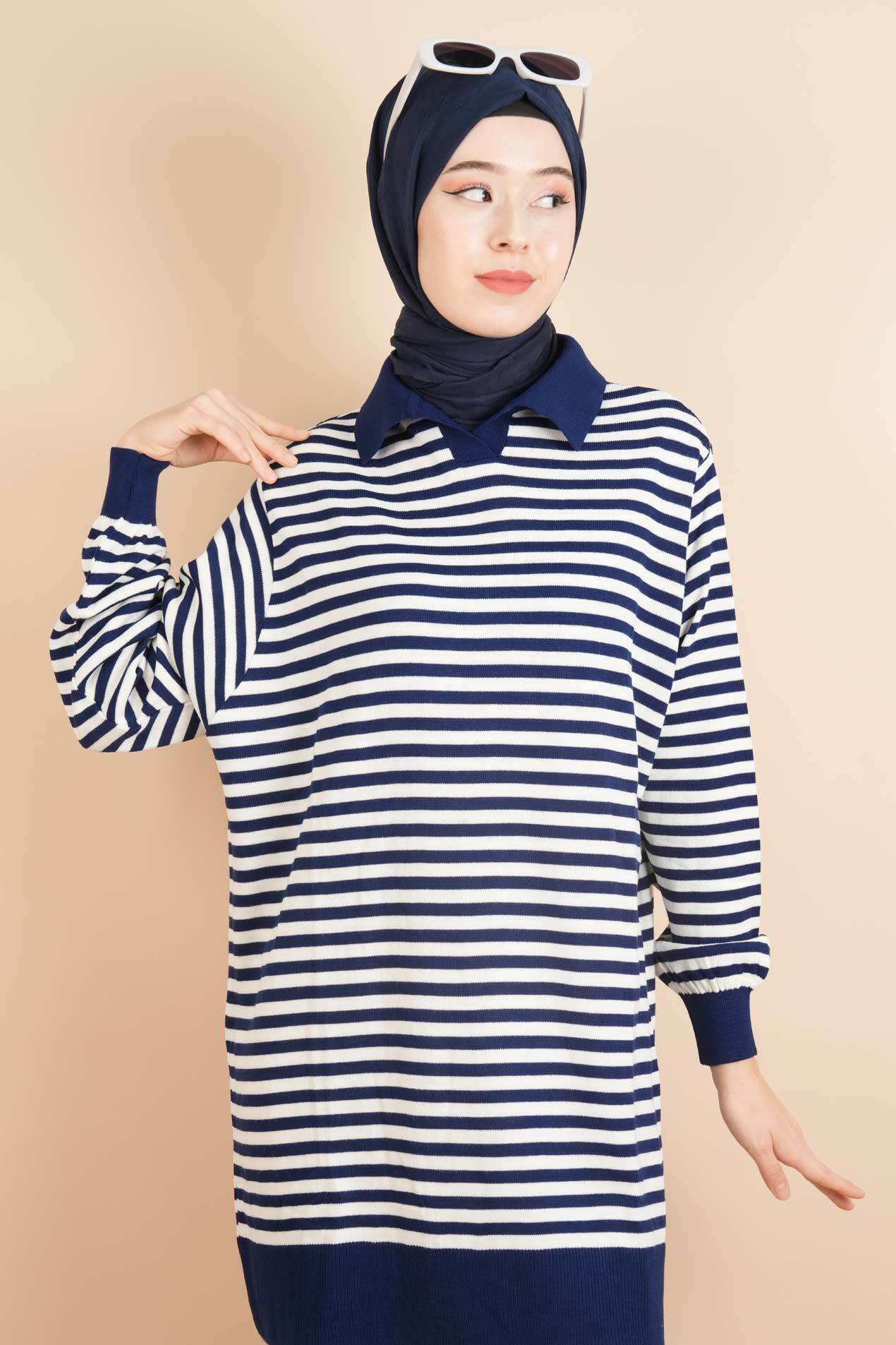 İnce Çizgili Polo Yaka Tunik Kazak Lacivert