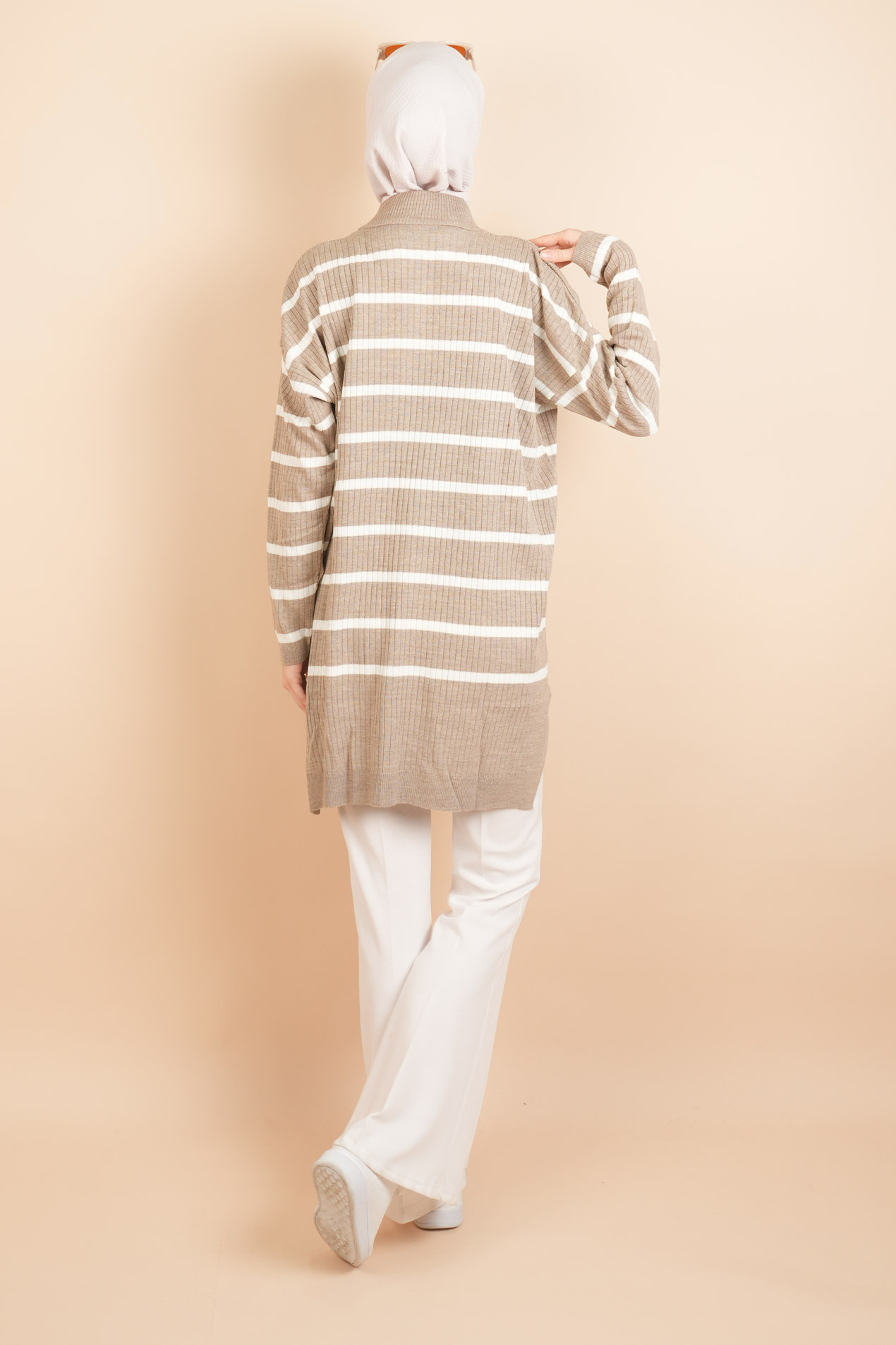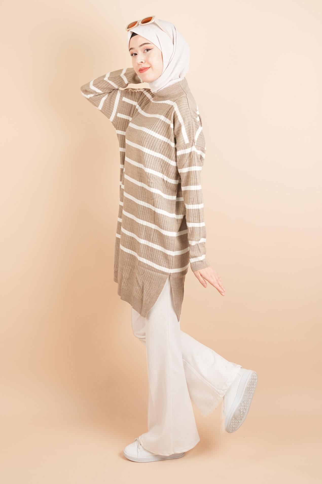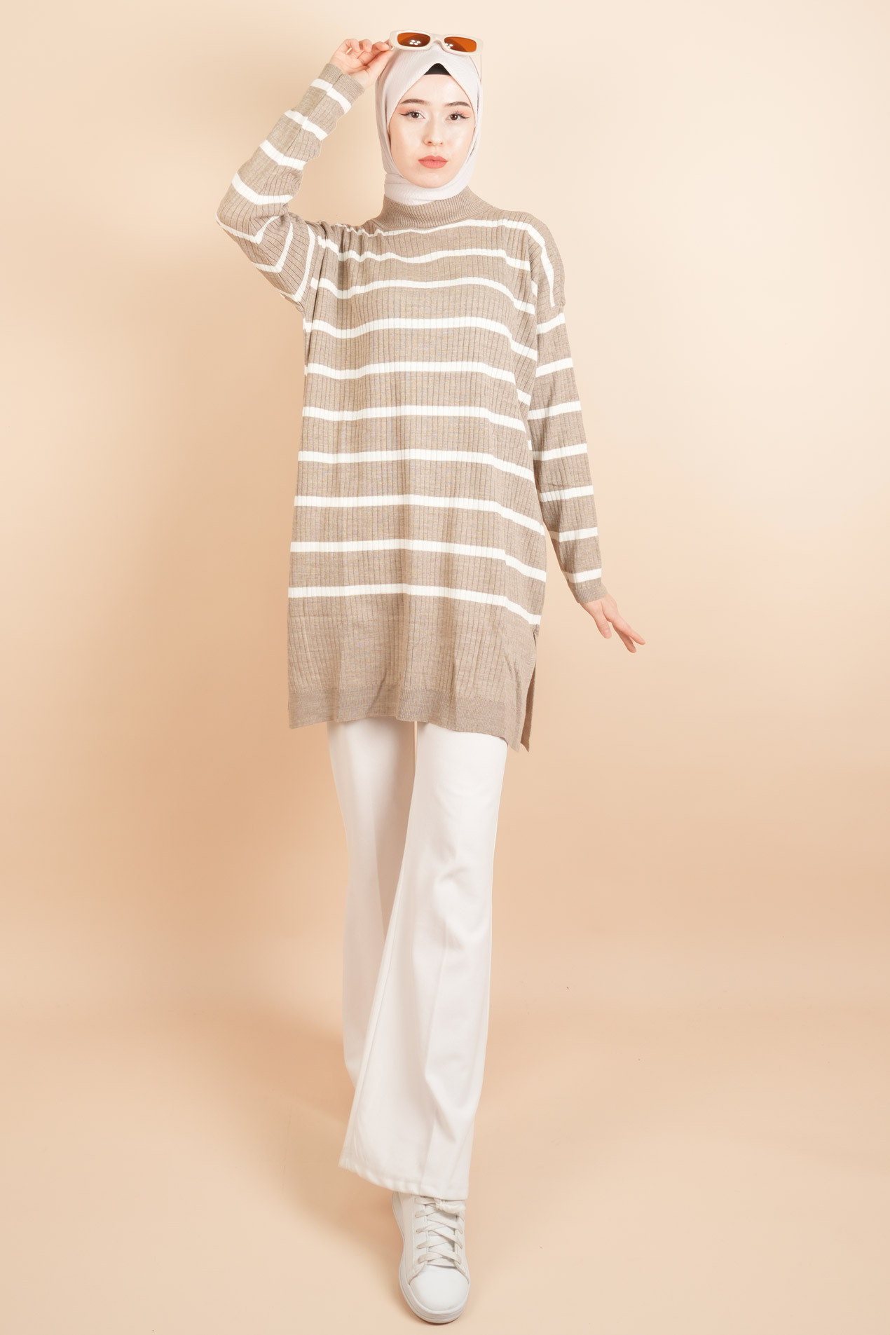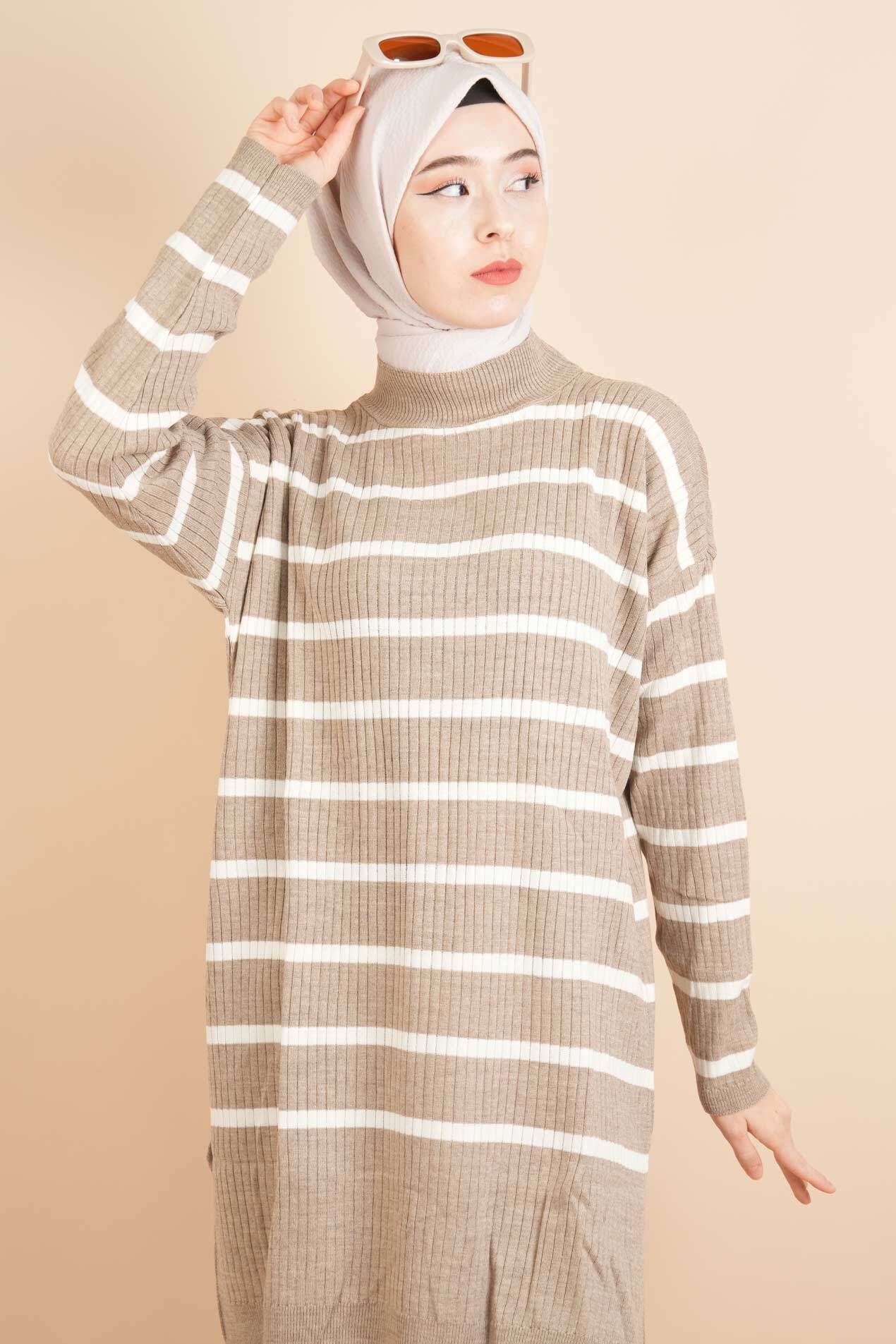 Kendinden Fitilli Yan Çizgili Tunik Kazak, fitilli dokusu ve yan çizgi detayıyla modern bir görünüm sunar. Rahat kesimiyle tesettür giyimde hem şıklık hem konfor arayanlar için ideal bir parça.