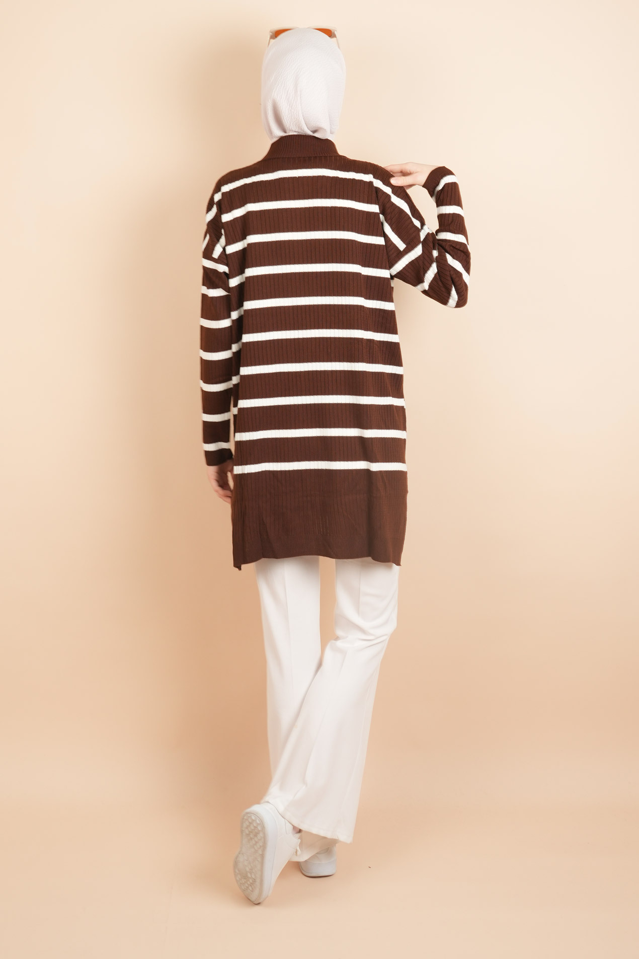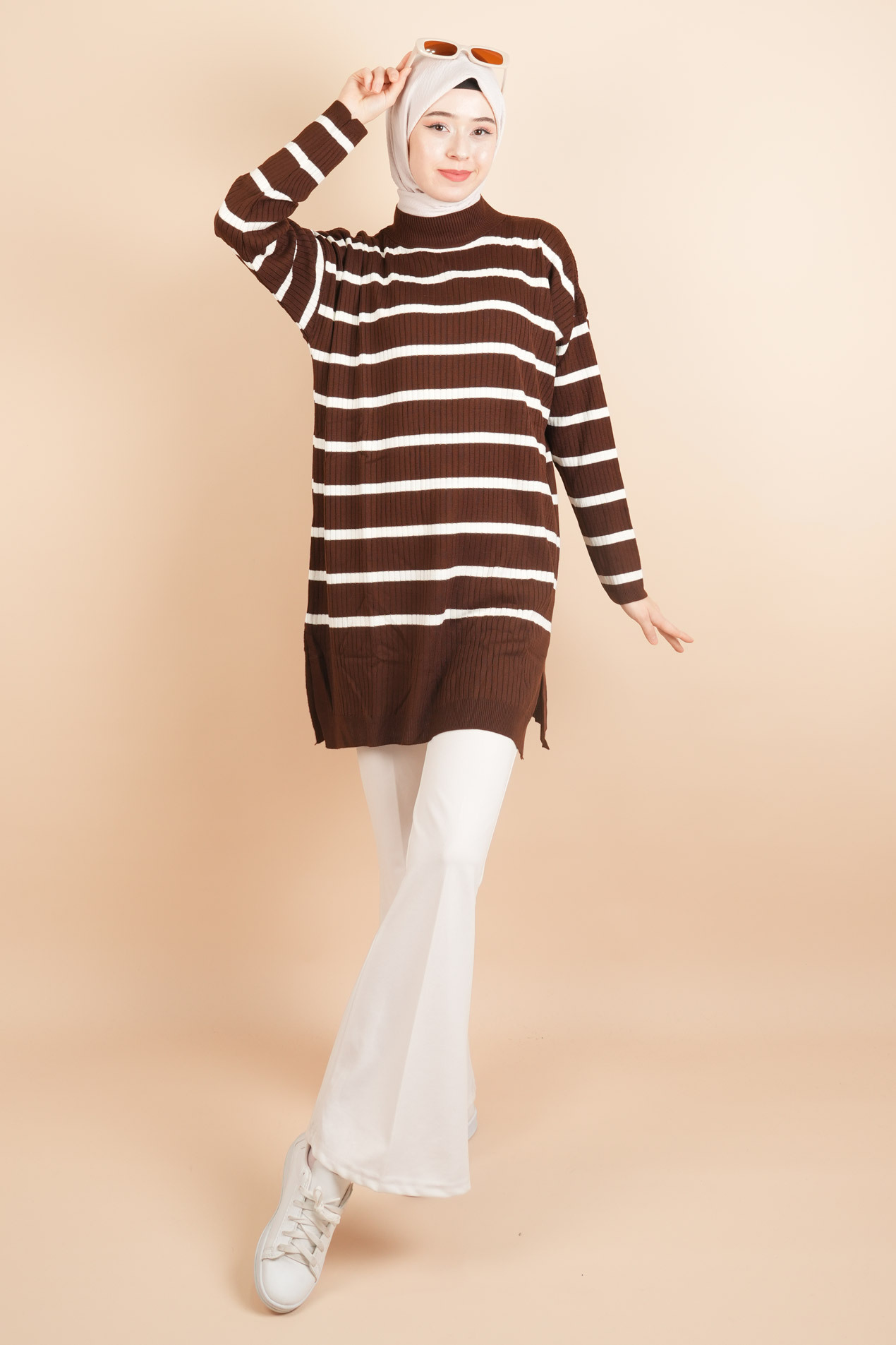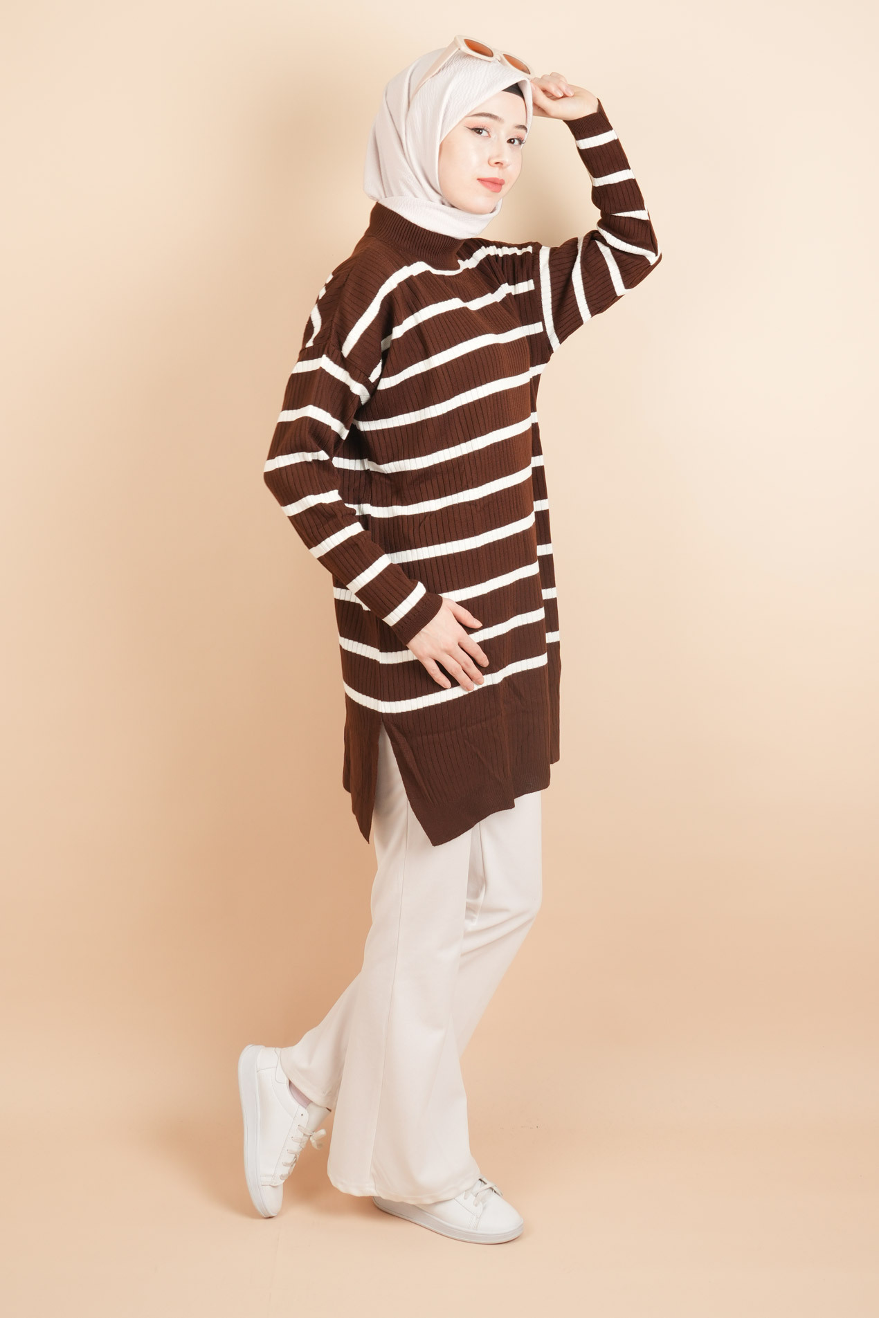 Kendinden Fitilli Yan Çizgili Tunik Kazak Kahverengi