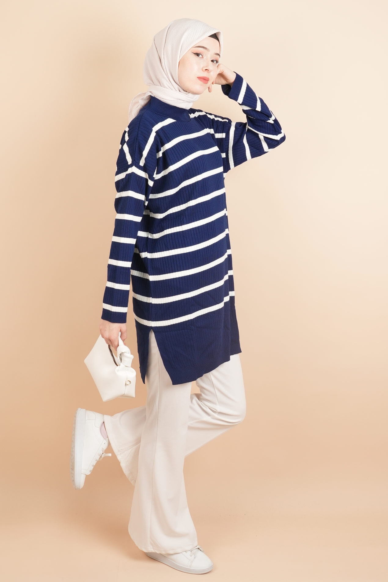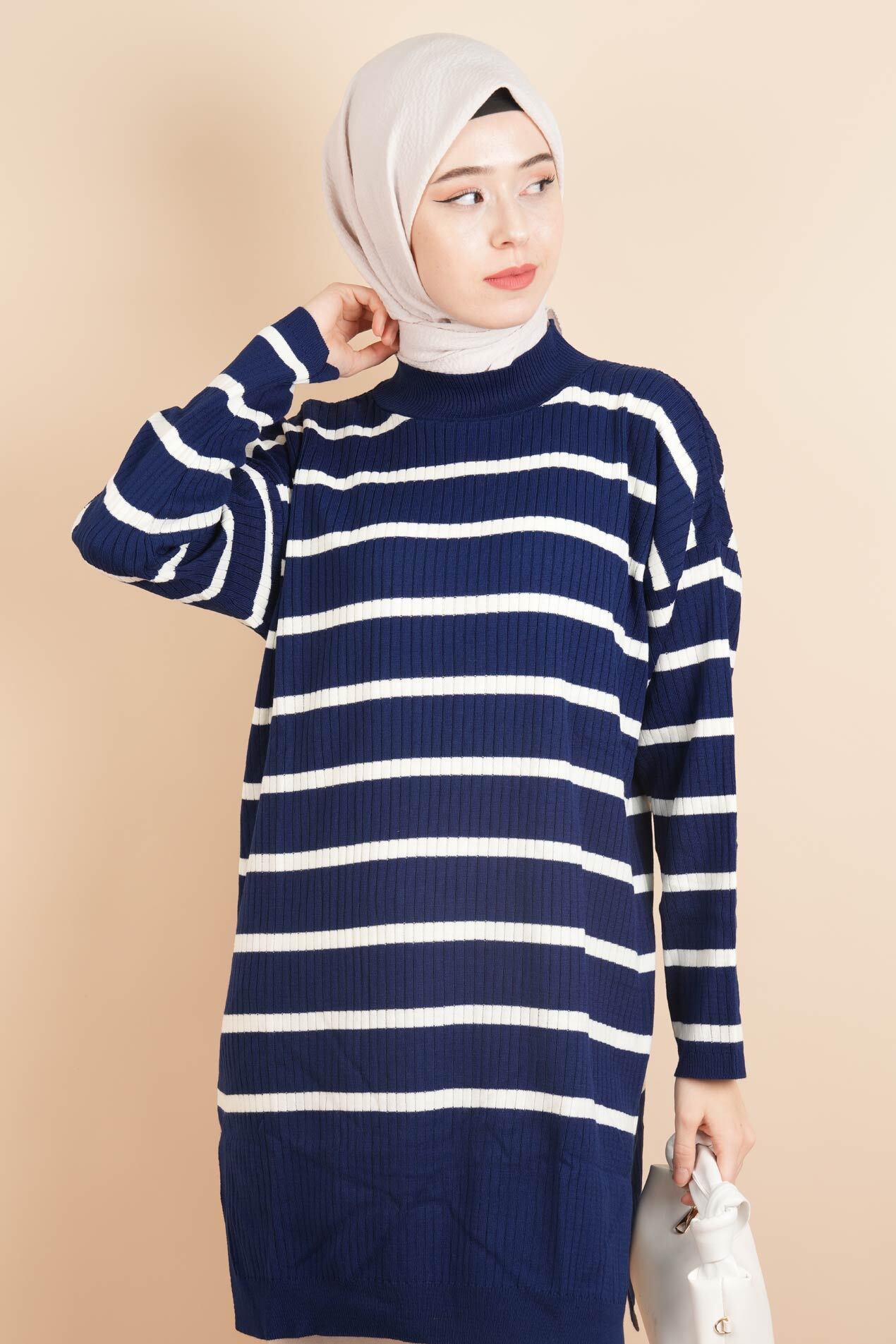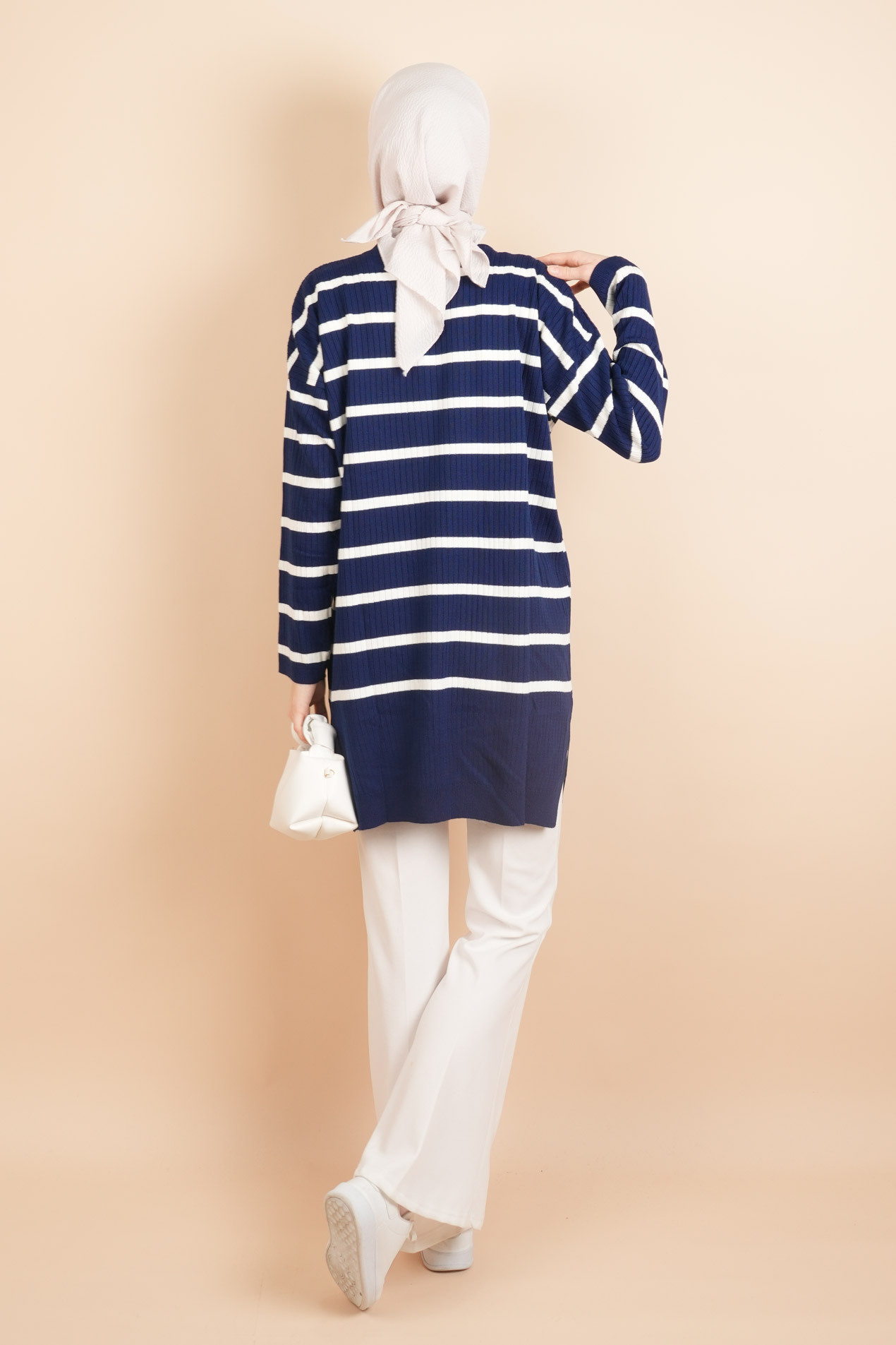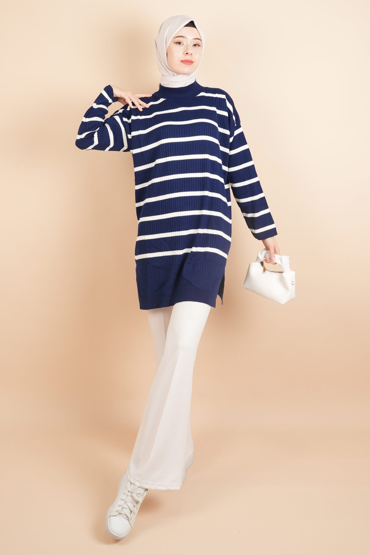 Kendinden Fitilli Yan Çizgili Tunik Kazak Lacivert