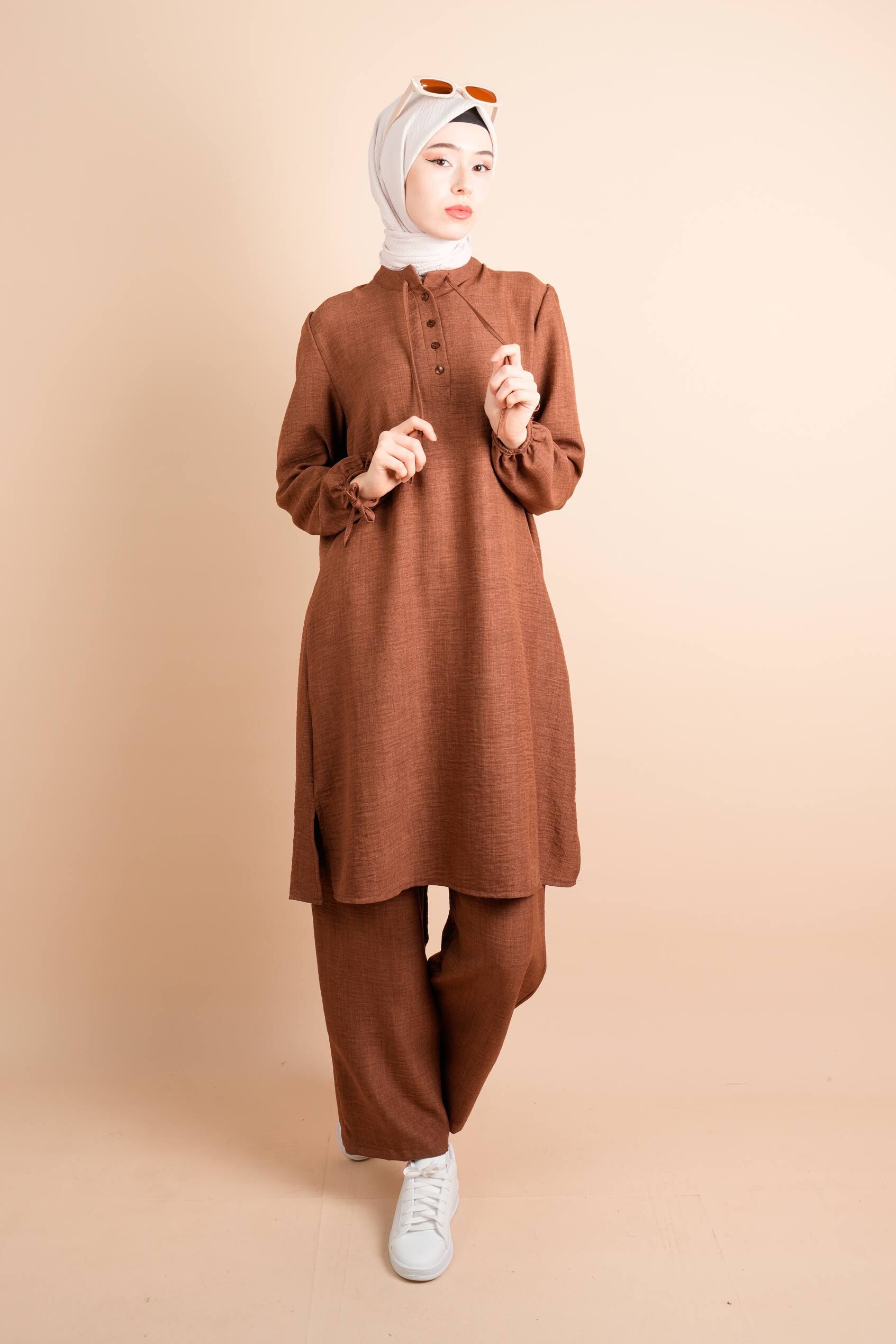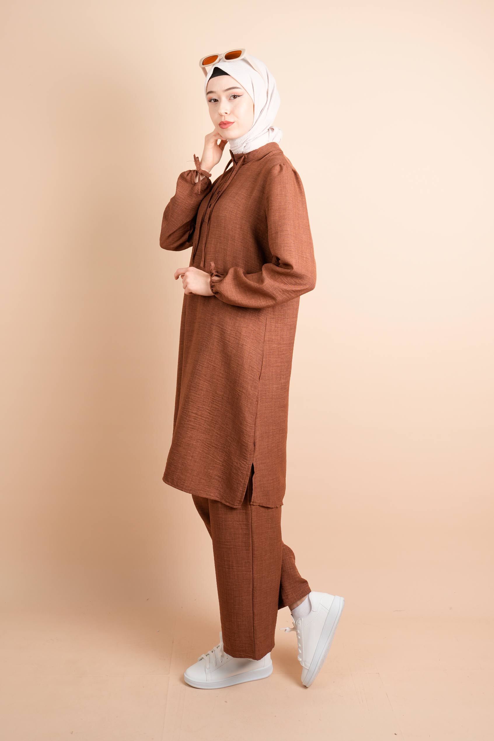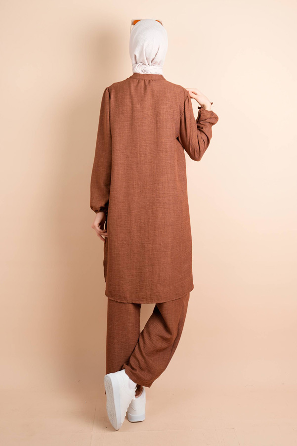 Keten 2 li Takım Yarım Düğmeli Zincir İpli Elbise Gita Açık Kahverengi