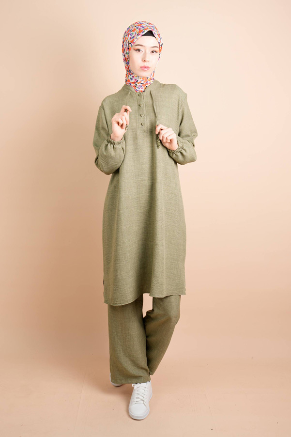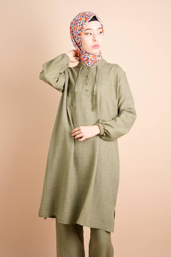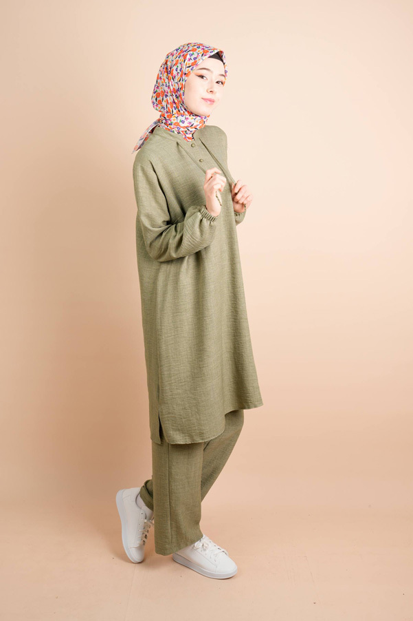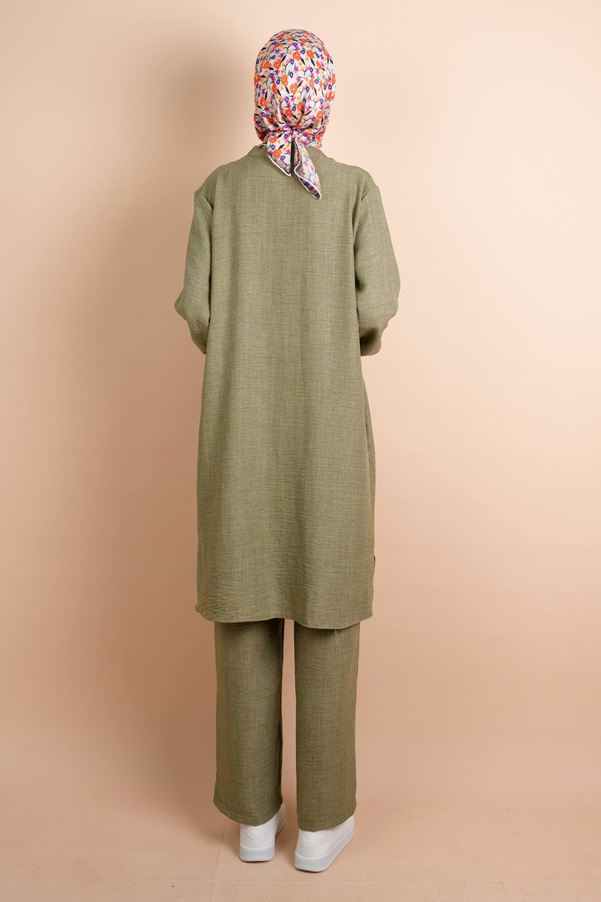 Keten 2 li Takım Yarım Düğmeli Zincir İpli Elbise Gita Açık Yeşil