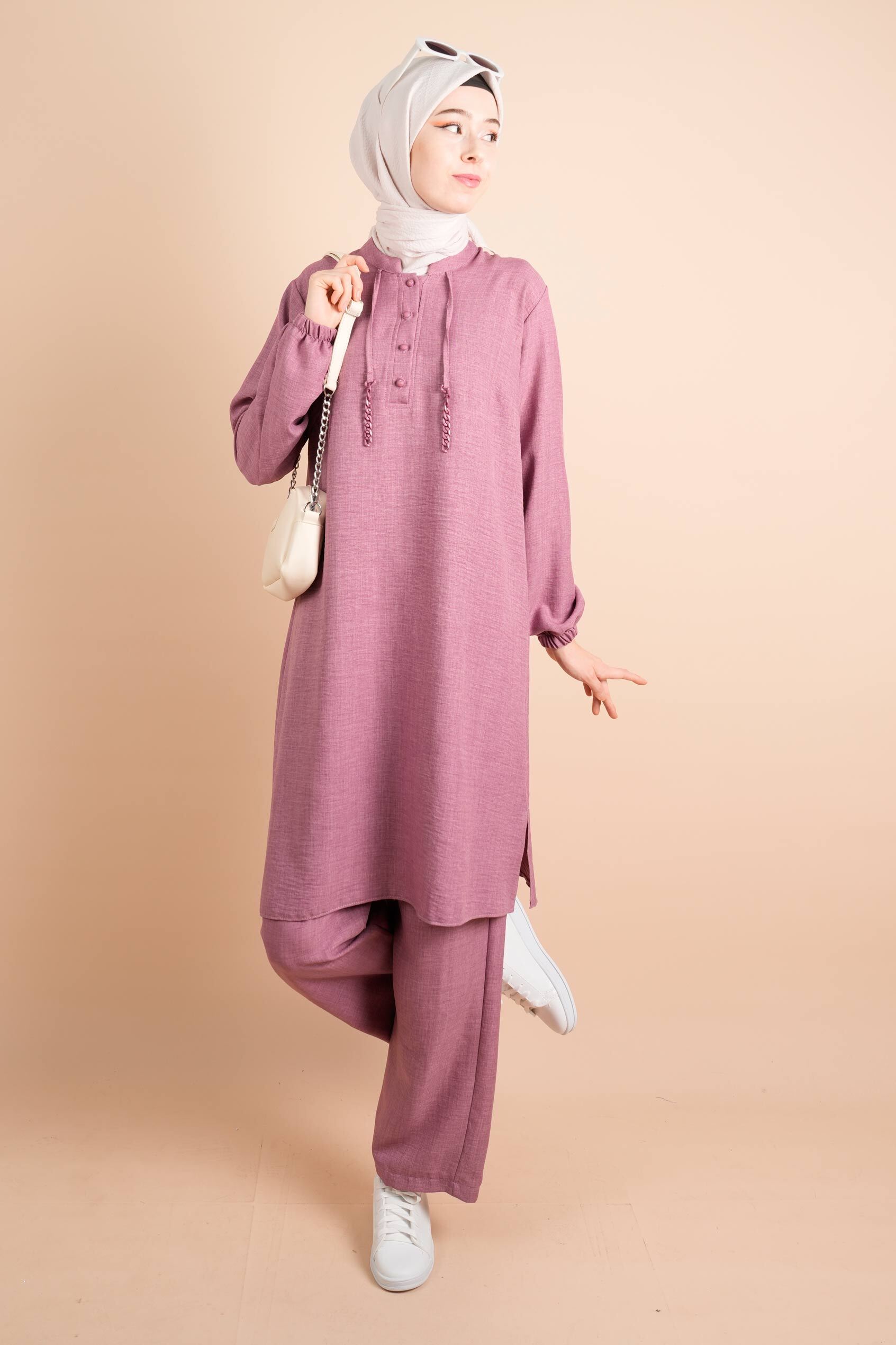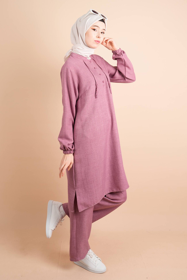 Keten 2 li Takım Yarım Düğmeli Zincir İpli Elbise Gita Gül Kurusu