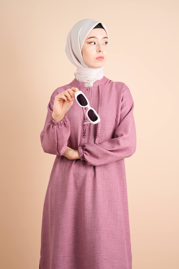 yarım düğmeli elbise gül kurusu