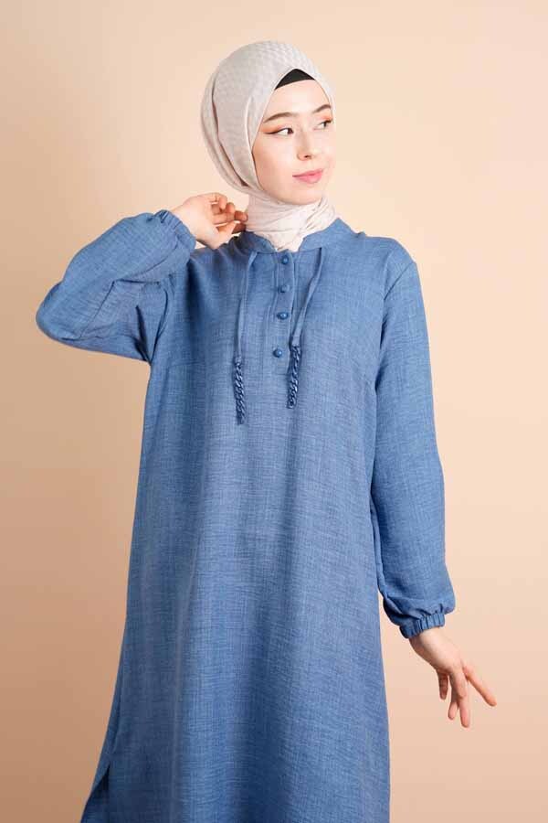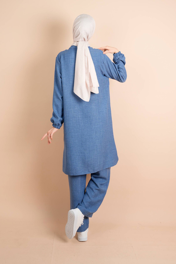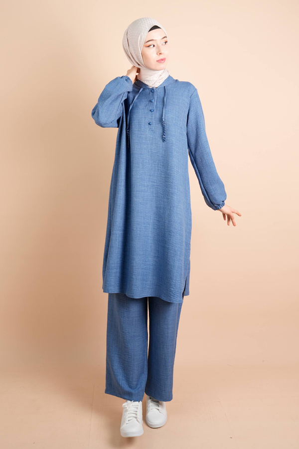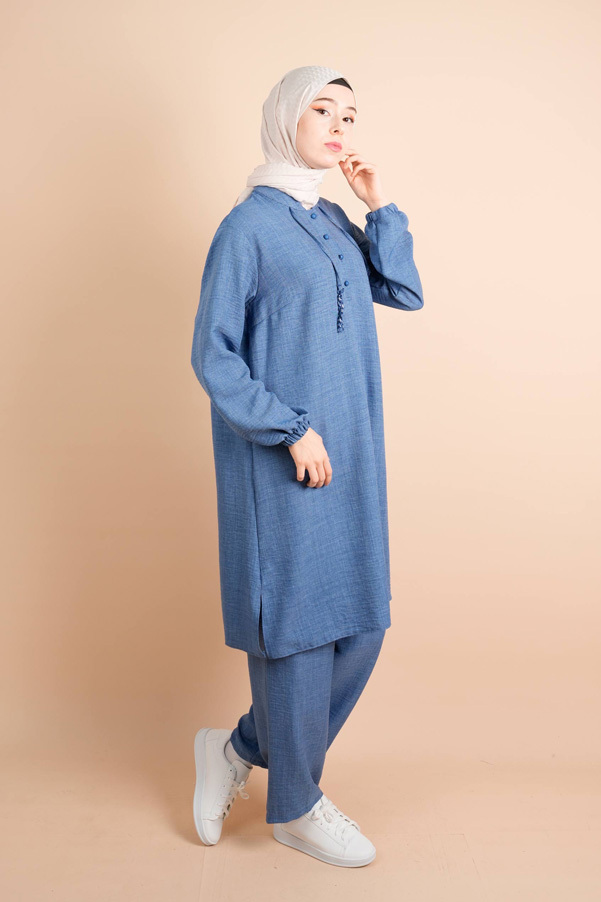 Keten 2 li Takım Yarım Düğmeli Zincir İpli Elbise Gita Mavi