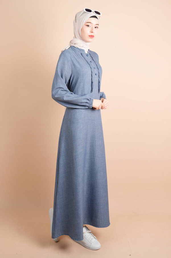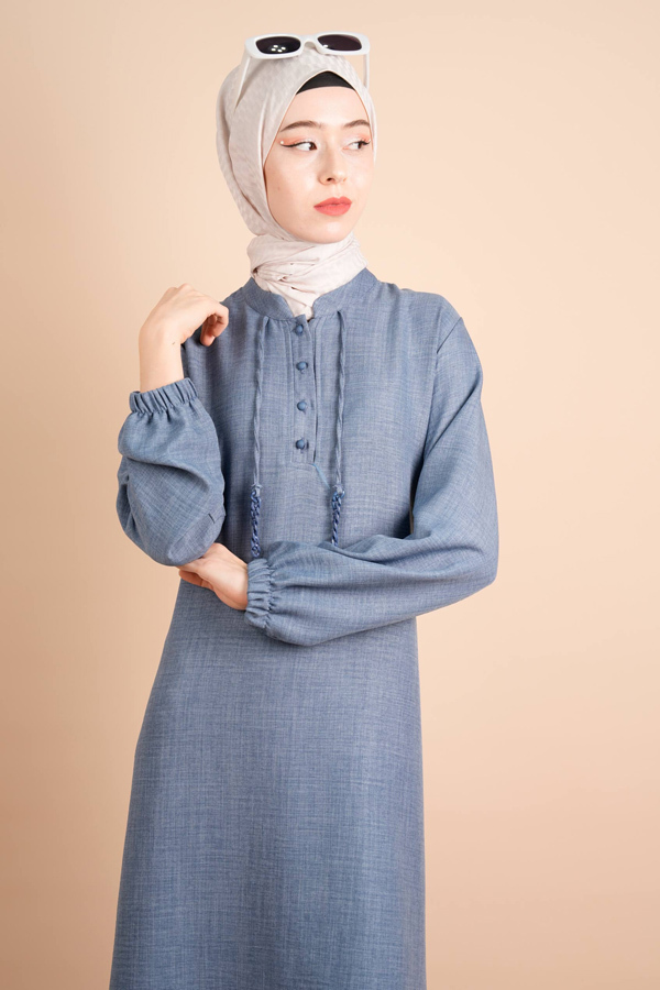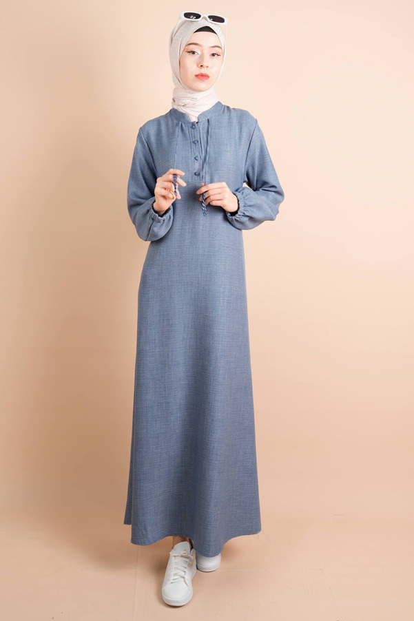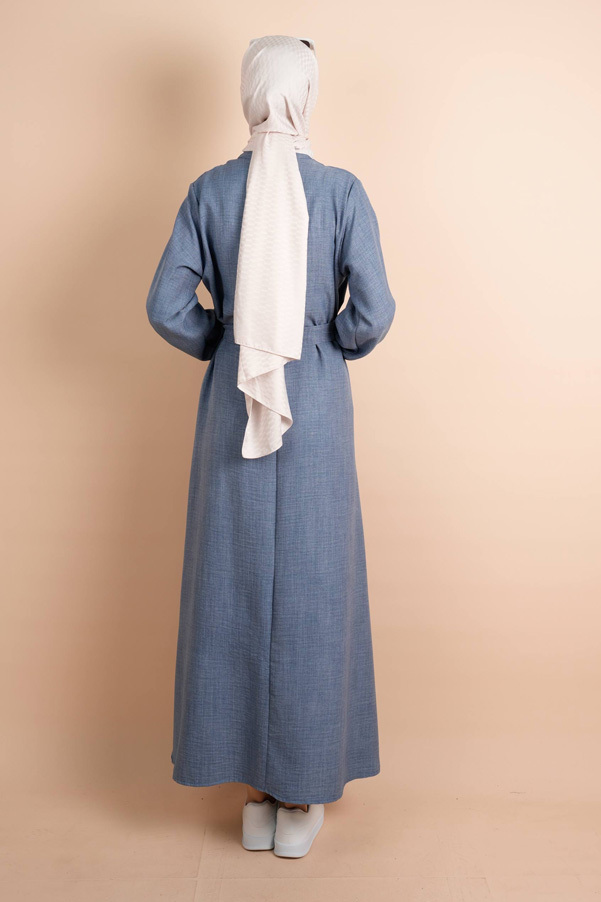 Keten Elbise Yarım Düğme İp Detaylı Gita Elbise Açık Mavi