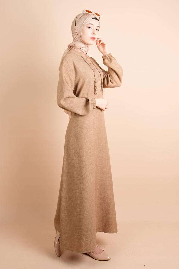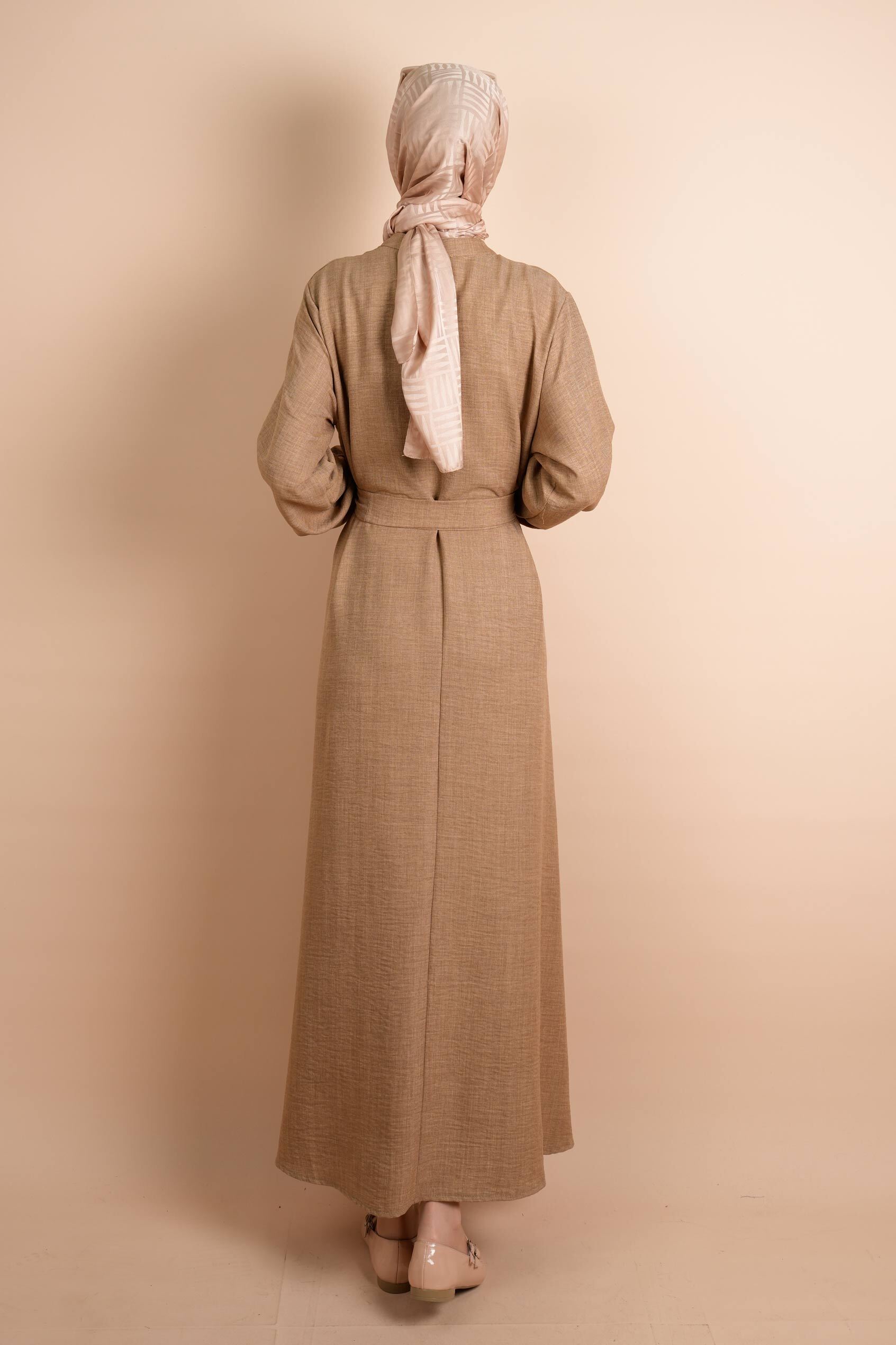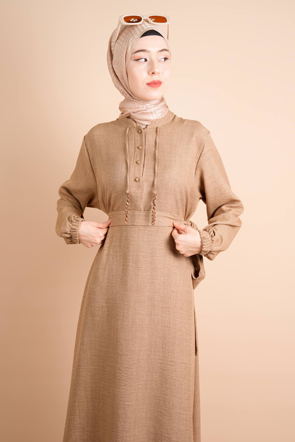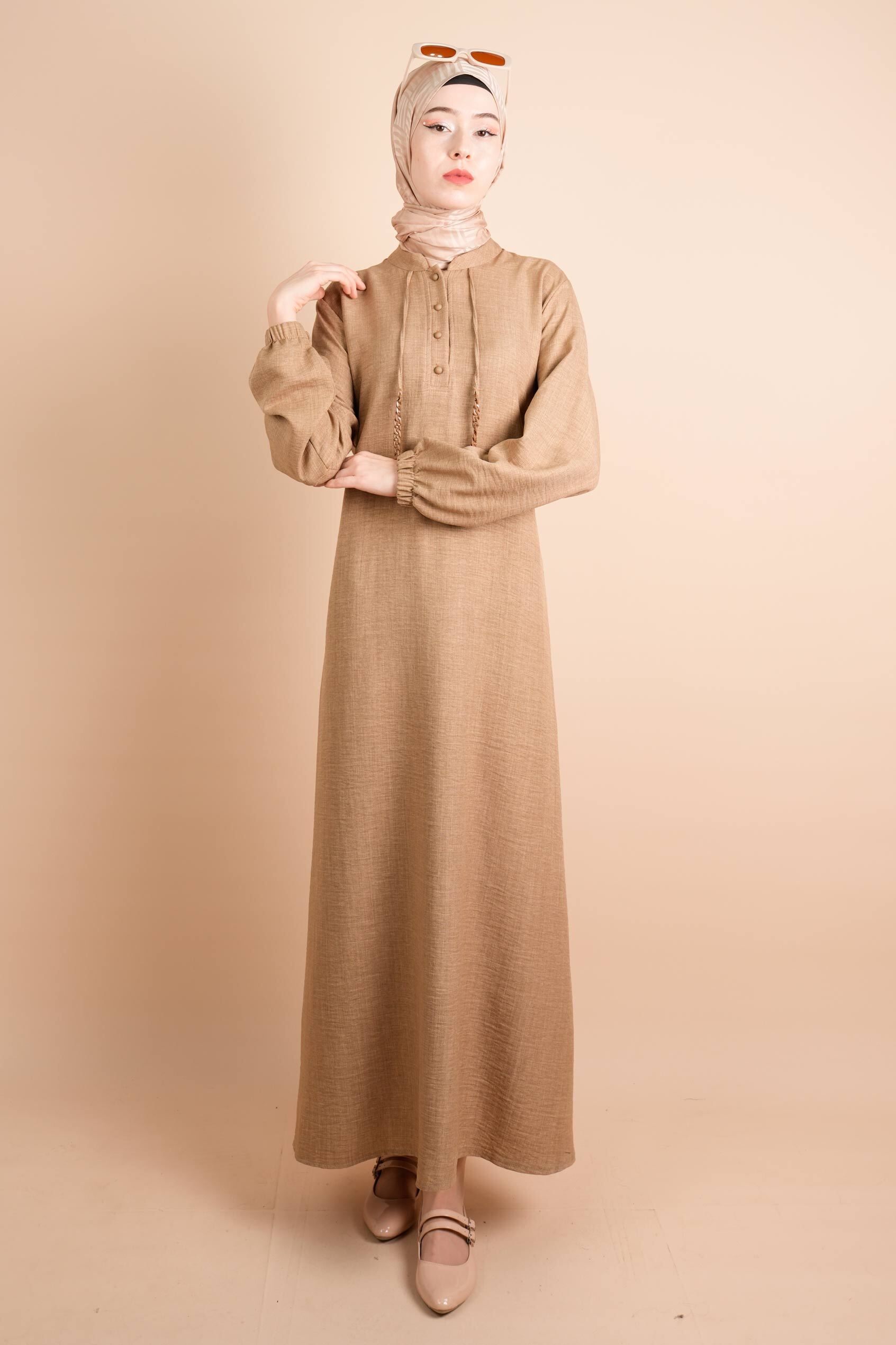 Keten Elbise Yarım Düğme İp Detaylı Gita Elbise Bej