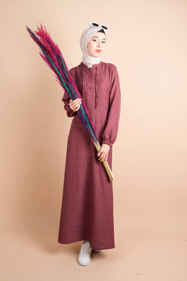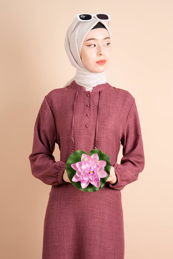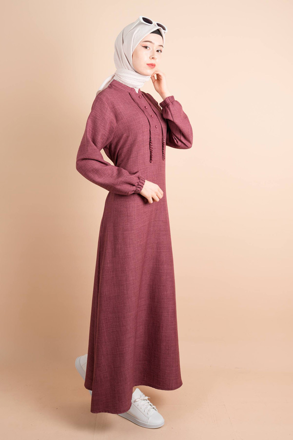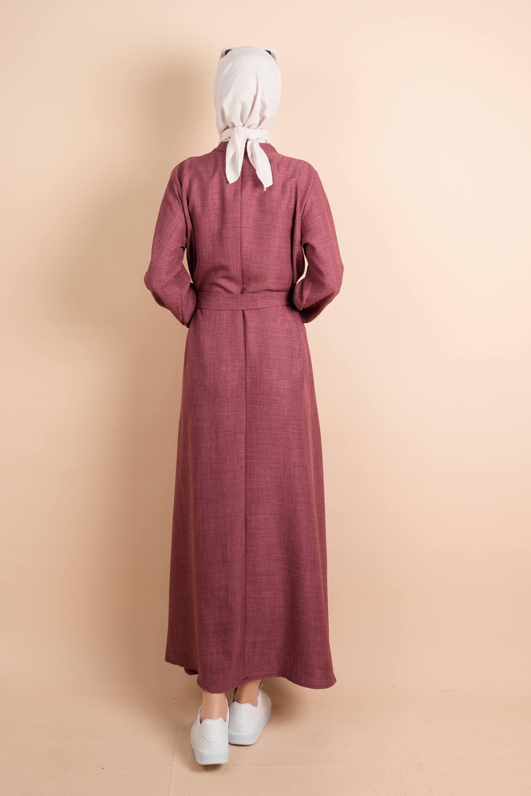 Keten Elbise Yarım Düğme İp Detaylı Gita Elbise Gül Kurusu