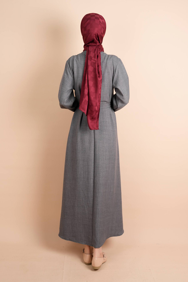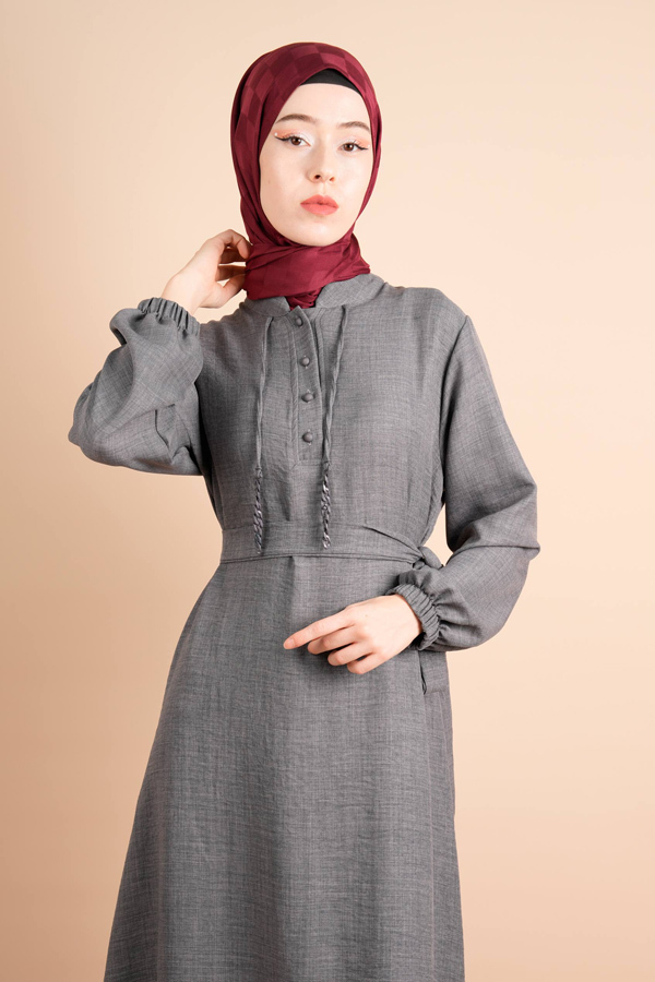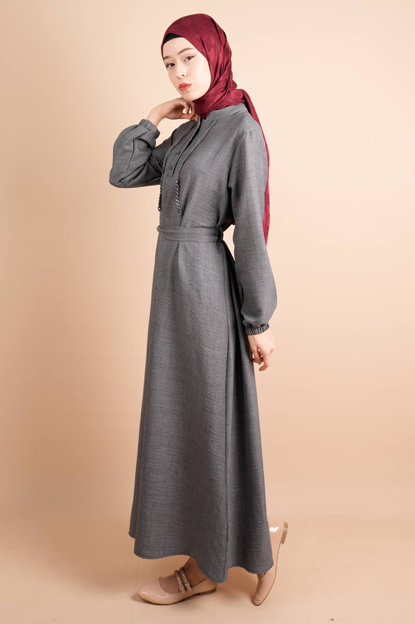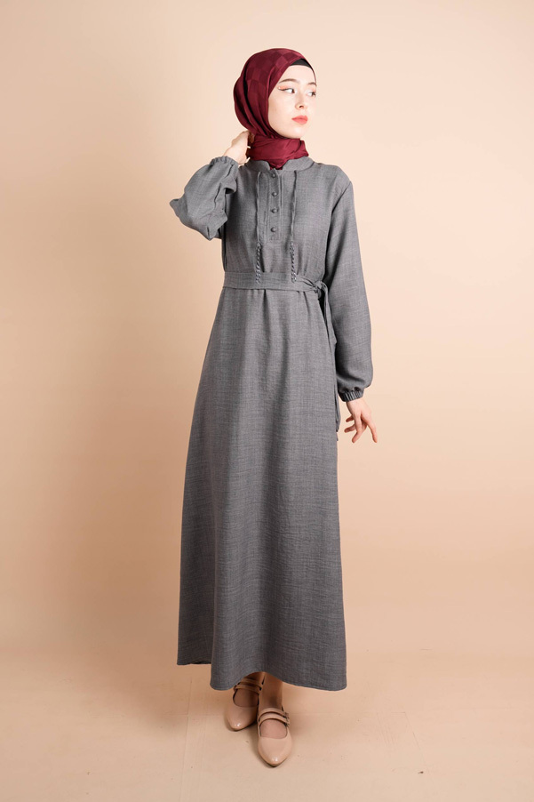 Keten Elbise Yarım Düğme İp Detaylı Gita Elbise Koyu Gri