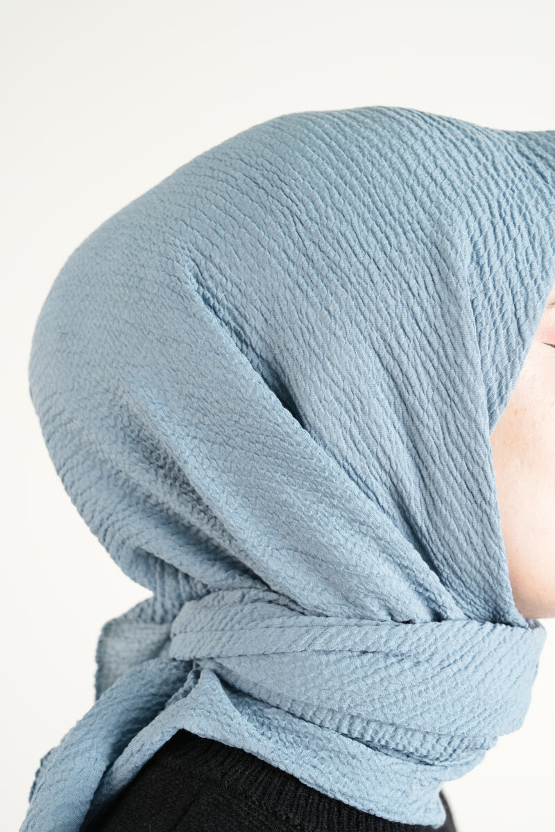 Ferahlatıcı açık mavi tonu ve hafif pamuklu dokusuyla dört mevsim kullanıma uygun, konforlu bir eşarp.