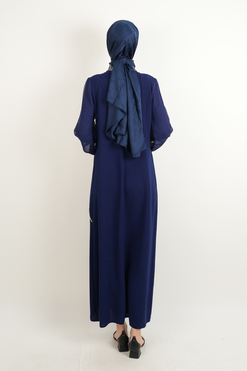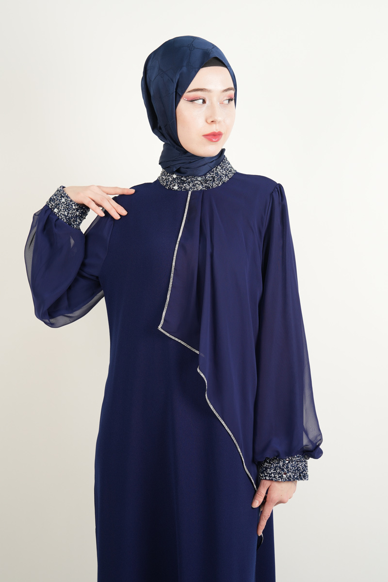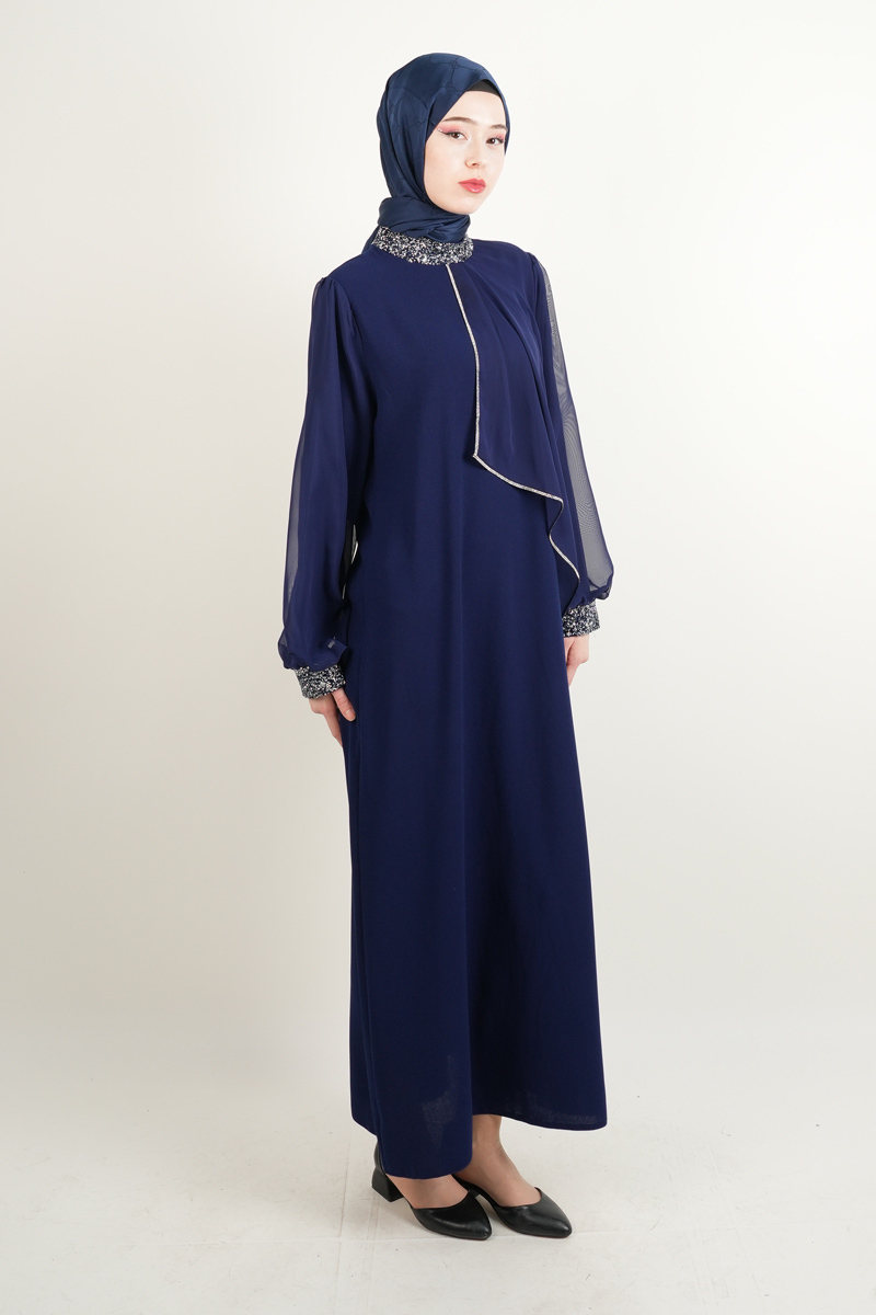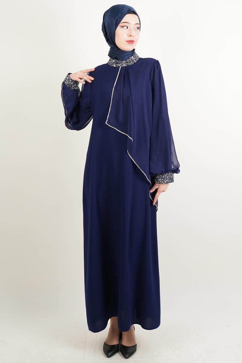 İç göstermez krep kumaştan üretilen lacivert tesettür abiye, taş işlemeleri ile şıklığınızı tamamlar. Nişan ve kapalı söz kıyafetlerinde yeni trend.