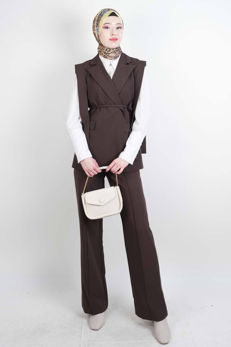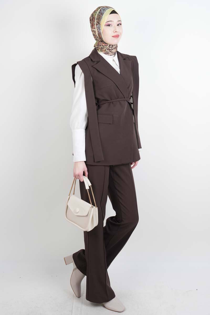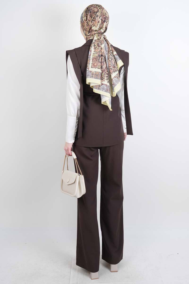 Tesettür Blazer Takım Omuz Tasarım Yelekli Blazer İkili Takım Kahverengi