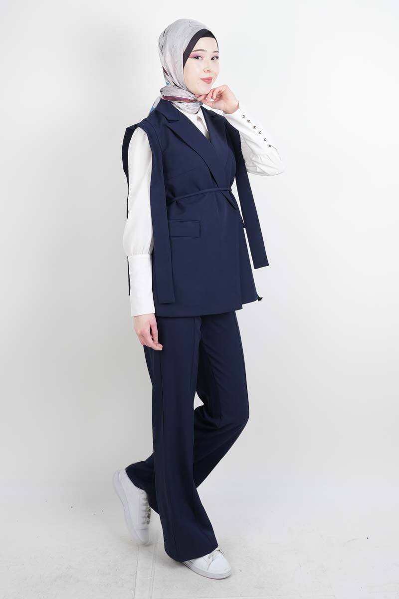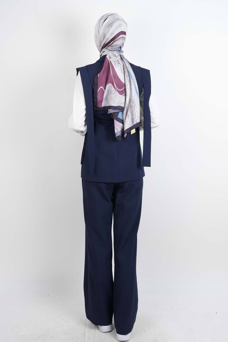 Tesettür Blazer Takım Omuz Tasarım Yelekli Blazer İkili Takım Lacivert