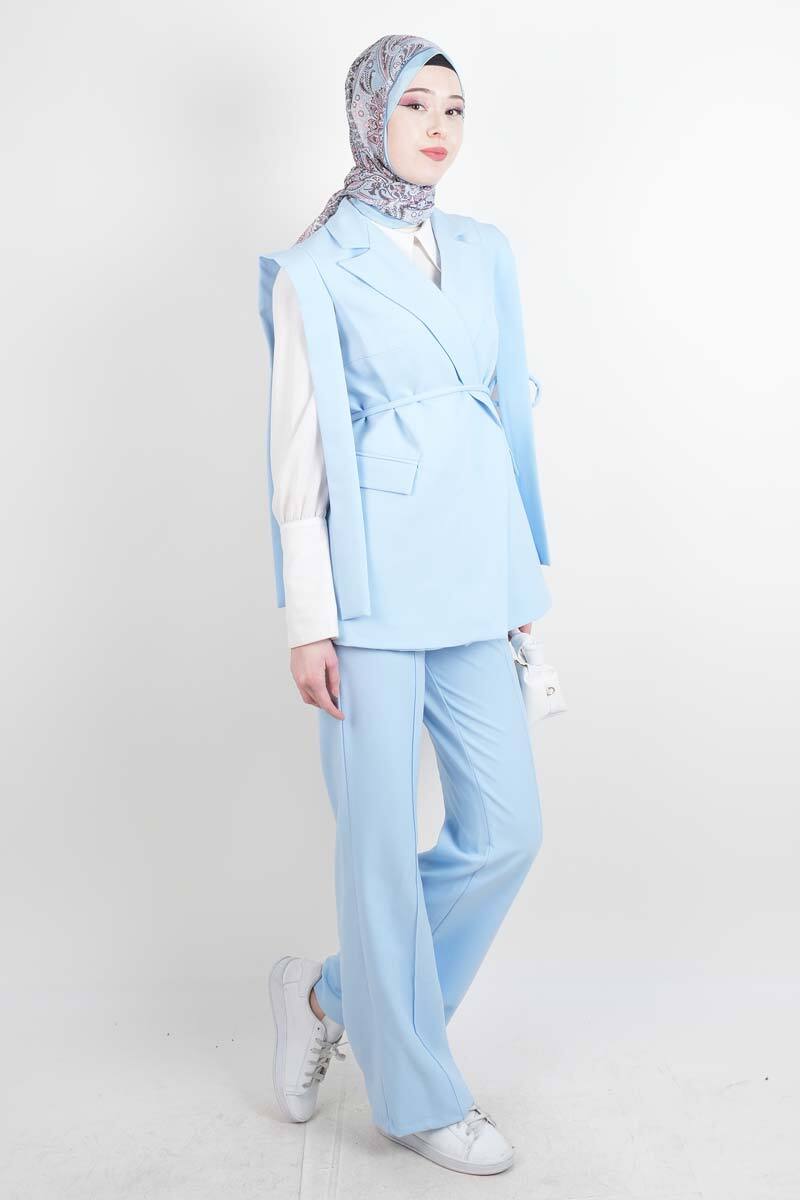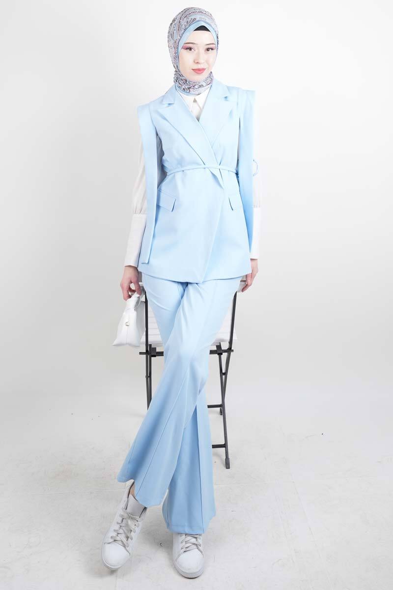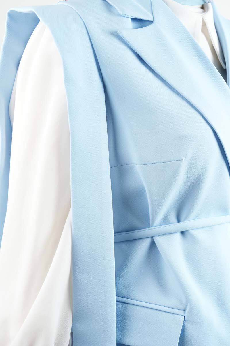 Tesettür Blazer Takım Omuz Tasarım Yelekli Blazer İkili Takım Mavi