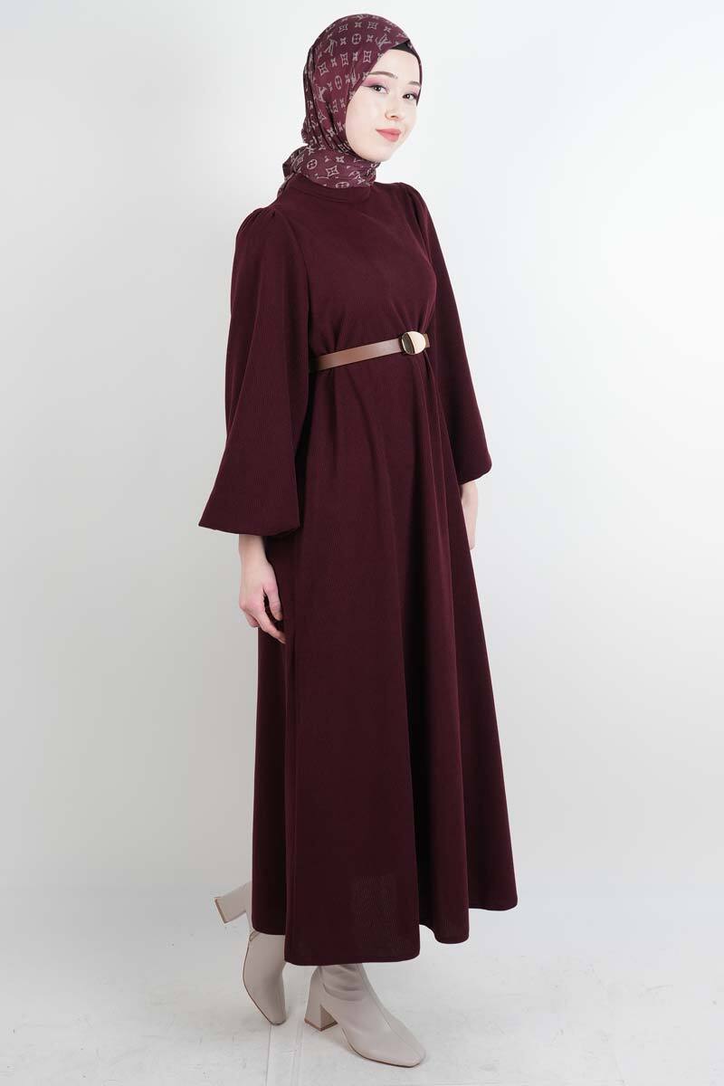 Tesettür Elbise Balon Kol Kemerli Selanik Elbise Bordo