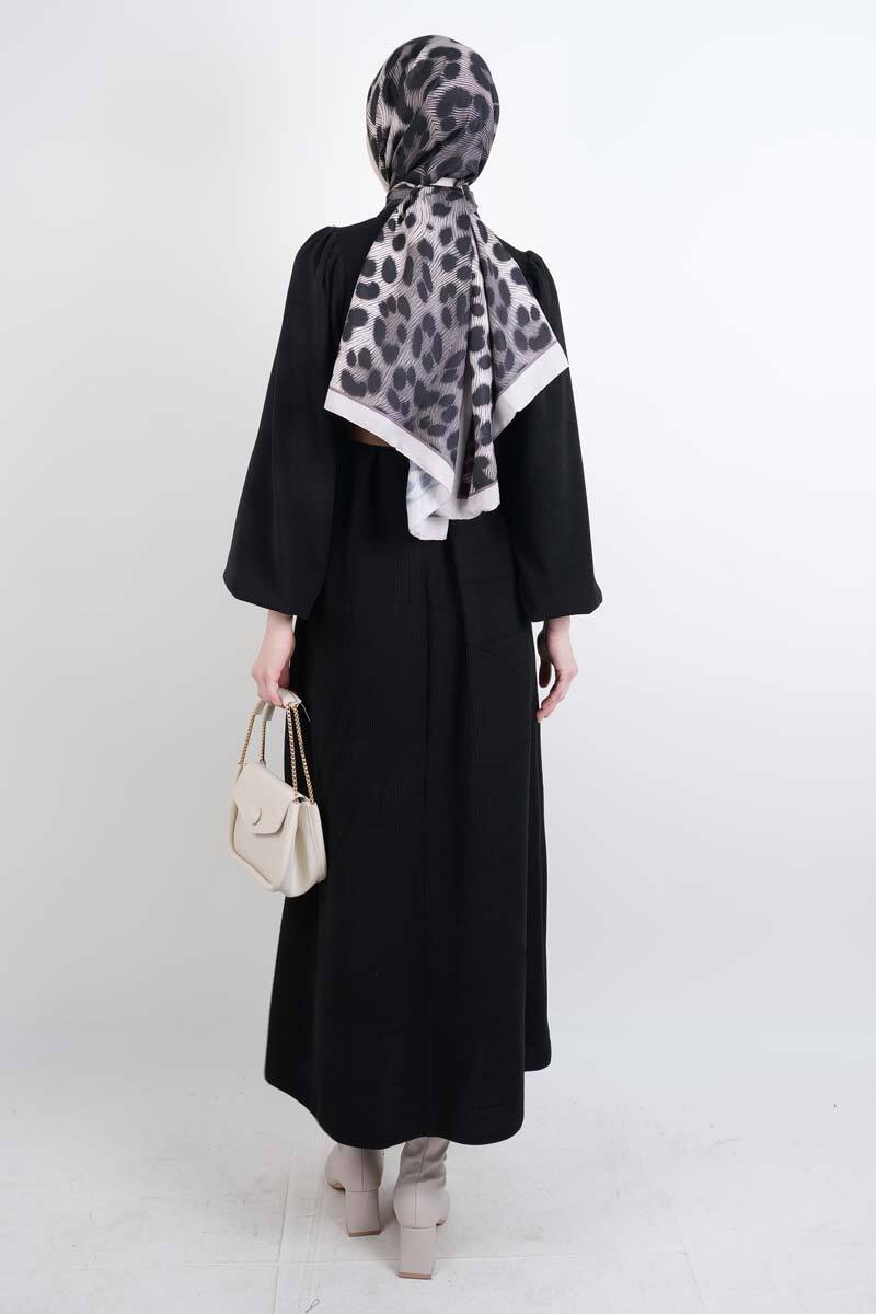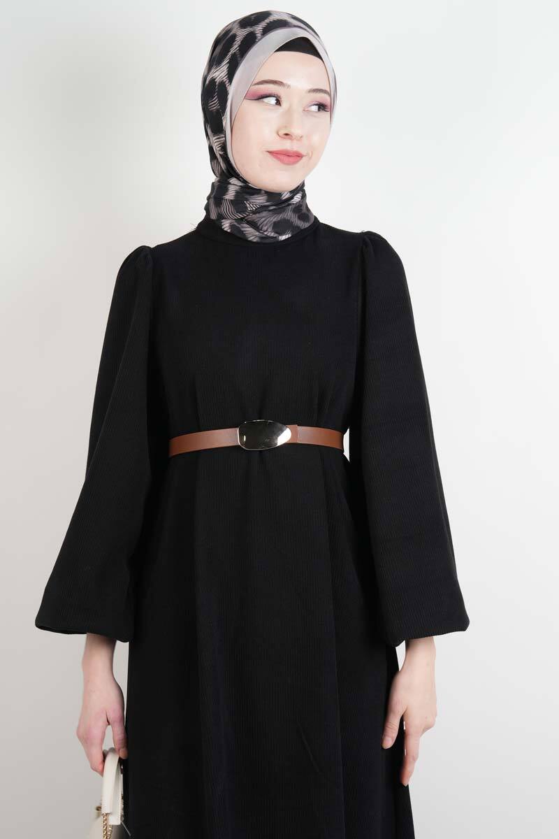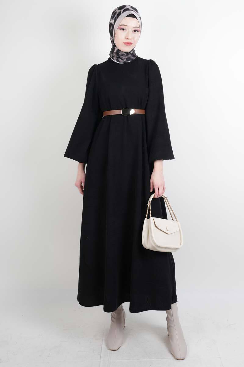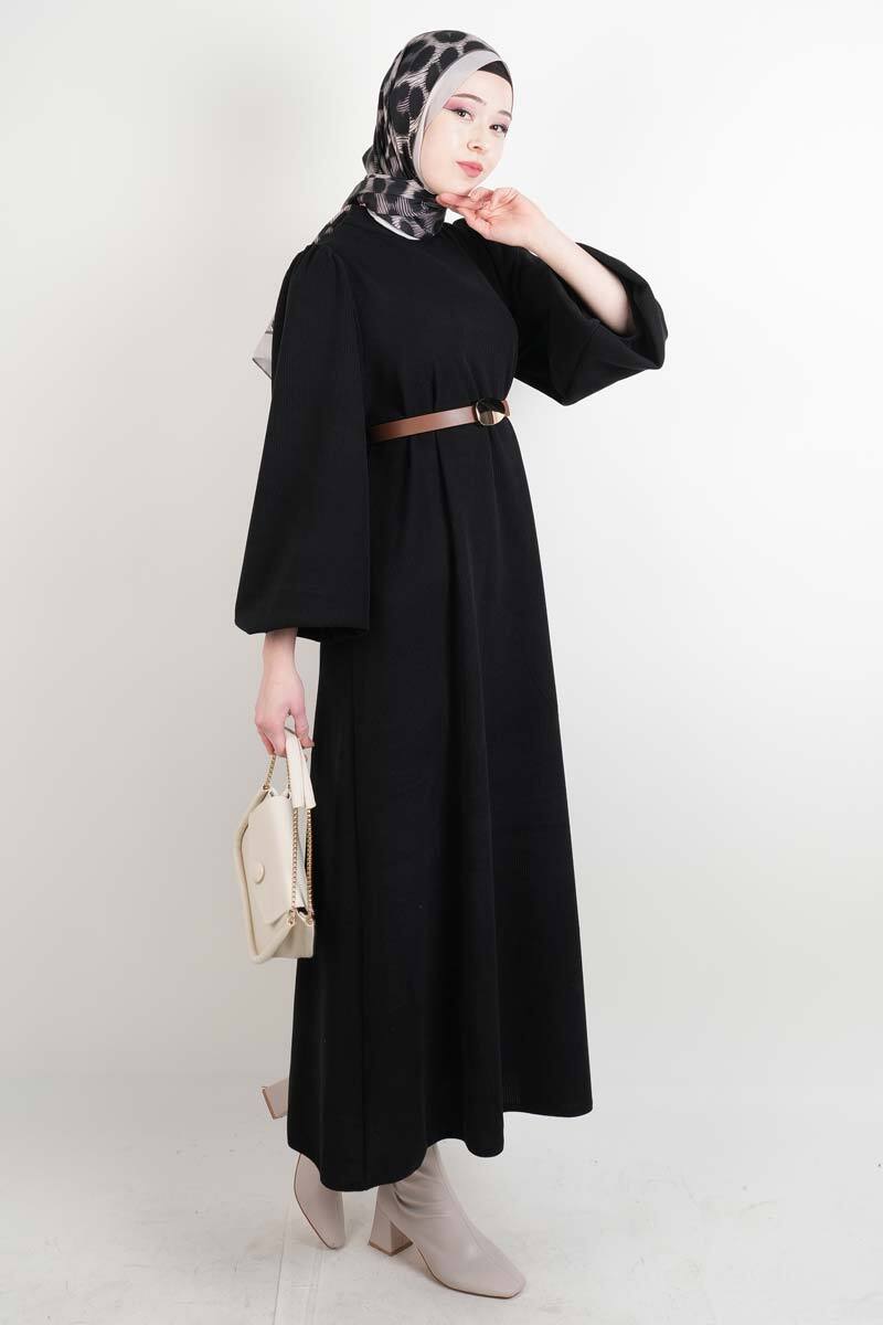 Tesettür Elbise Balon Kol Kemerli Selanik Elbise Siyah