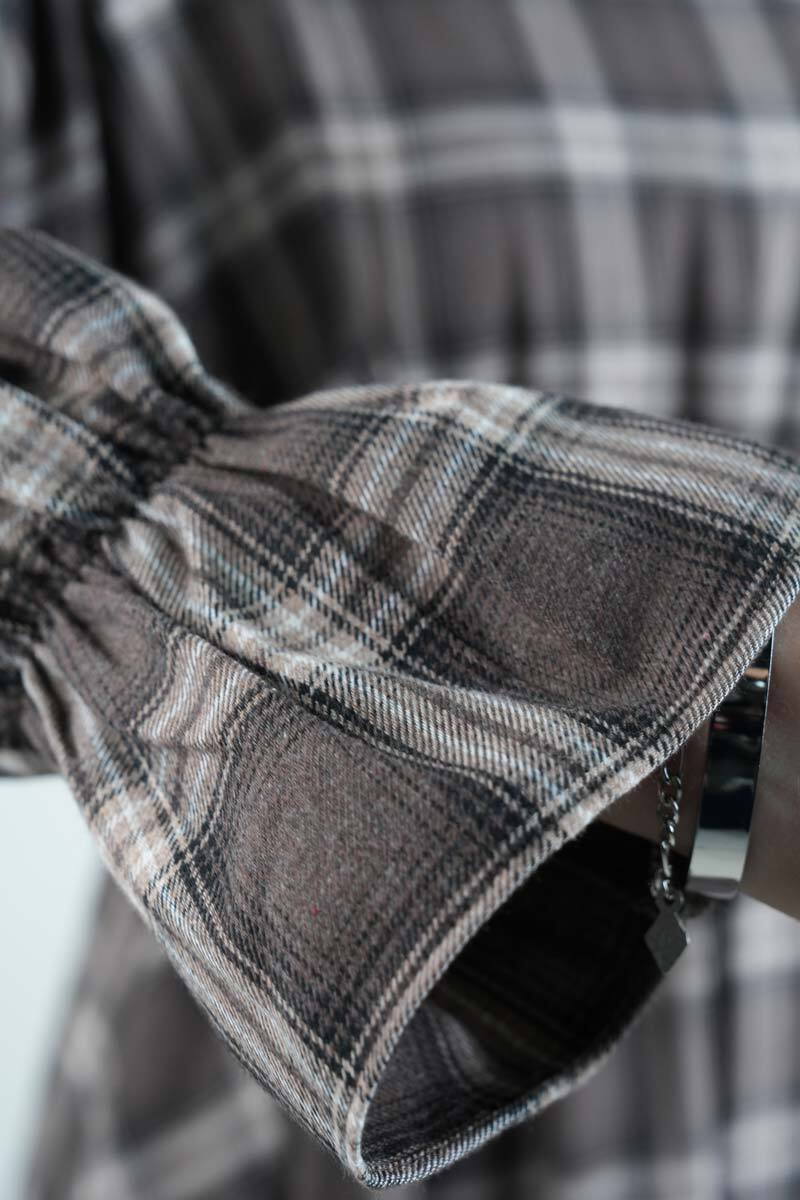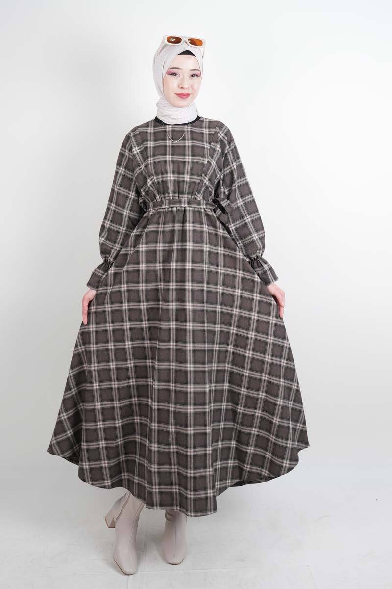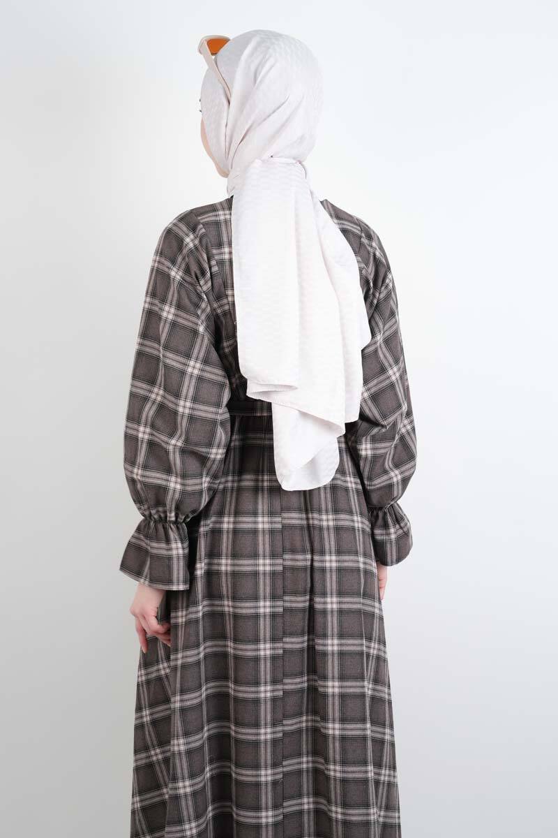 Tesettür Elbise Bel Lastikli Fırfır Kol Ekose Elbise Kahverengi