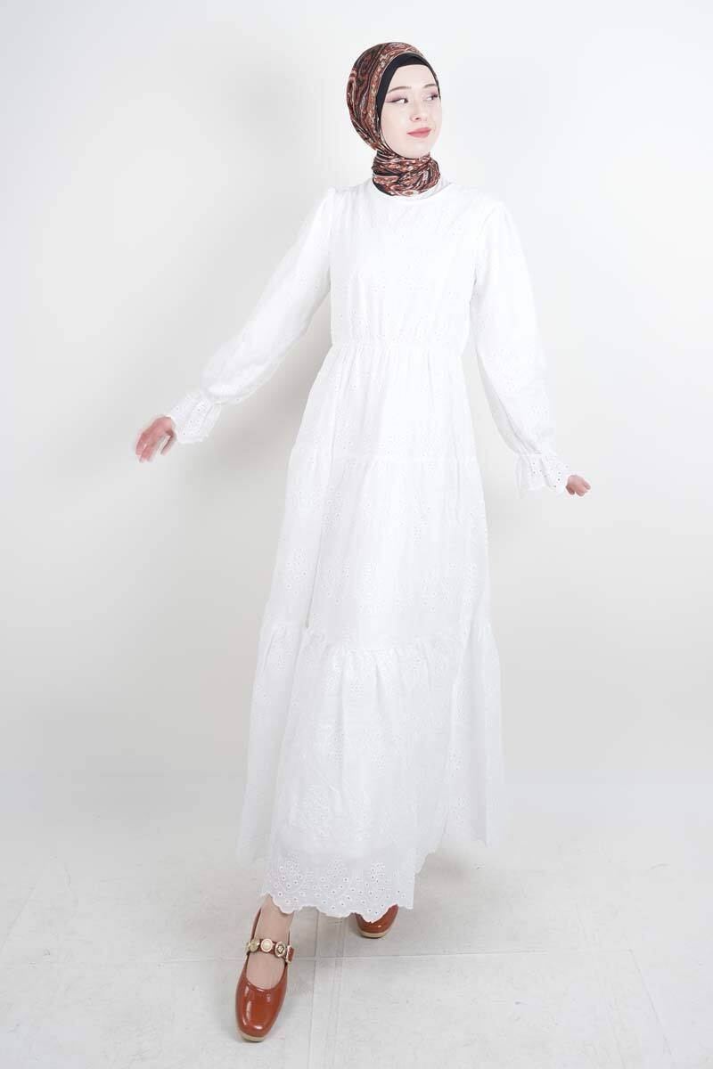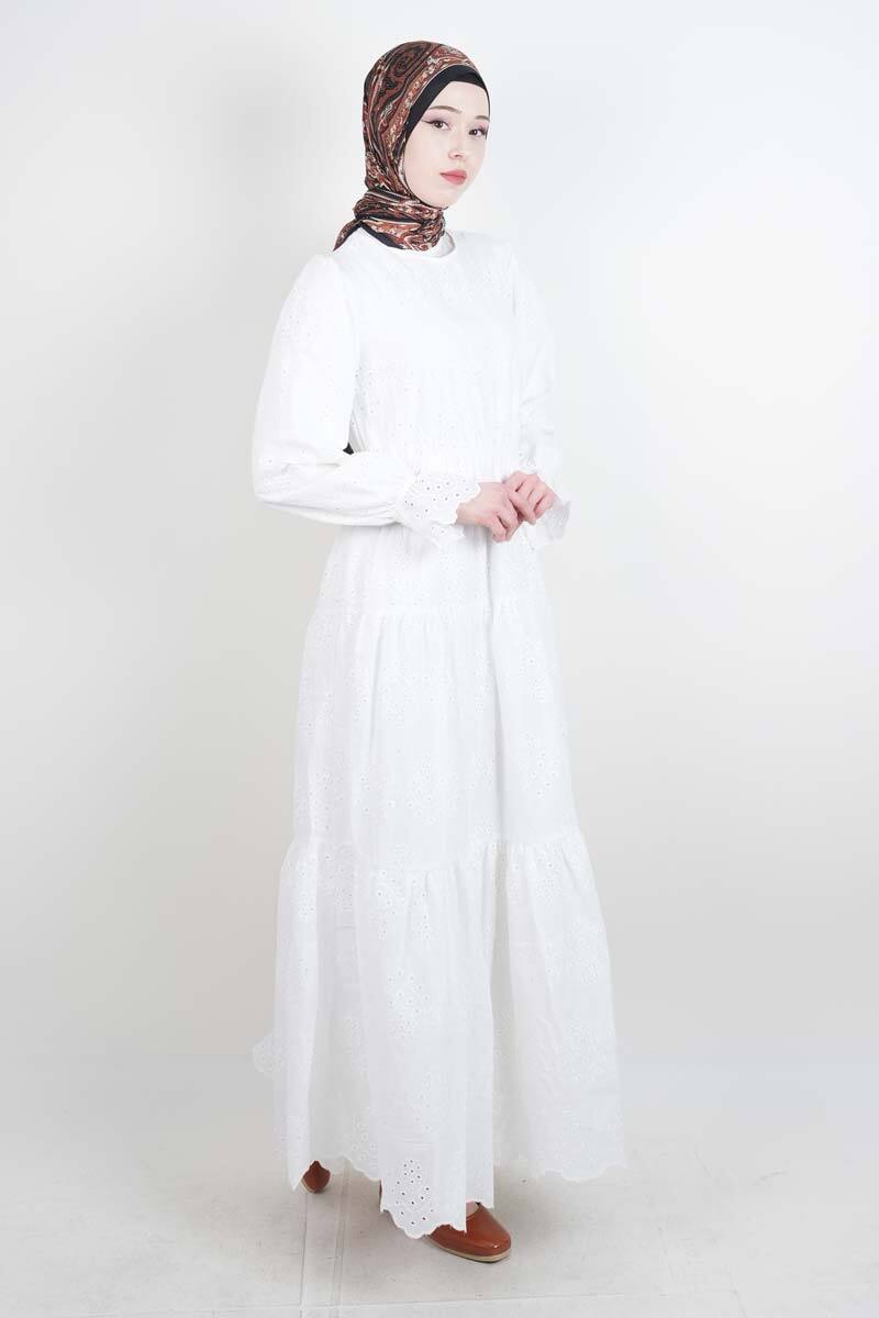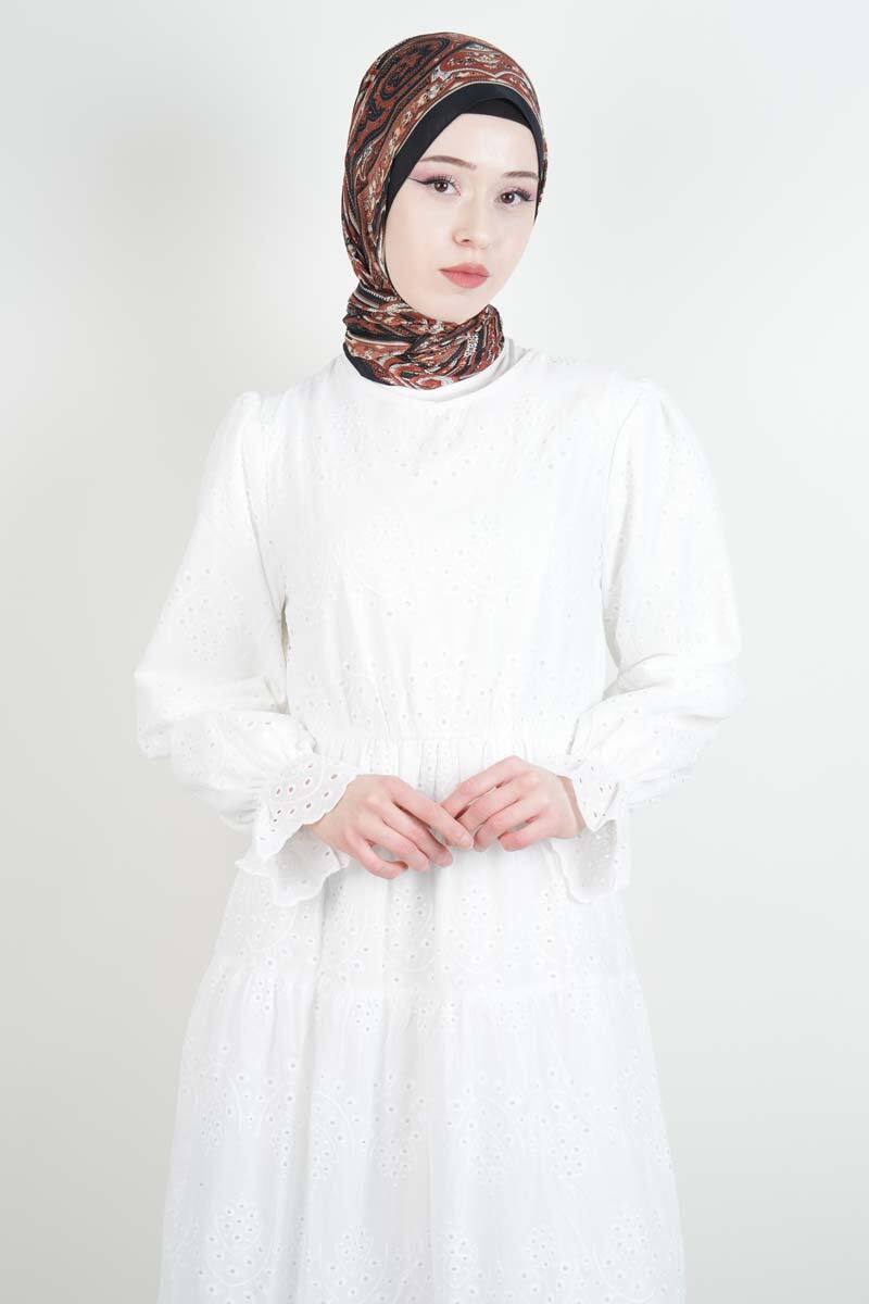 Tesettür Elbise Bel Lastikli Kol Fırfırlı Fisto Elbise Beyaz
