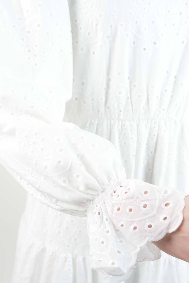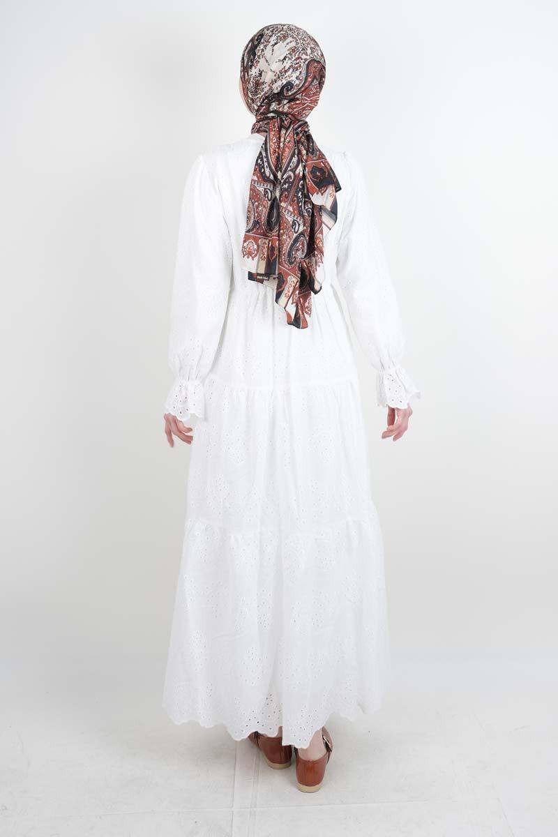 Tesettür Elbise Yarım Düğmeli Kol Fırfırlı Prenses Elbise Beyaz