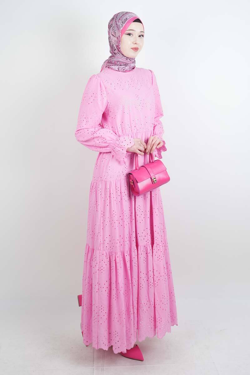 Tesettür Elbise Bel Lastikli Kol Fırfırlı Fisto Elbise Pembe