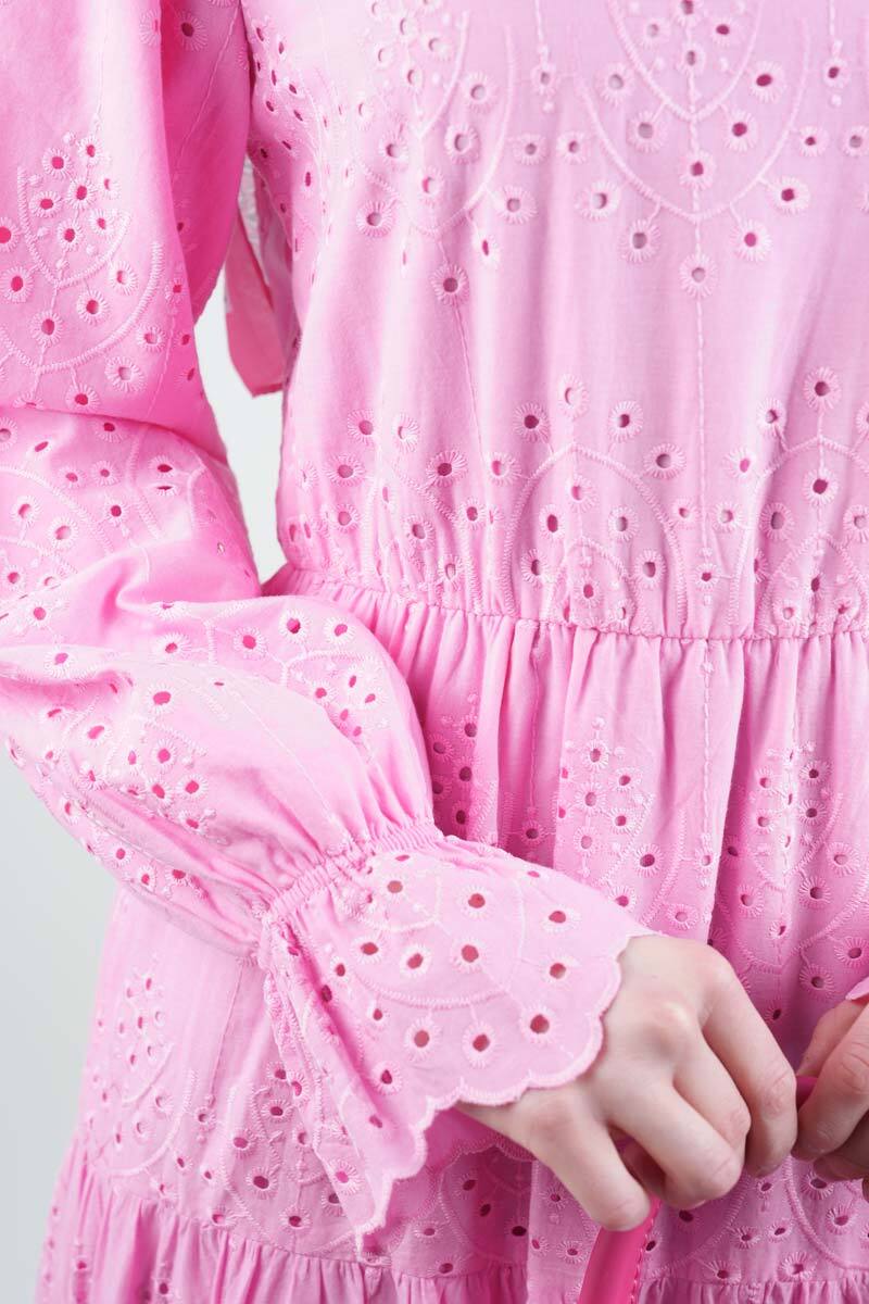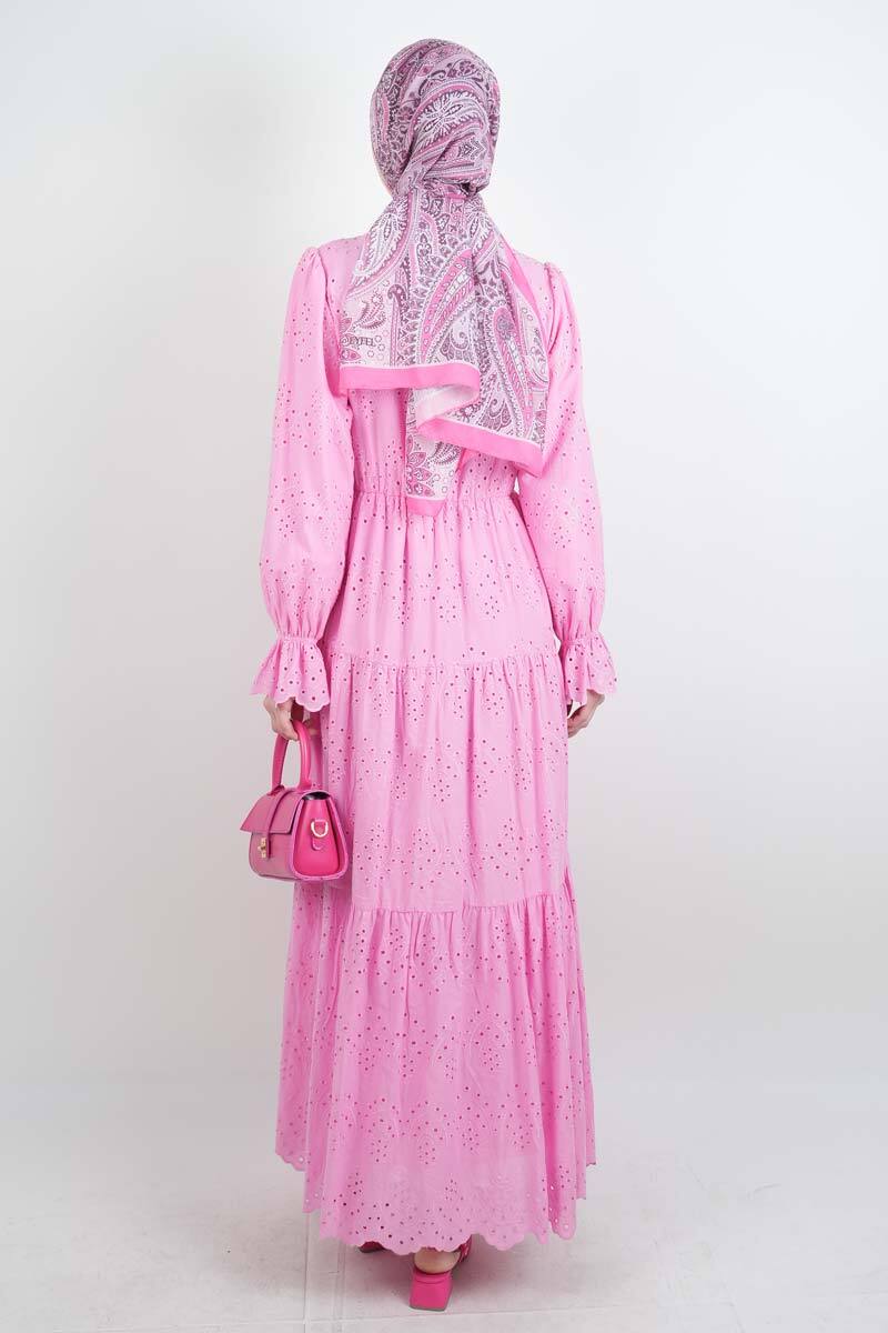 Tesettür Elbise Yarım Düğmeli Kol Fırfırlı Prenses Elbise Pembe