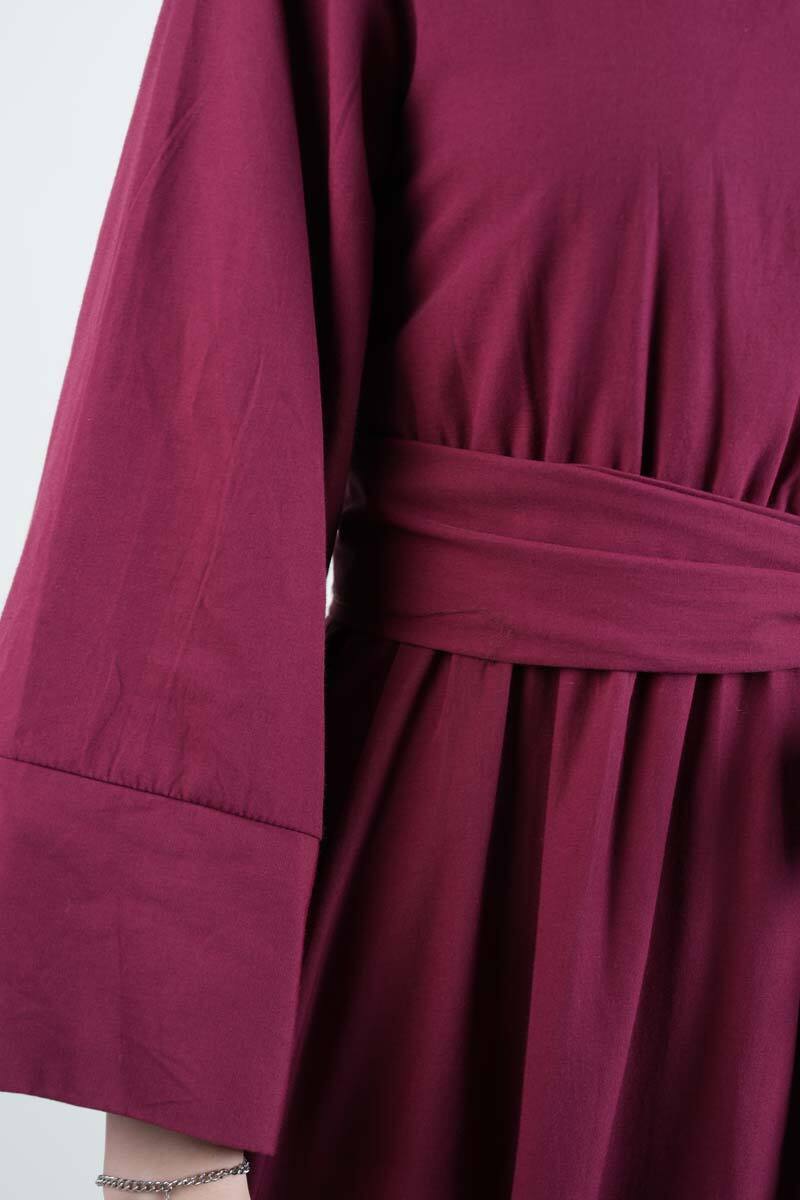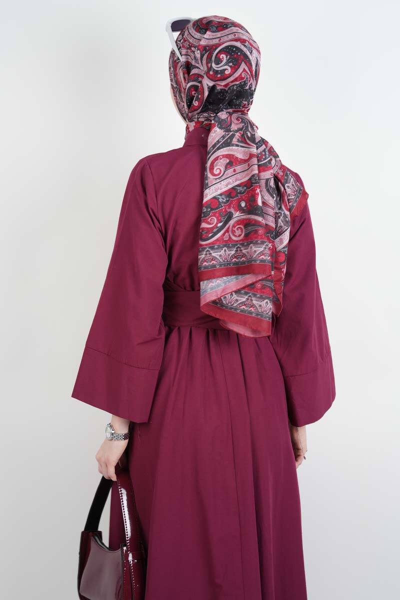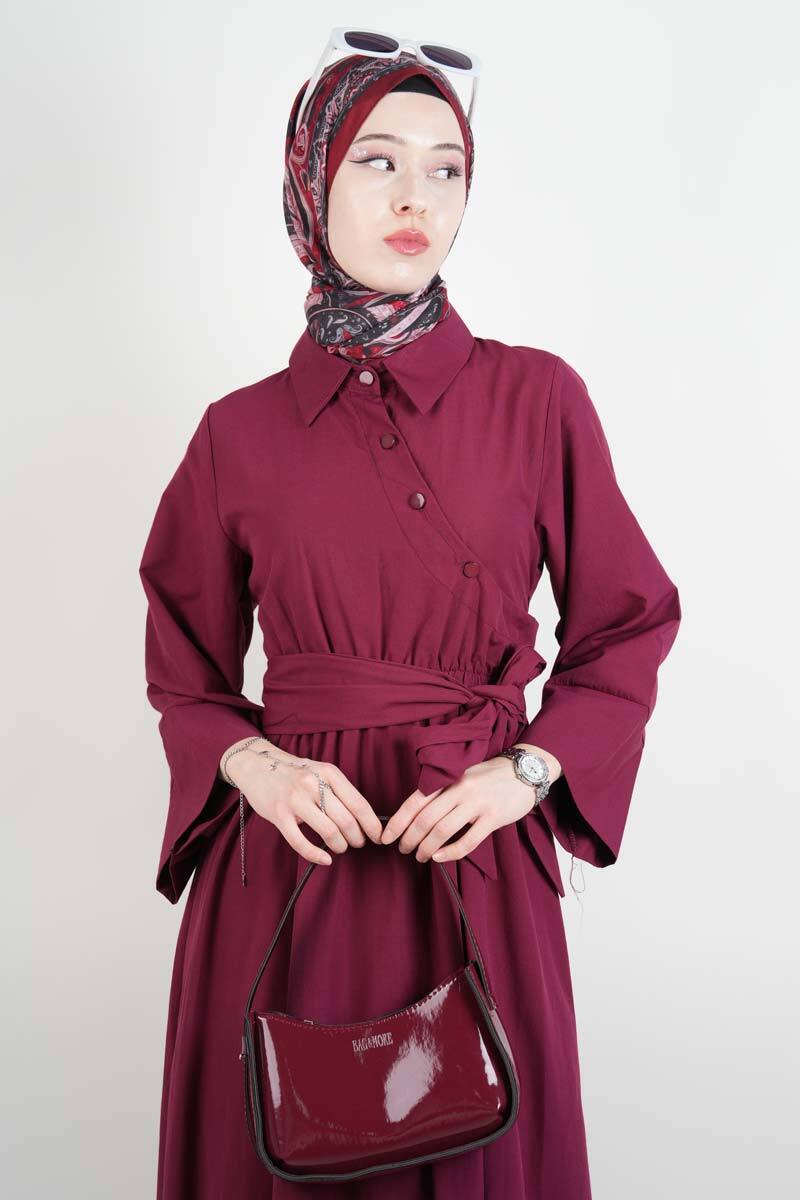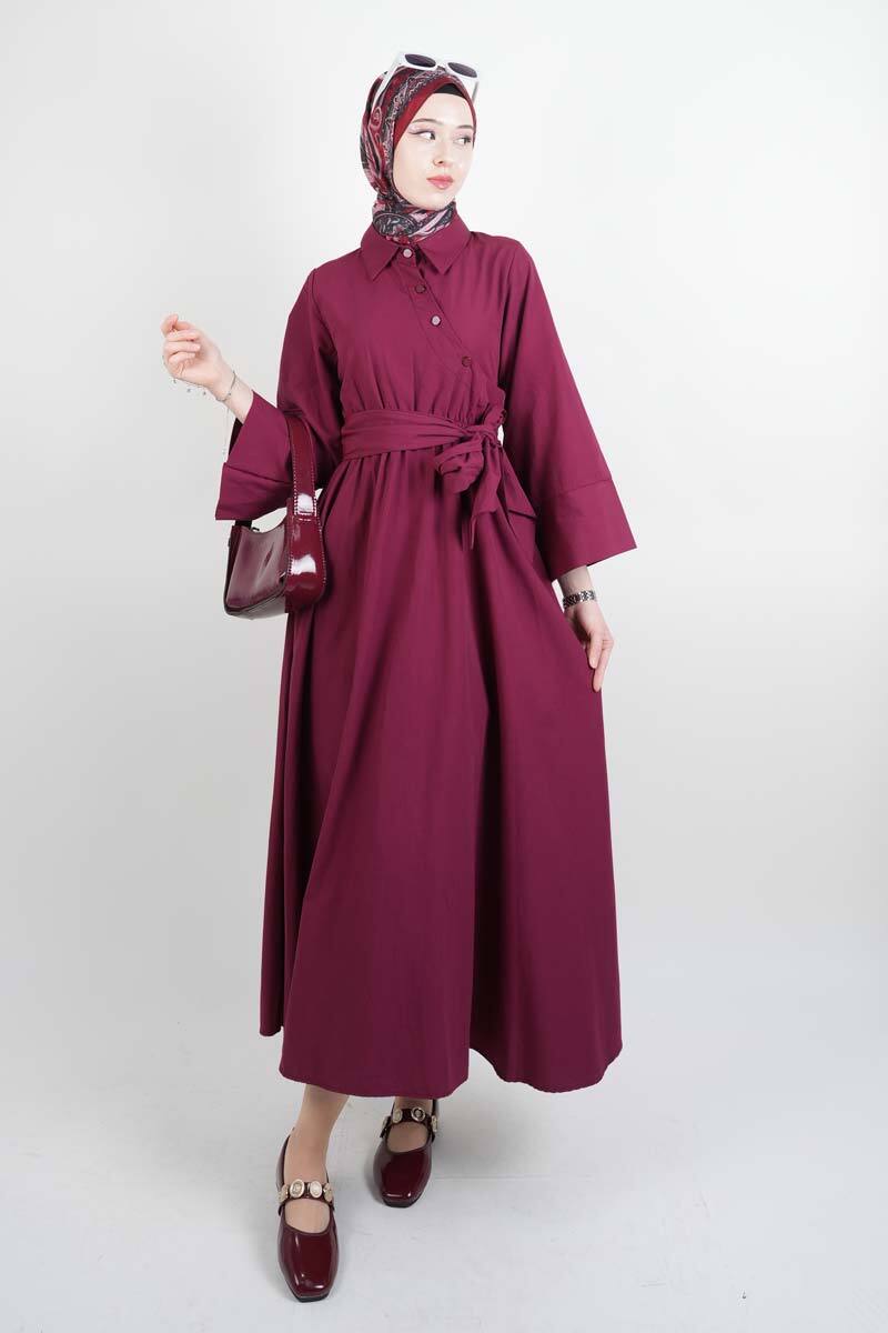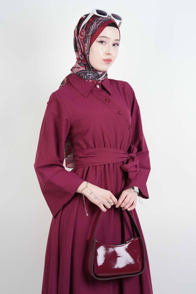Tesettür Elbise Çapraz Düğmeli Dolama Kuşaklı Poplin Elbise Bordo