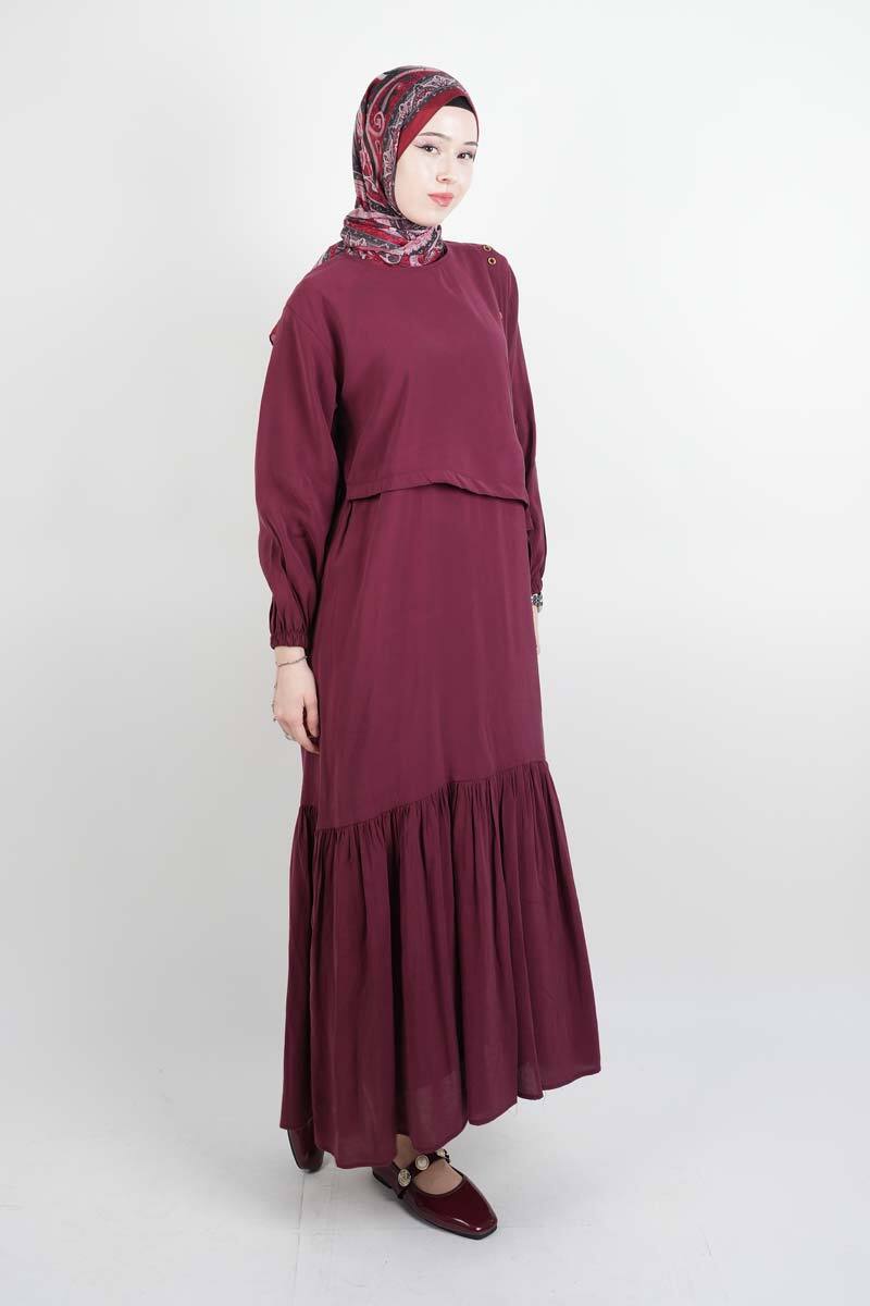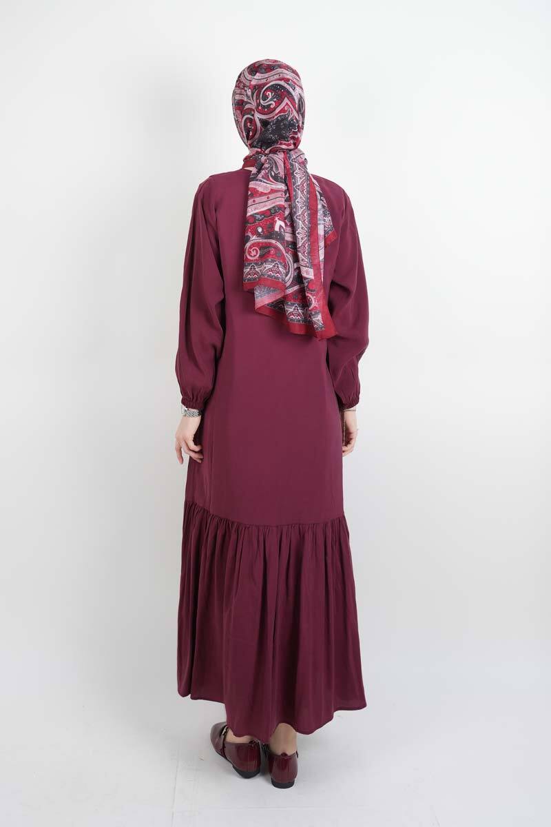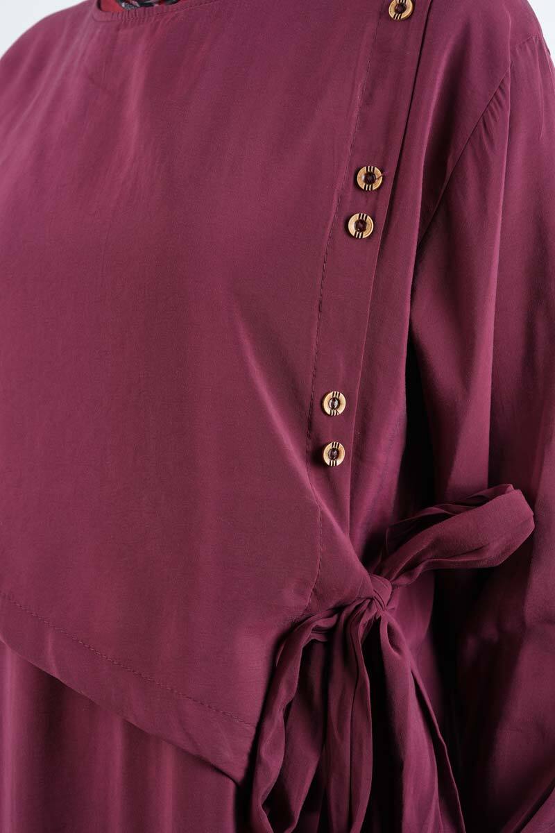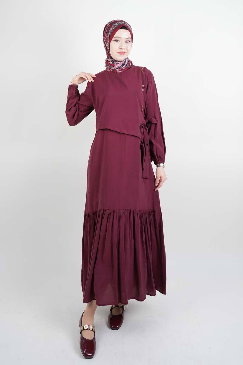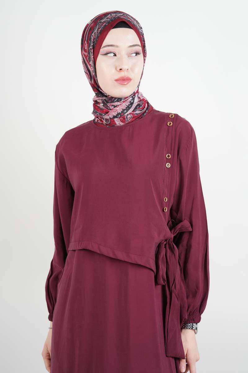 Tesettür Elbise Çift Düğme Detaylı Yandan Bağlamalı Modal Elbise Bordo