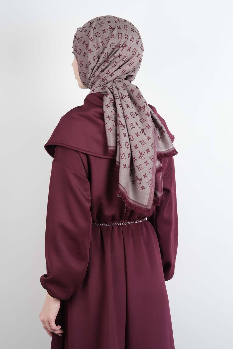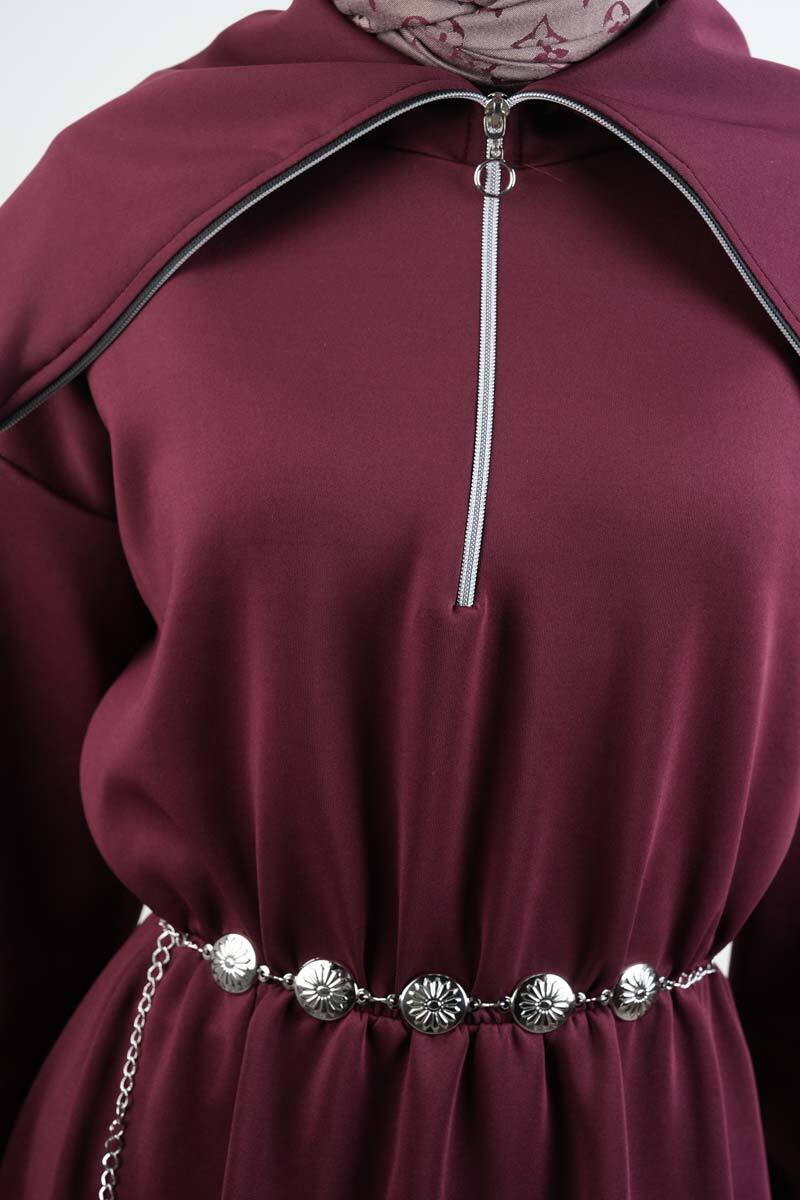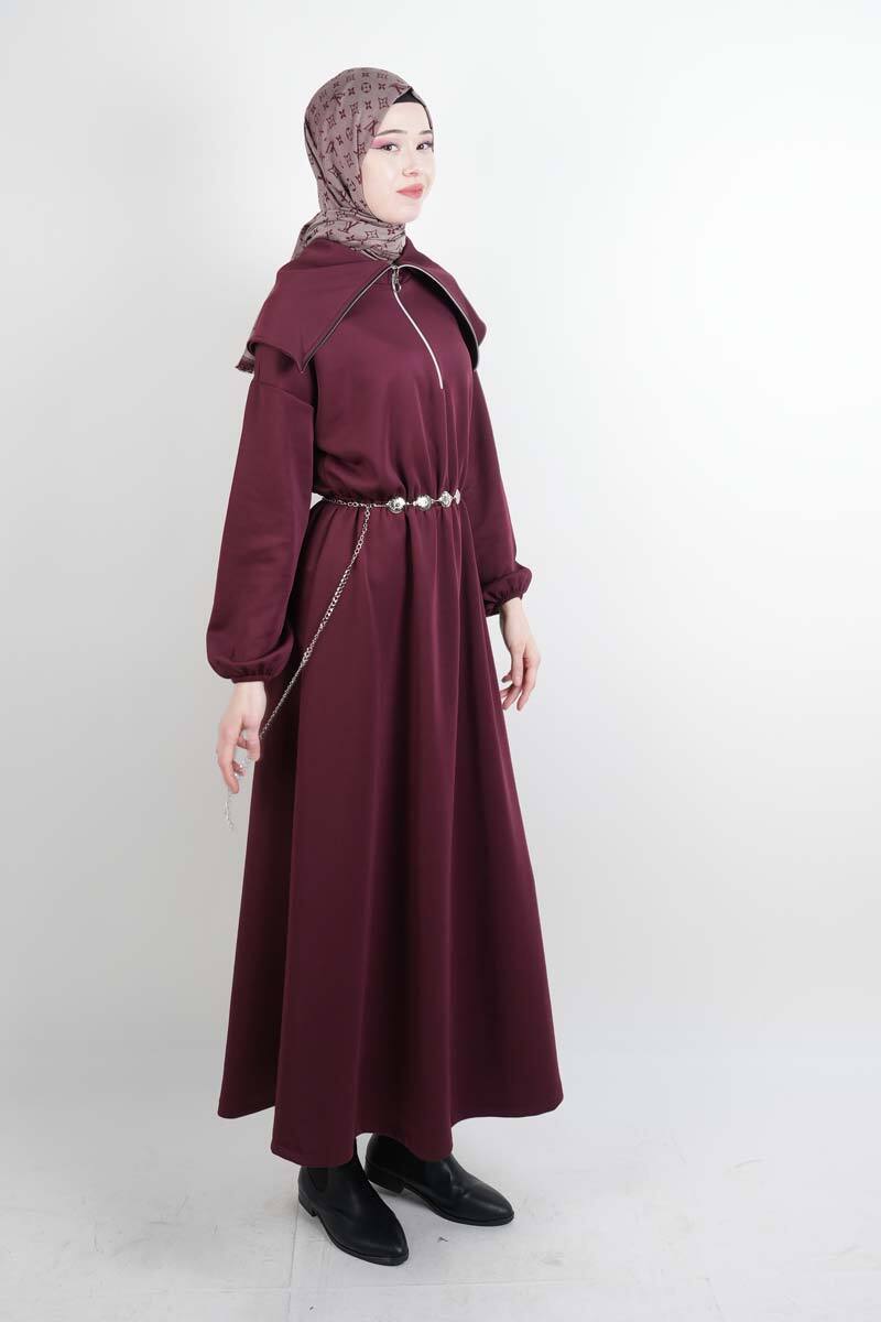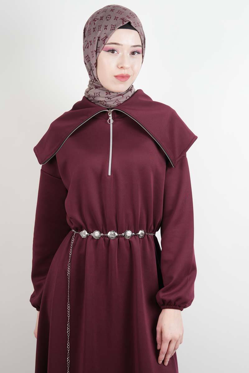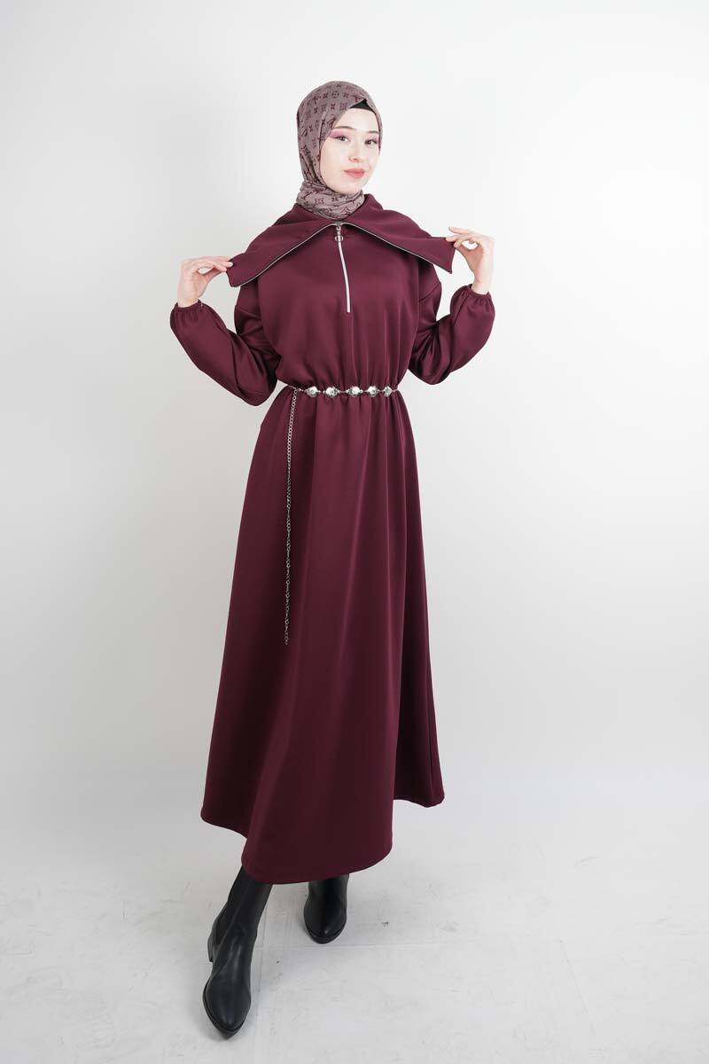 Tesettür Elbise Geniş Fermuar Yakalı Bel Lastikli Scuba Elbise Bordo