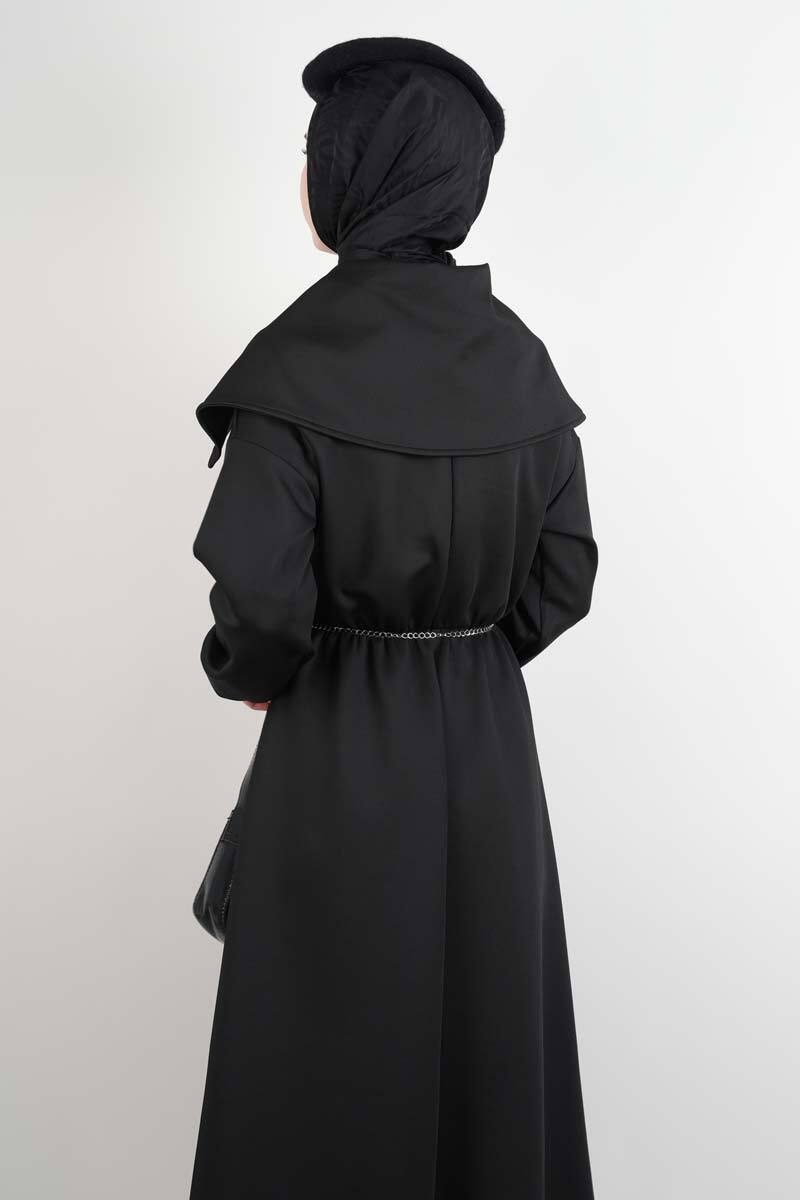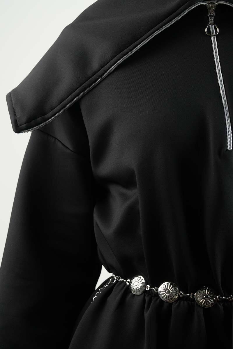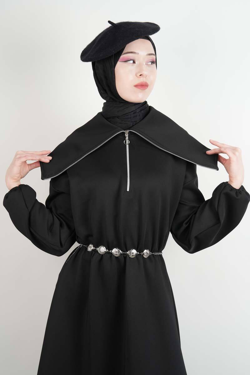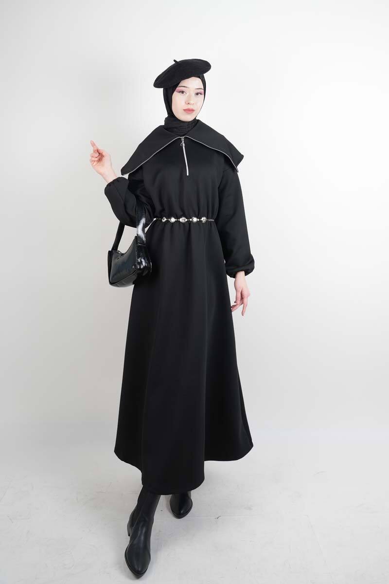 Tesettür Elbise Geniş Fermuar Yakalı Bel Lastikli Scuba Elbise Siyah