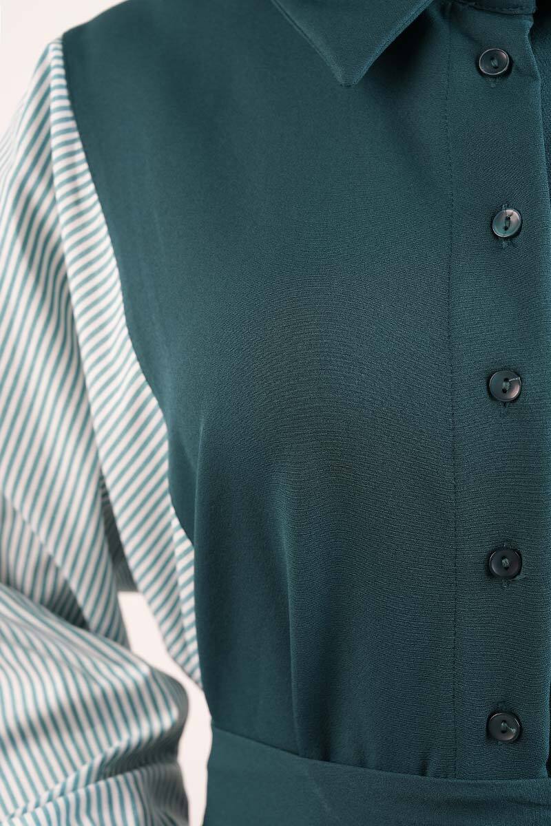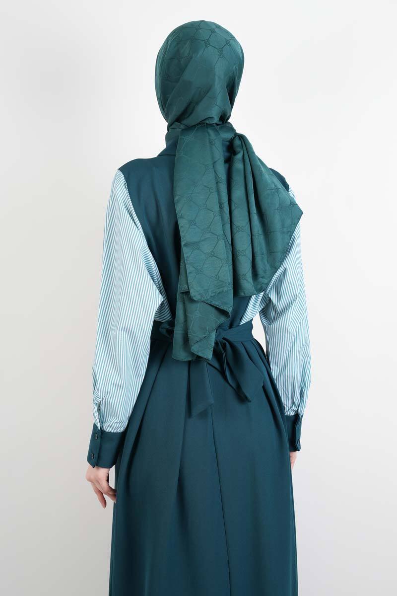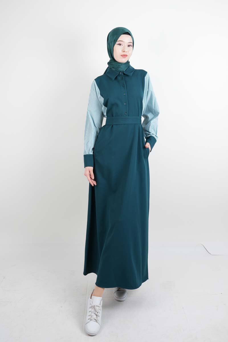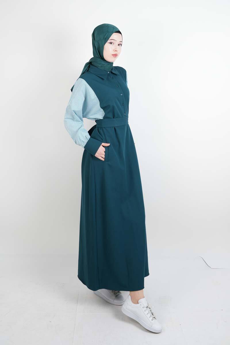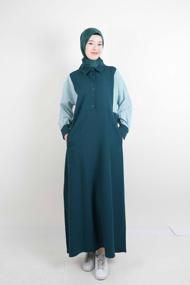 Kolu gömlek detaylı, cepli ve rahat kalıp tesettür elbise; günlük şıklık ve konforu bir arada sunar. Hafif yapısı ve kullanışlı cepleriyle gün boyu rahat hareket etmenizi sağlar. Günlük kullanım ve iş ortamı için ideal, sade ve modern bir tercih.