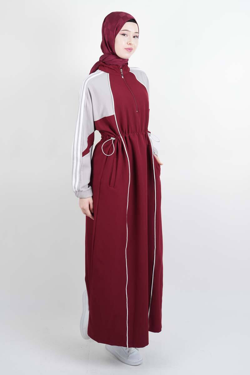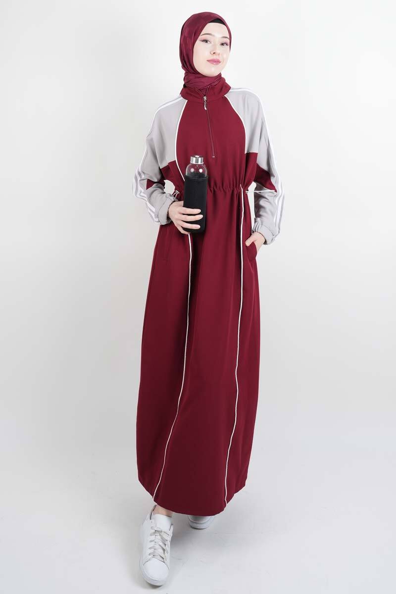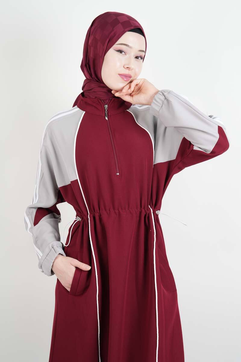 Tesettür Elbise Kol Ön Biye Deteylı Double Krep Elbise Bordo